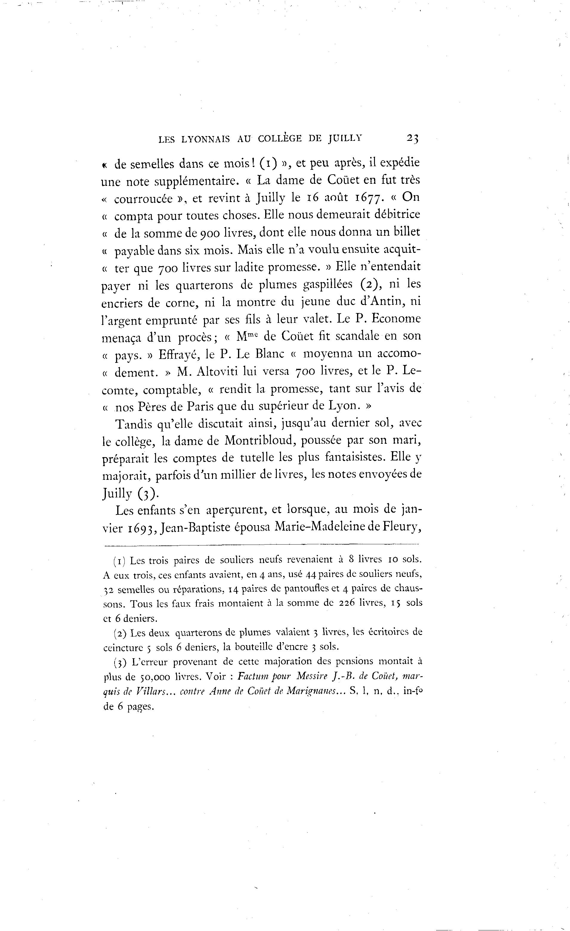 LES LYONNAIS AU COLLEGE DE JUILLY 23 « de semelles dans ee mois! ( i ) », et peu après, il expédie une note supplémentaire. « La dame de Coùet en fut très « courroucée », et revint à Juilly le ié août 1677. « On « compta pour toutes choses. Elle nous demeurait débitrice « de la somme de 900 livres, dont elle nous donna un billet « payable dans six mois. Mais elle n'a voulu ensuite acquit- c ter que 700 livres sur ladite promesse. » Elle n'entendait e payer ni les quarterons de plumes gaspillées (2), ni les encriers de corne, ni la montre du jeune duc d'Antin, ni l'argent emprunté par ses fils à leur valet. Le P. Econome menaça d'un procès; « Mmc de Couet fit scandale en son « pays. » Effrayé, le P. Le Blanc « moyenna un accomo- « dément. » M. Altoviti lui versa 700 livres, et le P. Le- comte, comptable, « rendit la promesse, tant sur l'avis de « nos Pères de Paris que du supérieur de Lyon. » Tandis qu'elle discutait ainsi, jusqu'au dernier sol, avec le collège, la dame de Montribloud, poussée par son mari, préparait les comptes de tutelle les plus fantaisistes. Elle y majorait, parfois d'un millier de livres, les notes envoyées de Juilly (3). Les enfants s'en aperçurent, et lorsque, au mois de jan- vier 1693, Jean-Baptiste épousa Marie-Madeleine de Fleury, (1) Les trois paires de souliers neufs revenaient à 8 livres 10 sols. A eux trois, ces enfants avaient, en 4 ans, usé 44 paires de souliers neufs, 32 semelles ou réparations, 14 paires de pantoufles et 4 paires de chaus- sons. Tous les faux frais montaient à la somme de 226 livres, 15 sols et 6 deniers. (2) Les deux quarterons de plumes valaient 3 livres, les écritoires de ceincture 5 sols 6 deniers, la bouteille d'encre 3 sols. (3) L'erreur provenant de cette majoration des pensions montait à plus de 50,000 livres. Voir : Factum pour Messire J.-B. de Coùet, mar- quis de Villars... contre Anne de Couet de Marignanes... S, 1, n, d.. in-f° de 6 pages.
