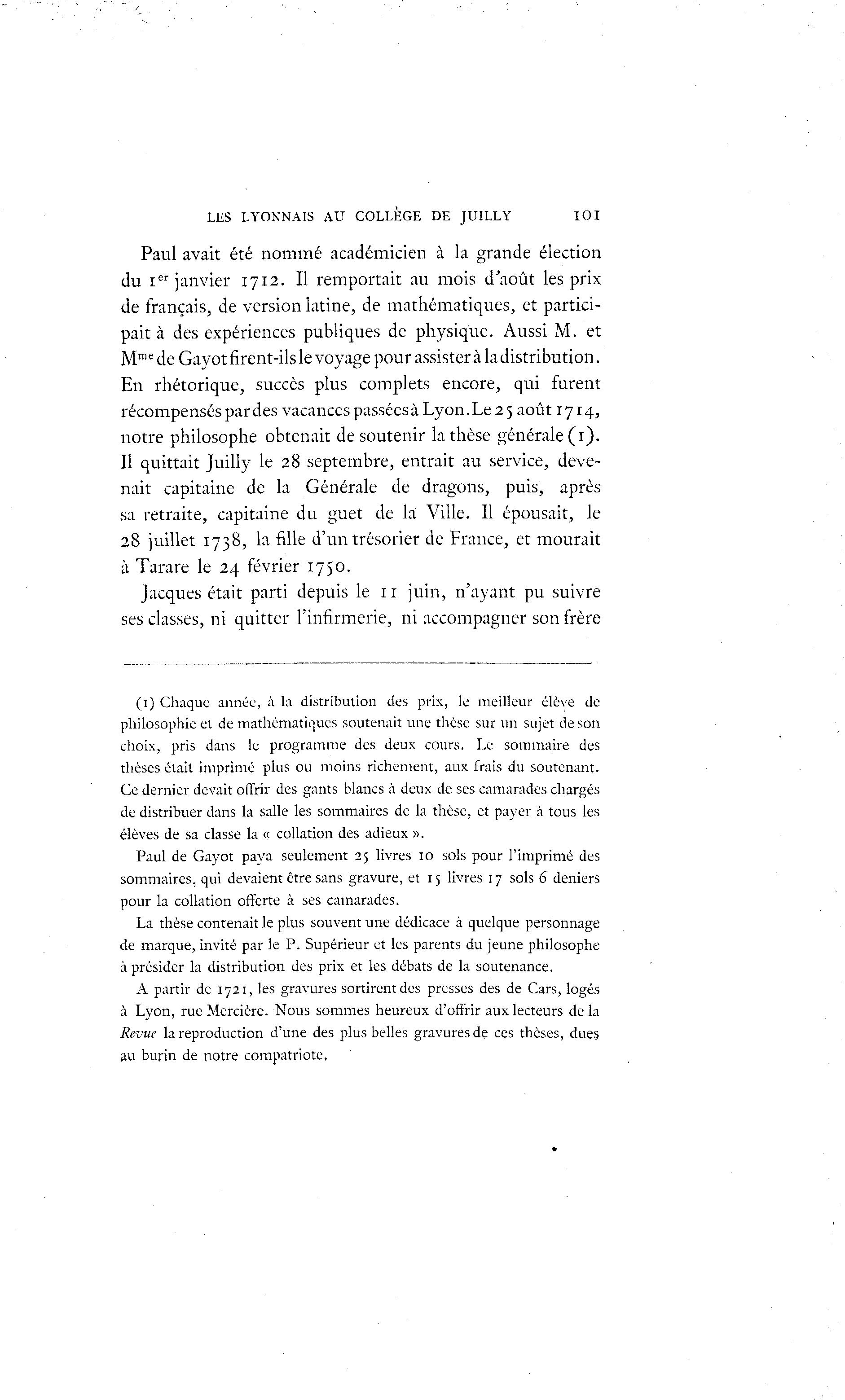 LES LYONNAIS AU COLLEGE DE JUILLY 101 Paul avait été nommé académicien à la grande élection du I er janvier 1712. Il remportait au mois d'août les prix de français, de version latine, de mathématiques, et partici- pait à des expériences publiques de physique. Aussi M. et Mme de Gayot firent-ils le voyage pour assister à la distribution. En rhétorique, succès plus complets encore, qui furent récompensés par des vacances passées à Lyon. Le 25 août 1714, notre philosophe obtenait de soutenir la thèse générale (1). Il quittait Juilly le 28 septembre, entrait au service, deve- nait capitaine de la Générale de dragons, puis, après sa retraite, capitaine du guet de la Ville. Il épousait, le 28 juillet 1738, la fille d'un trésorier de France, et mourait à Tarare le 24 février 1750. Jacques était parti depuis le 11 juin, n'ayant pu suivre ses classes, ni quitter l'infirmerie, ni accompagner son frère (1) Chaque année, à la distribution des prix, le meilleur élève de philosophie et de mathématiques soutenait une thèse sur un sujet de son choix, pris dans le programme des deux cours. Le sommaire des thèses était imprimé plus ou moins richement, aux frais du soutenant. Ce dernier devait offrir des gants blancs à deux de ses camarades chargés de distribuer dans la salle les sommaires de la thèse, et payer à tous les élèves de sa classe la « collation des adieux ». Paul de Gayot paya seulement 25 livres 10 sols pour l'imprimé des sommaires, qui devaient être sans gravure, et 15 livres 17 sols 6 deniers pour la collation offerte à ses camarades. La thèse contenait le plus souvent une dédicace à quelque personnage de marque, invité par le P. Supérieur et les parents du jeune philosophe à présider la distribution des prix et les débats de la soutenance. A partir de 1721, les gravures sortirent des presses des de Cars, logés à Lyon, rue Mercière. Nous sommes heureux d'offrir aux lecteurs de la Revue la reproduction d'une des plus belles gravures de ces thèses, dues au burin de notre compatriote.