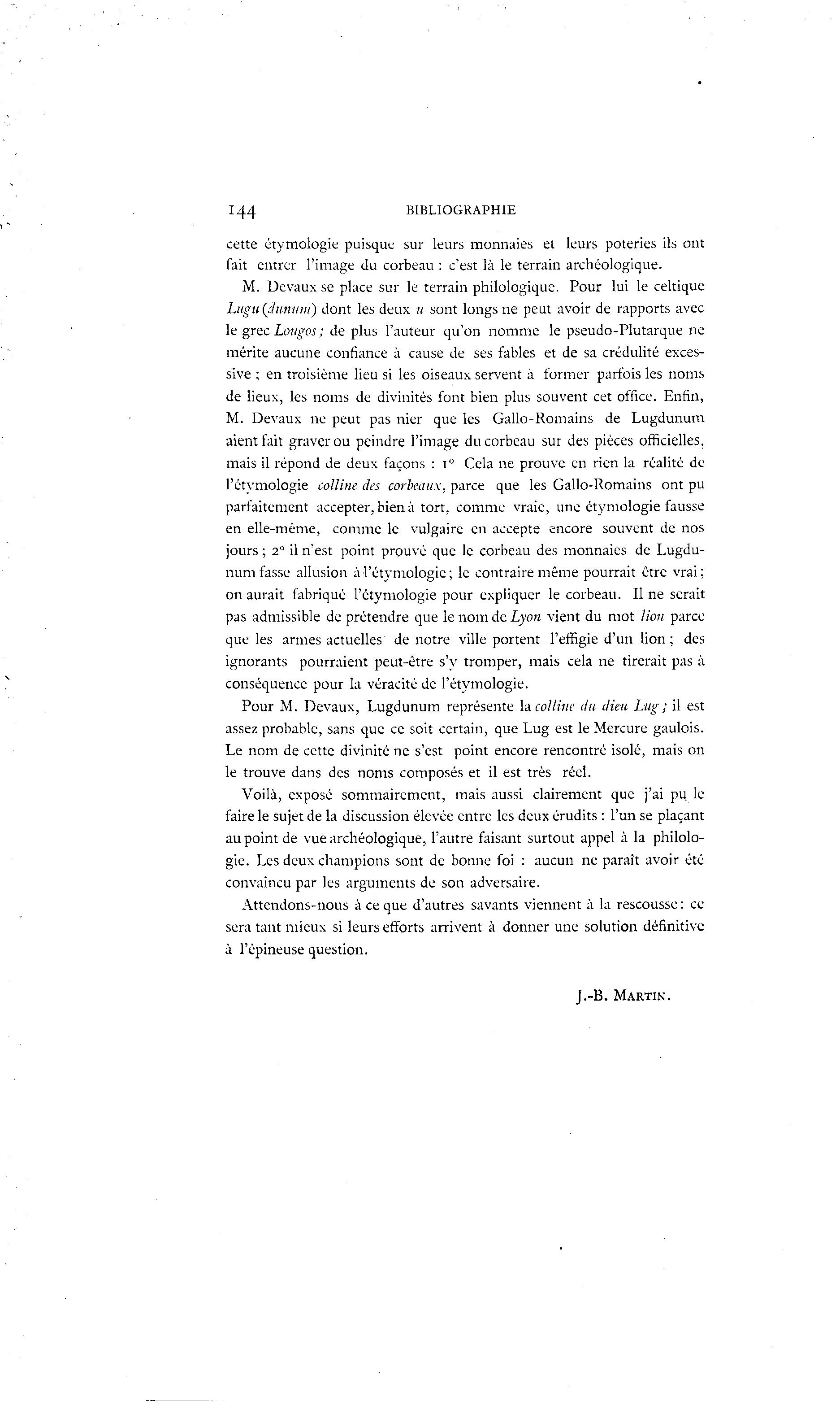 i44 BIBLIOGRAPHIE cette étymologie puisque sur leurs monnaies et leurs poteries ils ont fait entrer l'image du corbeau : c'est là le terrain archéologique. M. Devaux se place sur le terrain philologique. Pour lui le celtique Lugu (duniim) dont les deux u sont longs ne peut avoir de rapports avec le grec Lougos ; de plus l'auteur qu'on nomme le pseudo-Plutarque ne mérite aucune confiance à cause de ses fables et de sa crédulité exces- sive ; en troisième lieu si les oiseaux servent à former parfois les noms de lieux, les noms de divinités font bien plus souvent cet office. Enfin, M. Devaux ne peut pas nier que les Gallo-Romains de Lugdunum aient fait graver ou peindre l'image du corbeau sur des pièces officielles, mais il répond de deux façons : i° Cela ne prouve en rien la réalité de l'étvmologie colline des corbeaux, parce que les Gallo-Romains ont pu parfaitement accepter, bien à tort, comme vraie, une étymologie fausse en elle-même, comme le vulgaire en accepte encore souvent de nos jours ; 2° il n'est point prouvé que le corbeau des monnaies de Lugdu- num fasse allusion à l'étymologie ; le contraire même pourrait être vrai; on aurait fabriqué l'étymologie pour expliquer le corbeau. Il ne serait pas admissible de prétendre que le nom de Lyon vient du mot lion parce que les armes actuelles de notre ville portent l'effigie d'un lion ; des ignorants pourraient peut-être s'y tromper, mais cela ne tirerait pas à conséquence pour la véracité de l'étymologie. Pour M. Devaux, Lugdunum représente la colline du dieu Lug; il est assez probable, sans que ce soit certain, que Lug est le Mercure gaulois. Le nom de cette divinité ne s'est point encore rencontré isolé, mais on le trouve dans des noms composés et il est très réel. Voilà , exposé sommairement, mais aussi clairement que j'ai pu le faire le sujet de la discussion élevée entre les deux érudits : l'un se plaçant au point de vue archéologique, l'autre faisant surtout appel à la philolo- gie. Les deux champions sont de bonne foi : aucun ne paraît avoir été convaincu par les arguments de son adversaire. Attendons-nous à ce que d'autres savants viennent à la rescousse : ce sera tant mieux si leurs efforts arrivent à donner une solution définitive à l'épineuse question. J.-B. MARTIN.