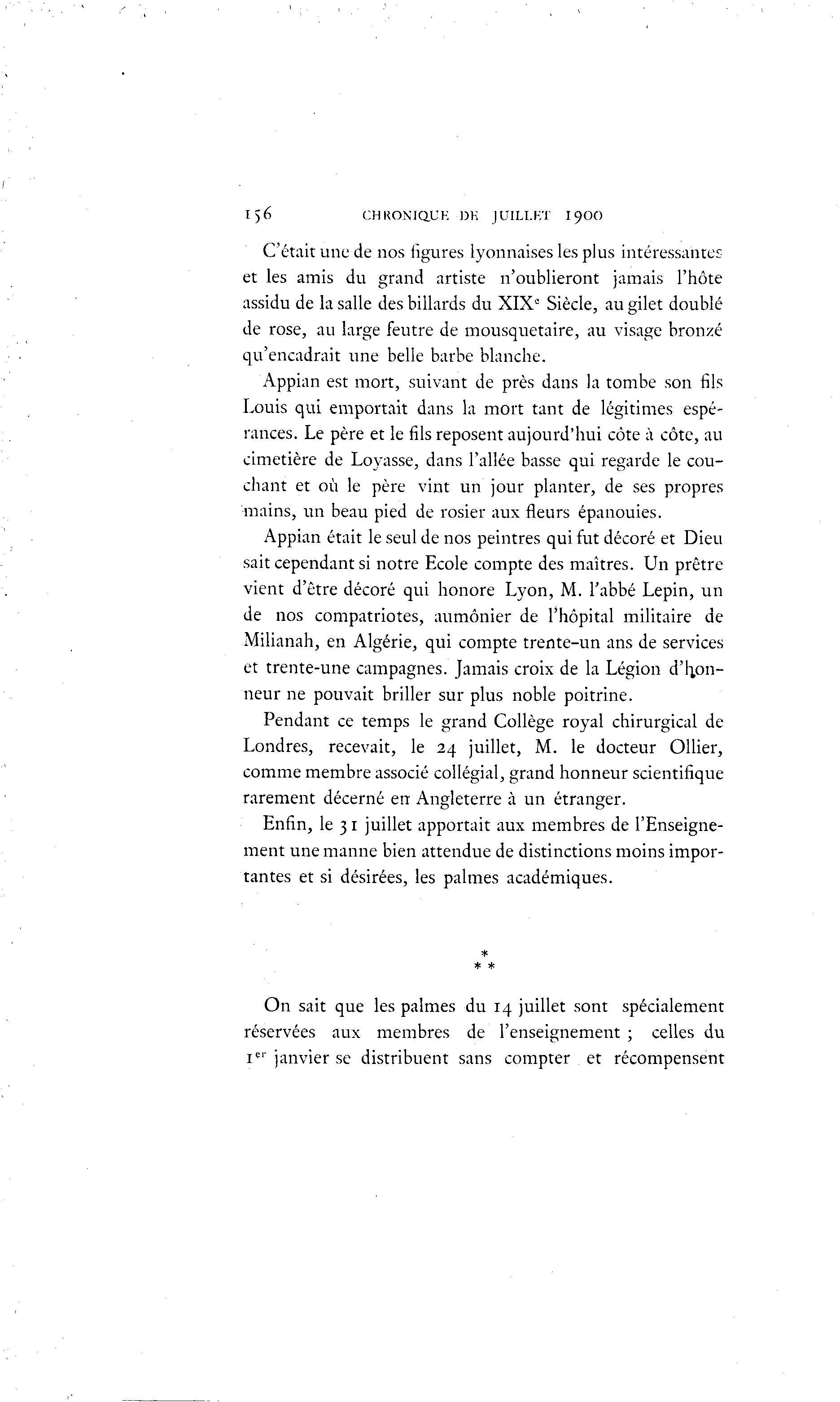 i56 CHKONJQUK DK JUILLET 19OO C'était une de nos figures lyonnaises les plus intéressantes et les amis du grand artiste n'oublieront jamais l'hôte assidu de la salle des billards du XIX e Siècle, au gilet doublé de rose, au large feutre de mousquetaire, au visage bronzé qu'encadrait une belle barbe blanche. Appian est mort, suivant de près dans la tombe son fils Louis qui emportait dans la mort tant de légitimes espé- rances. Le père et le fils reposent aujourd'hui côte à côte, au cimetière de Lovasse, dans l'allée basse qui regarde le cou- chant et où le père vint un jour planter, de ses propres mains, un beau pied de rosier aux fleurs épanouies. Appian était le seul de nos peintres qui fut décoré et Dieu sait cependant si notre Ecole compte des maîtres. Un prêtre vient d'être décoré qui honore Lyon, M. l'abbé Lepin, un de nos compatriotes, aumônier de l'hôpital militaire de Milianah, en Algérie, qui compte trente-un ans de services et trente-une campagnes. Jamais croix de la Légion d'ripn- neur ne pouvait briller sur plus noble poitrine. Pendant ce temps le grand Collège royal chirurgical de Londres, recevait, le 24 juillet, M. le docteur Ollier, comme membre associé collégial, grand honneur scientifique rarement décerné en Angleterre à un étranger. Enfin, le 31 juillet apportait aux membres de l'Enseigne- ment une manne bien attendue de distinctions moins impor- tantes et si désirées, les palmes académiques. ** On sait que les palmes du 14 juillet sont spécialement réservées aux membres de l'enseignement ; celles du 1e1' janvier se distribuent sans compter et récompensent