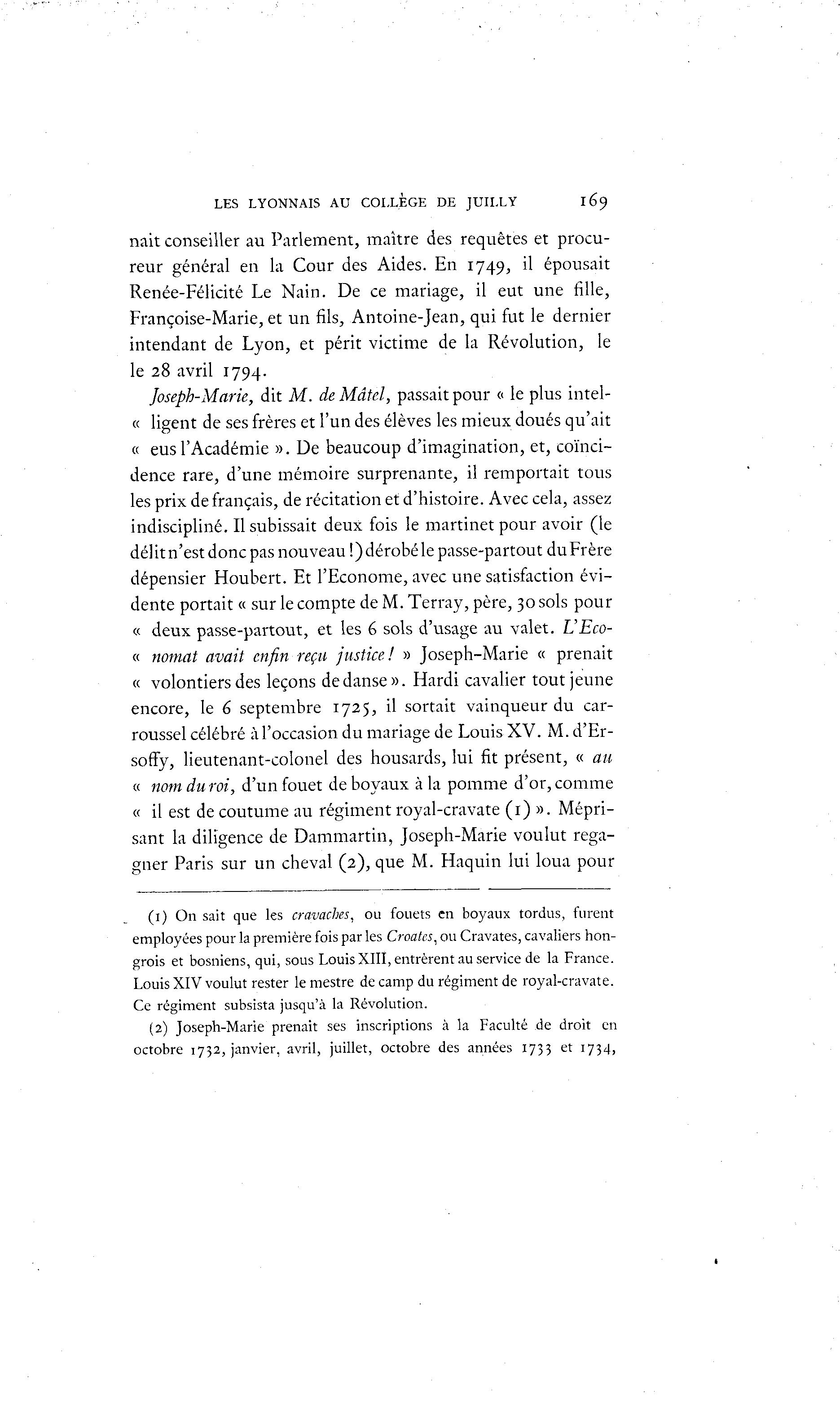 LES LYONNAIS AU COLLEGE DE JTJILLY 169 nait conseiller au Parlement, maître des requêtes et procu- reur général en la Cour des Aides. En 1749, il épousait Renée-Félicité Le Nain. De ce mariage, il eut une fille, Françoise-Marie, et un fils, Antoine-Jean, qui fut le dernier intendant de Lyon, et périt victime de la Révolution, le le 28 avril 1794. Joseph-Marie, dit M. deMâtel, passait pour « le plus intel- « ligent de ses frères et l'un des élèves les mieux doués qu'ait « eus l'Académie ». De beaucoup d'imagination, et, coïnci- dence rare, d'une mémoire surprenante, il remportait tous les prix de français, de récitation et d'histoire. Avec cela, assez indiscipliné. Il subissait deux fois le martinet pour avoir (le délit n'est donc pas nouveau!) dérobé le passe-partout du Frère dépensier Houbert. Et l'Econome, avec une satisfaction évi- dente portait « sur le compte de M. Terray, père, 30 sols pour « deux passe-partout, et les 6 sols d'usage au valet. L'Eco- « nomat avait enfin reçu justice! » Joseph-Marie « prenait « volontiers des leçons de danse». Hardi cavalier tout jeune encore, le 6 septembre 1725, il sortait vainqueur du car- roussel célébré à l'occasion du mariage de Louis XV. M. d'Er- soffy, lieutenant-colonel des housards, lui fit présent, « au « nom du roi, d'un fouet de boyaux à la pomme d'or, comme « il est de coutume au régiment royal-cravate (1) ». Mépri- sant la diligence de Dammartin, Joseph-Marie voulut rega- gner Paris sur un cheval (2), que M. Haquin lui loua pour (1) On sait que les cravaches, ou fouets en boyaux tordus, furent employées pour la première fois par les Croates, ou Cravates, cavaliers hon- grois et bosniens, qui, sous Louis XIII, entrèrent au service de la France. Louis XIV voulut rester le mestre de camp du régiment de royal-cravate. Ce régiment subsista jusqu'à la Révolution. (2) Joseph-Marie prenait ses inscriptions à la Faculté de droit en octobre 1732, janvier, avril, juillet, octobre des années 1733 et 1734,