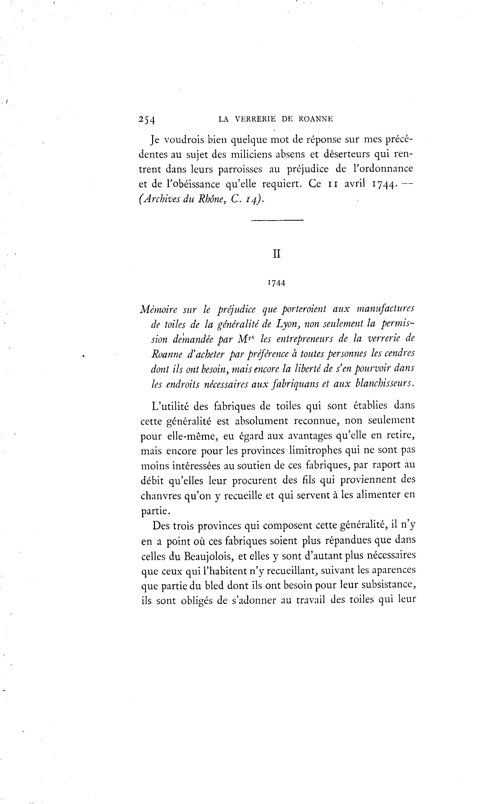 LA 254 VERRERIE DE ROANNE Je voudrois bien quelque mot de réponse sur mes précé- dentes au sujet des miliciens absens et déserteurs qui ren- trent dans leurs parroisses au préjudice de l'ordonnance et de l'obéissance qu'elle requiert. Ce n avril 1744. — (Archives du Rhône, C. 14). II 1744 Mémoire sur le préjudice que porteraient aux manufactures de toiles de la généralité de Lyon, non seulement la permis- sion demandée par M rS les entrepreneurs de la verrerie de Roanne d'acheter par préférence h toutes personnes les cendres dont ils ont besoin, mais encore la liberté de s'en pourvoir dans les endroits nécessaires aux fabriquons et aux blanchisseurs. L'utilité des fabriques de toiles qui sont établies dans cette généralité est absolument reconnue, non seulement pour elle-même, eu égard aux avantages qu'elle en retire, mais encore pour les provinces limitrophes qui ne sont pas moins intéressées au soutien de ces fabriques, par raport au débit qu'elles leur procurent des fils qui proviennent des chanvres qu'on y recueille et qui servent à les alimenter en partie. Des trois provinces qui composent cette généralité, il n'y en a point où ces fabriques soient plus répandues que dans celles du Beaujolois, et elles y sont d'autant plus nécessaires que ceux qui l'habitent n'y recueillant, suivant les aparences que partie du bled dont ils ont besoin pour leur subsistance, ils sont obligés de s'adonner au travail des toiles qui leur