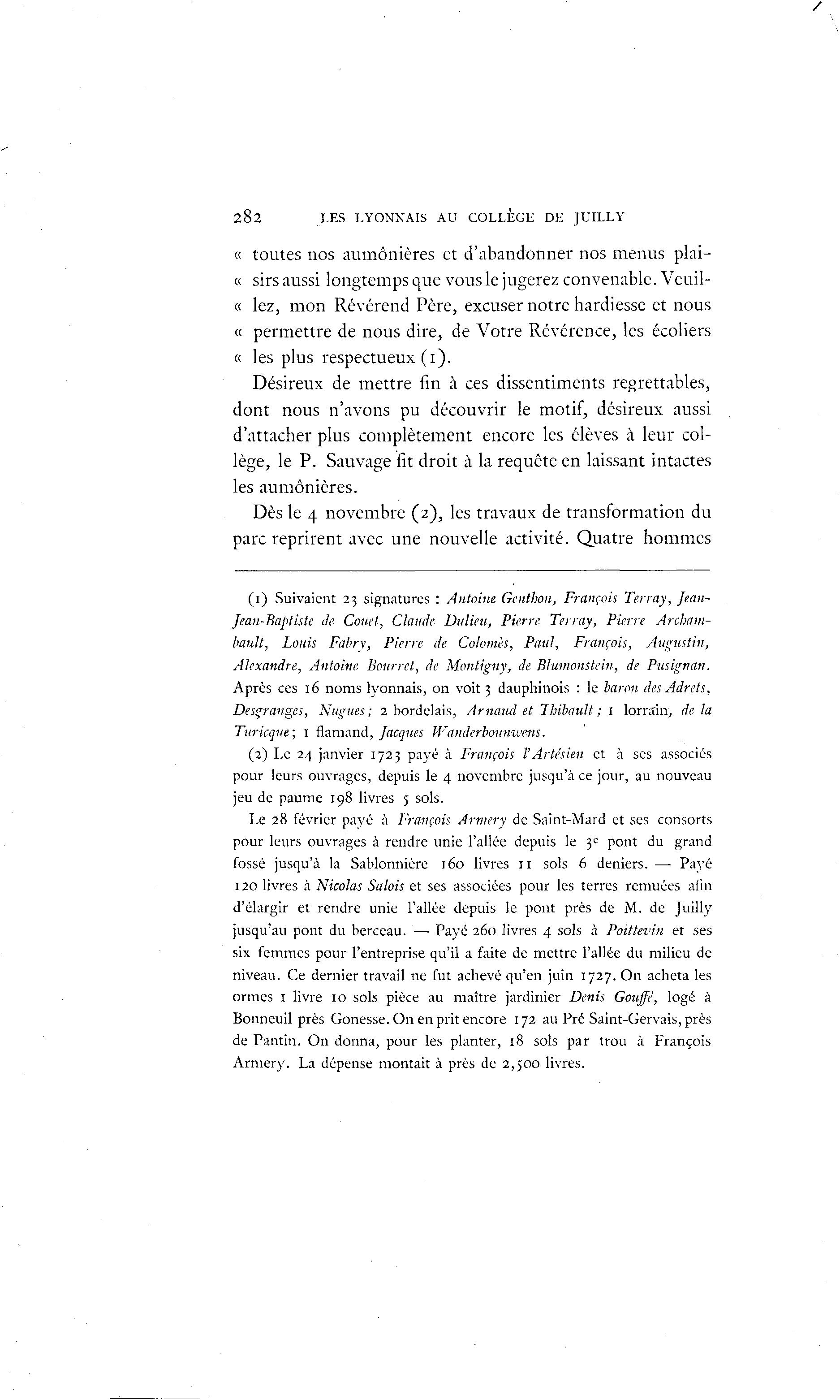 282 LES LYONNAIS AU COLLEGE DE JUILLY « toutes nos aumônières et d'abandonner nos menus plai- « sirs aussi longtemps que vous le jugerez convenable. Veuil- « lez, mon Révérend Père, excuser notre hardiesse et nous « permettre de nous dire, de Votre Révérence, les écoliers « les plus respectueux (1). Désireux de mettre fin à ces dissentiments regrettables, dont nous n'avons pu découvrir le motif, désireux aussi d'attacher plus complètement encore les élèves à leur col- lège, le P. Sauvage fit droit à la requête en laissant intactes les aumônières. Dès le 4 novembre (2), les travaux de transformation du parc reprirent avec une nouvelle activité. Quatre hommes (1) Suivaient 23 signatures : Antoine Genthon, François Terray, Jean- Jean-Baptiste de Coud, Claude Dulieu, Pierre Terray, Pierre Arcbain- bault, Louis Fabry, Pierre de Colonies, Paul, François, Augustin, Alexandre, Antoine Bonnet, de Montigny, de Blumonstein, de Pusignan. Après ces 16 noms lyonnais, on voit 3 dauphinois : le baron des Adrets, Desçranges, Nugues; 2 bordelais, Arnaud et Thibault ; 1 lorrain, de la Turicque; 1 flamand, Jacques Wanderbounivens. (2) Le 24 janvier 1723 payé à François l'Artésien et à ses associés pour leurs ouvrages, depuis le 4 novembre jusqu'à ce jour, au nouveau jeu de paume 198 livres 5 sols. Le 28 février payé à François Armery de Saint-Mard et ses consorts pour leurs ouvrages à rendre unie l'allée depuis le 3 e pont du grand fossé jusqu'à la Sablonnière 160 livres 11 sols 6 deniers. — Payé 120 livres à Nicolas Salois et ses associées pour les terres remuées afin d'élargir et rendre unie l'allée depuis le pont près de M. de Juilly jusqu'au pont du berceau. — Payé 260 livres 4 sols à Poittevin et ses six femmes pour l'entreprise qu'il a faite de mettre l'allée du milieu de niveau. Ce dernier travail ne fut achevé qu'en juin 1727. On acheta les ormes 1 livre 10 sols pièce au maître jardinier Denis Gouffé, logé à Bonneuil près Gonesse. On en prit encore 172 au Pré Saint-Gervais, près de Pantin. On donna, pour les planter, 18 sols par trou à François Armery. La dépense montait à près de 2,500 livres.