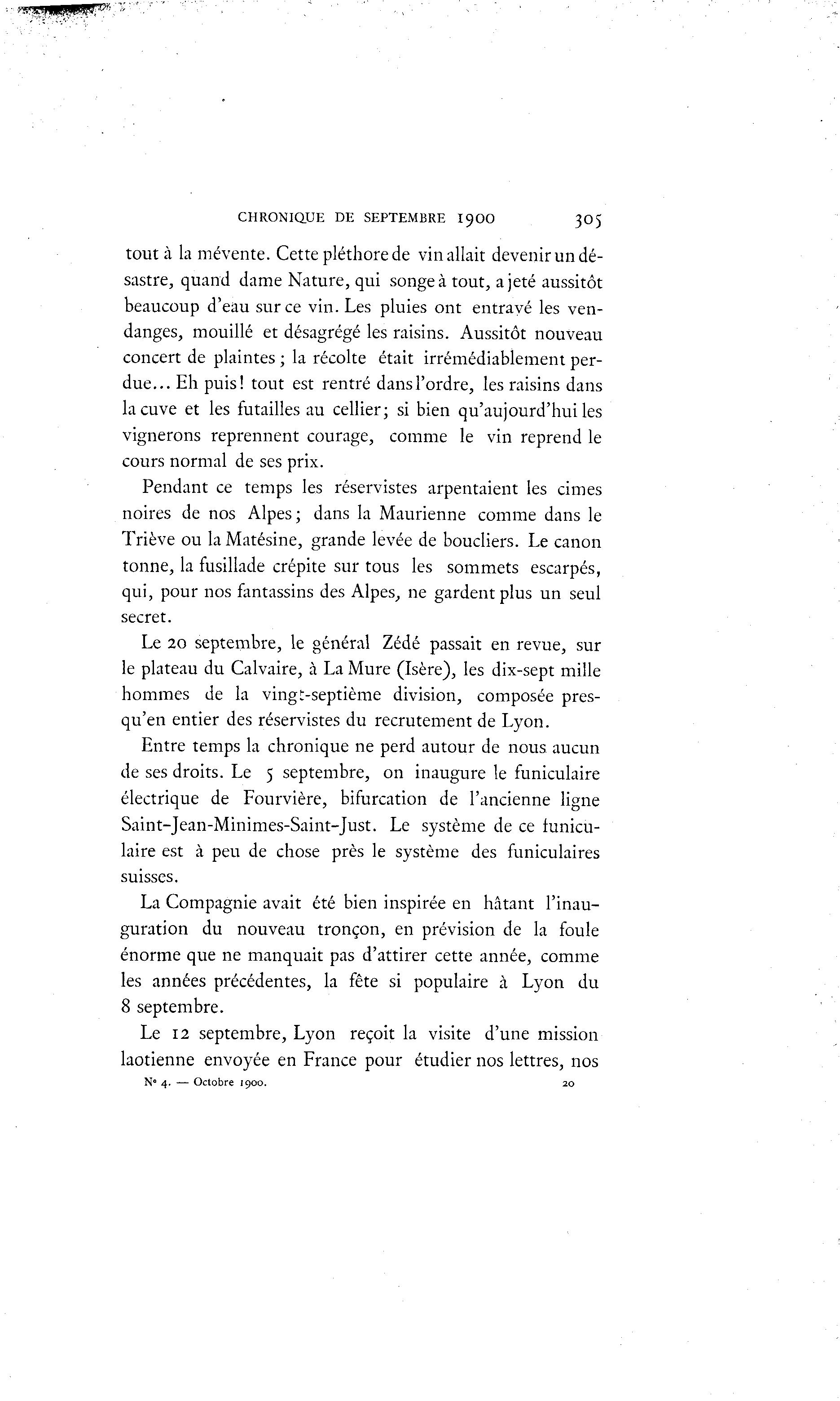 CHRONIQUE DE SEPTEMBRE I9OO 305 tout à la mévente. Cette pléthore de vin allait devenir un dé- sastre, quand dame Nature, qui songea tout, a jeté aussitôt beaucoup d'eau sur ce vin. Les pluies ont entravé les ven- danges, mouillé et désagrégé les raisins. Aussitôt nouveau concert de plaintes ; la récolte était irrémédiablement per- due... Eh puis! tout est rentré dans l'ordre, les raisins dans la cuve et les futailles au cellier; si bien qu'aujourd'hui les vignerons reprennent courage, comme le vin reprend le cours normal de ses prix. Pendant ce temps les réservistes arpentaient les cimes noires de nos Alpes; dans la Maurienne comme dans le Triève ou la Matésine, grande levée de boucliers. Le canon tonne, la fusillade crépite sur tous les sommets escarpés, qui, pour nos fantassins des Alpes, ne gardent plus un seul secret. Le 20 septembre, le général Zédé passait en revue, sur le plateau du Calvaire, à La Mure (Isère), les dix-sept mille hommes de la vingt-septième division, composée pres- qu'en entier des réservistes du recrutement de Lyon. Entre temps la chronique ne perd autour de nous aucun de ses droits. Le 5 septembre, on inaugure le funiculaire électrique de Fourvière, bifurcation de l'ancienne ligne Saint-Jean-Minimes-Saint-Just. Le système de ce funicu- laire est à peu de chose près le système des funiculaires suisses. La Compagnie avait été bien inspirée en hâtant l'inau- guration du nouveau tronçon, en prévision de la foule énorme que ne manquait pas d'attirer cette année, comme les années précédentes, la fête si populaire à Lyon du 8 septembre. Le 12 septembre, Lyon reçoit la visite d'une mission laotienne envoyée en France pour étudier nos lettres, nos N° 4. — Octobre 1900. 20