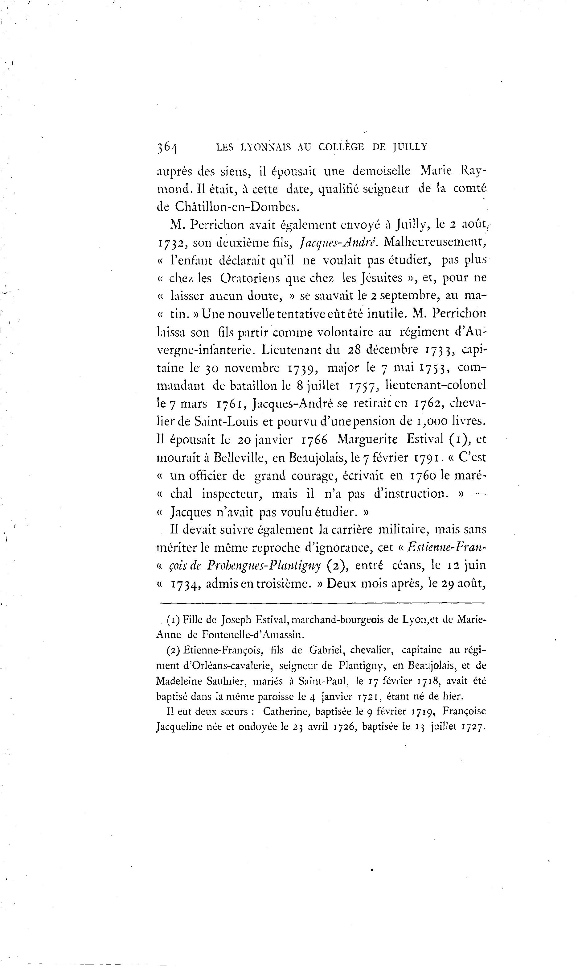 364 LES LYONNAIS AU COLLEGE DE JU1LLY auprès des siens, il épousait une demoiselle Marie Ray- mond. Il était, à cette date, qualifié seigneur de la comté de Châtillon-en-Dombes. M. Perrichon avait également envoyé à Juilly, le 2 août, 1732, son deuxième fils, Jacques-André. Malheureusement, « l'enfant déclarait qu'il ne voulait pas étudier, pas plus « chez les Oratoriens que chez les Jésuites », et, pour ne « laisser aucun doute, » se sauvait le 2 septembre, au ma- « tin. «Une nouvelle tentative eût été inutile. M. Perrichon laissa son fils partir comme volontaire au régiment d'Au- vergne-infanterie. Lieutenant du 28 décembre 1733, capi- taine le 30 novembre 1739, major le 7 mai 1753, com- mandant de bataillon le 8 juillet 1757, lieutenant-colonel le 7 mars 1761, Jacques-André se retirait en 1762, cheva- lier de Saint-Louis et pourvu d'unepension de 1,000 livres. Il épousait le 20 janvier 1766 Marguerite Estival (1), et mourait à Belleville, en Beaujolais, le 7 février 1791. « C'est « un officier de grand courage, écrivait en 1760 le maré- « chai inspecteur, mais il n'a pas d'instruction. » — « Jacques n'avait pas voulu étudier. » Il devait suivre également la carrière militaire, mais sans mériter le même reproche d'ignorance, cet « Estienne-Fran- « çoisde Prohengues-Plantigny (2), entré céans, le 12 juin « 1734, admis en troisième. » Deux mois après, le 29 août, (1) Fille de Joseph Estival, marchand-bourgeois de Lyon,et de Marie- Anne de Fontenelle-d'Amassin. (2) Etienne-François, fils de Gabriel, chevalier, capitaine au régi- ment d'Orléans-cavalerie, seigneur de Plantigny, en Beaujolais, et de Madeleine Saulnier, mariés à Saint-Paul, le 17 février 1718, avait été baptisé dans la même paroisse le 4 janvier 1721, étant né de hier. Il eut deux sœurs : Catherine, baptisée le 9 février 1719, Françoise Jacqueline née et ondoyée le 23 avril 1726, baptisée le 13 juillet 1727.