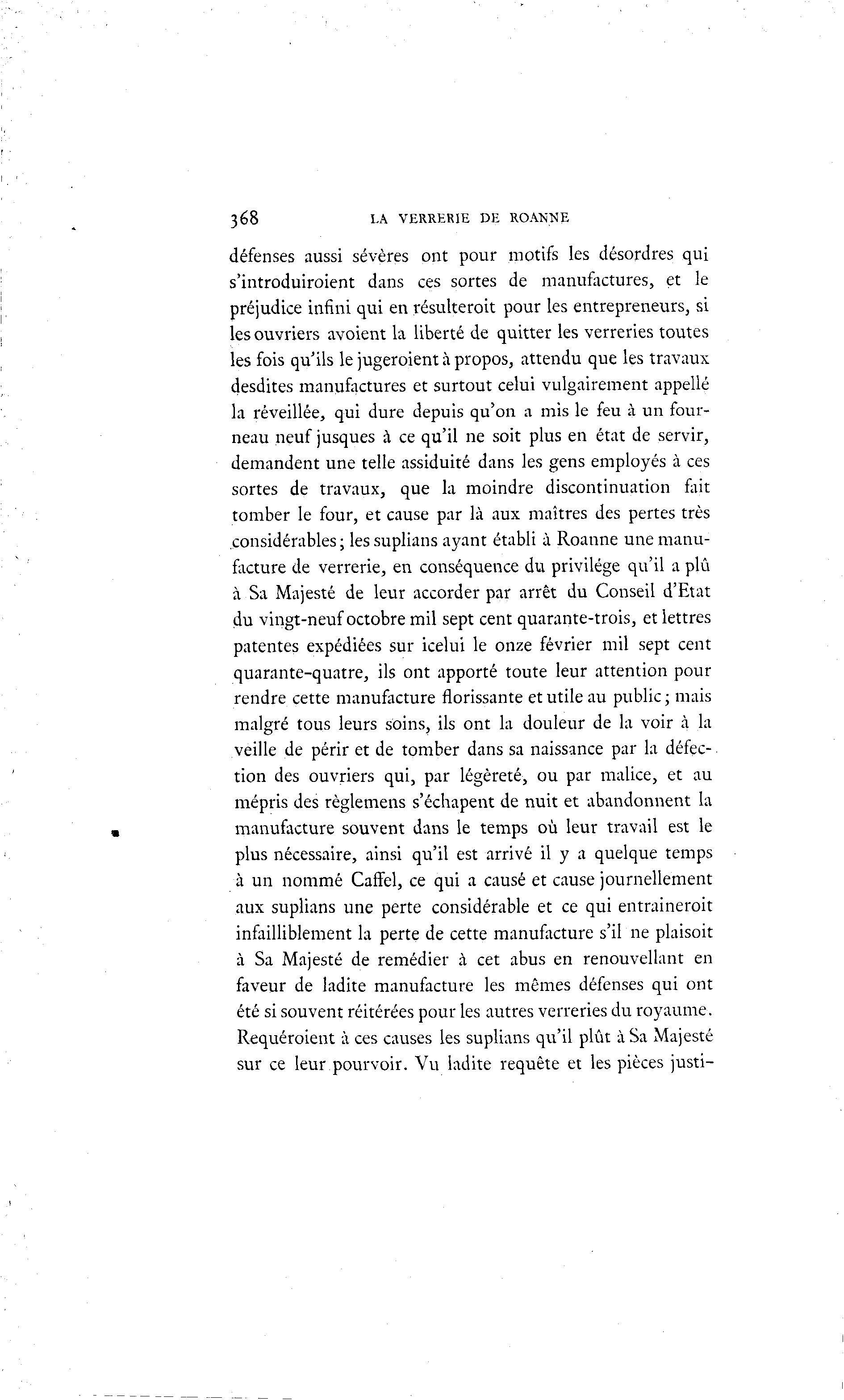 368 LA VERRERIE DE ROANNE défenses aussi sévères ont pour motifs les désordres qui s'introduiroient dans ces sortes de manufactures, et le préjudice infini qui en résulteroit pour les entrepreneurs, si les ouvriers avoient la liberté de quitter les verreries toutes les fois qu'ils le jugeraient à propos, attendu que les travaux desdites manufactures et surtout celui vulgairement appelle la réveillée, qui dure depuis qu'on a mis le feu à un four- neau neuf jusques à ce qu'il ne soit plus en état de servir, demandent une telle assiduité dans les gens employés à ces sortes de travaux, que la moindre discontinuation fait tomber le four, et cause par là aux maîtres des pertes très considérables ; les suplians ayant établi à Roanne une manu- facture de verrerie, en conséquence du privilège qu'il a plû à Sa Majesté de leur accorder par arrêt du Conseil d'Etat du vingt-neuf octobre mil sept cent quarante-trois, et lettres patentes expédiées sur icelui le onze février mil sept cent quarante-quatre, ils ont apporté toute leur attention pour rendre cette manufacture florissante et utile au public ; mais malgré tous leurs soins, ils ont la douleur de la voir à la veille de périr et de tomber dans sa naissance par la défec- tion des ouvriers qui, par légèreté, ou par malice, et au mépris des règlemens s'échapent de nuit et abandonnent la manufacture souvent dans le temps où leur travail est le plus nécessaire, ainsi qu'il est arrivé il y a quelque temps à un nommé CafTel, ce qui a causé et cause journellement aux suplians une perte considérable et ce qui entraineroit infailliblement la perte de cette manufacture s'il ne plaisoit à Sa Majesté de remédier à cet abus en renouvellant en faveur de ladite manufacture les mêmes défenses qui ont été si souvent réitérées pour les autres verreries du royaume. Requéraient à ces causes les suplians qu'il plût à Sa Majesté sur ce leur pourvoir. Vu ladite requête et les pièces justi-