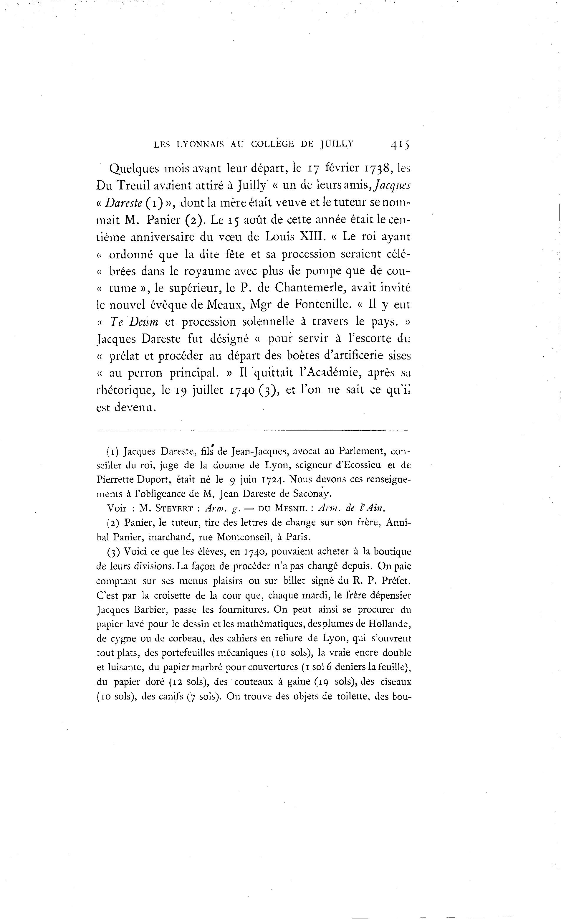 LES LYONNAIS AU COLLEGE DE JUILLY 415 Quelques mois avant leur départ, le 17 février 1738, les Du Treuil avaient attiré à Juilly « un de leurs amis, Jacques « Dareste (1) », dont la mère était veuve et le tuteur se nom- mait M. Panier (2). Le 15 août de cette année était le cen- tième anniversaire du vœu de Louis XIII. « Le roi ayant « ordonné que la dite fête et sa procession seraient célé- « brées dans le royaume avec plus de pompe que de cou- « tume », le supérieur, le P. de Chantemerle, avait invité le nouvel évêque de Meaux, Mgr de Fontenille. « Il y eut « Te Deum et procession solennelle à travers le pays. » Jacques Dareste fut désigné « pour servir à l'escorte du « prélat et procéder au départ des boètes d'artificerie sises « au perron principal. » Il quittait l'Académie, après sa rhétorique, le 19 juillet 1740 (3), et l'on ne sait ce qu'il est devenu. (1) Jacques Dareste, fils de Jean-Jacques, avocat au Parlement, con- seiller du roi, juge de la douane de Lyon, seigneur d'Ecossieu et de Pierrette Duport, était né le 9 juin 1724. Nous devons ces renseigne- ments à l'obligeance de M. Jean Dareste de Saconay. Voir : M. STEYERT : Arm. g. — DU MESNIL : Arm. de VAin. (2) Panier, le tuteur, tire des lettres de change sur son frère, Anni- bal Panier, marchand, rue Montconseil, à Paris. (3) Voici ce que les élèves, en 1740, pouvaient acheter à la boutique de leurs divisions. La façon de procéder n'a pas changé depuis. On paie comptant sur ses menus plaisirs ou sur billet signé du R. P. Préfet. C'est par la croisette de la cour que, chaque mardi, le frère dépensier Jacques Barbier, passe les fournitures. On peut ainsi se procurer du papier lavé pour le dessin et les mathématiques, desplumes de Hollande, de cygne ou de corbeau, des cahiers en reliure de Lyon, qui s'ouvrent tout plats, des portefeuilles mécaniques (10 sols), la vraie encre double et luisante, du papier marbré pour couvertures (1 sol 6 deniers la feuille), du papier doré (12 sols), des couteaux à gaine (19 sols), des ciseaux (10 sols), des canifs (7 sols). On trouve des objets de toilette, des bou-