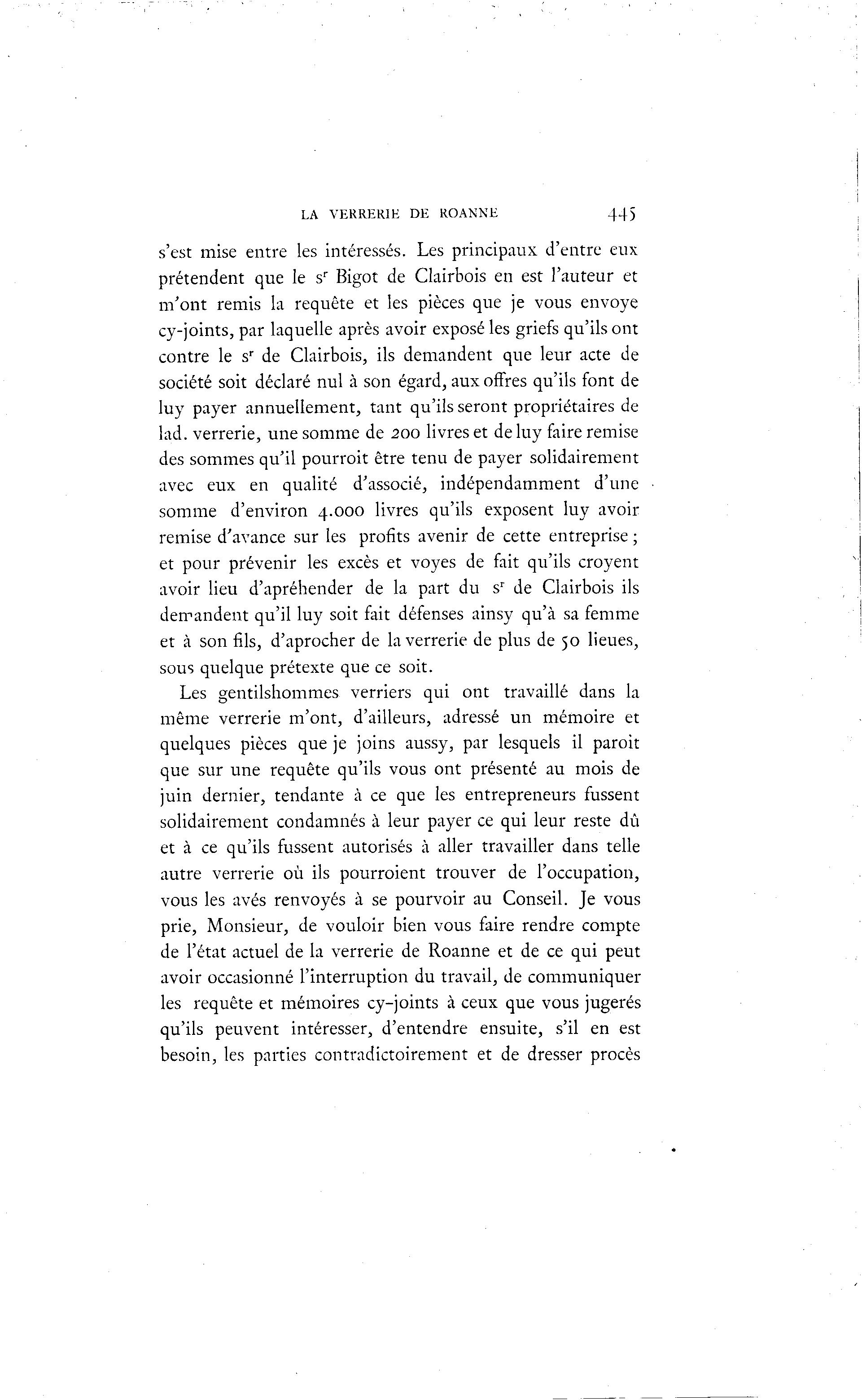 LA VERRERIE DE ROANNE 445 s'est mise entre les intéressés. Les principaux d'entre eux prétendent que le sr Bigot de Clairbois en est l'auteur et m'ont remis la requête et les pièces que je vous envoyé cy-joints, par laquelle après avoir exposé les griefs qu'ils ont contre le sr de Clairbois, ils demandent que leur acte de société soit déclaré nul à son égard, aux offres qu'ils font de luy payer annuellement, tant qu'ils seront propriétaires de lad. verrerie, une somme de 200 livres et de luy faire remise des sommes qu'il pourrait être tenu de payer solidairement avec eux en qualité d'associé, indépendamment d'une somme d'environ 4.000 livres qu'ils exposent luy avoir remise d'avance sur les profits avenir de cette entreprise ; et pour prévenir les excès et voyes de fait qu'ils croyent avoir lieu d'apréhender de la part du sr de Clairbois ils demandent qu'il luy soit fait défenses ainsy qu'à sa femme et à son fils, d'aprocher de la verrerie de plus de 50 lieues, sous quelque prétexte que ce soit. Les gentilshommes verriers qui ont travaillé dans la même verrerie m'ont, d'ailleurs, adressé un mémoire et quelques pièces que je joins aussy, par lesquels il paroit que sur une requête qu'ils vous ont présenté au mois de juin dernier, tendante à ce que les entrepreneurs fussent solidairement condamnés à leur payer ce qui leur reste dû et à ce qu'ils fussent autorisés à aller travailler dans telle autre verrerie où ils pourraient trouver de l'occupation, vous les avés renvoyés à se pourvoir au Conseil. Je vous prie, Monsieur, de vouloir bien vous faire rendre compte de l'état actuel de la verrerie de Roanne et de ce qui peut avoir occasionné l'interruption du travail, de communiquer les requête et mémoires cy-joints à ceux que vous jugerés qu'ils peuvent intéresser, d'entendre ensuite, s'il en est besoin, les parties contradictoirement et de dresser procès