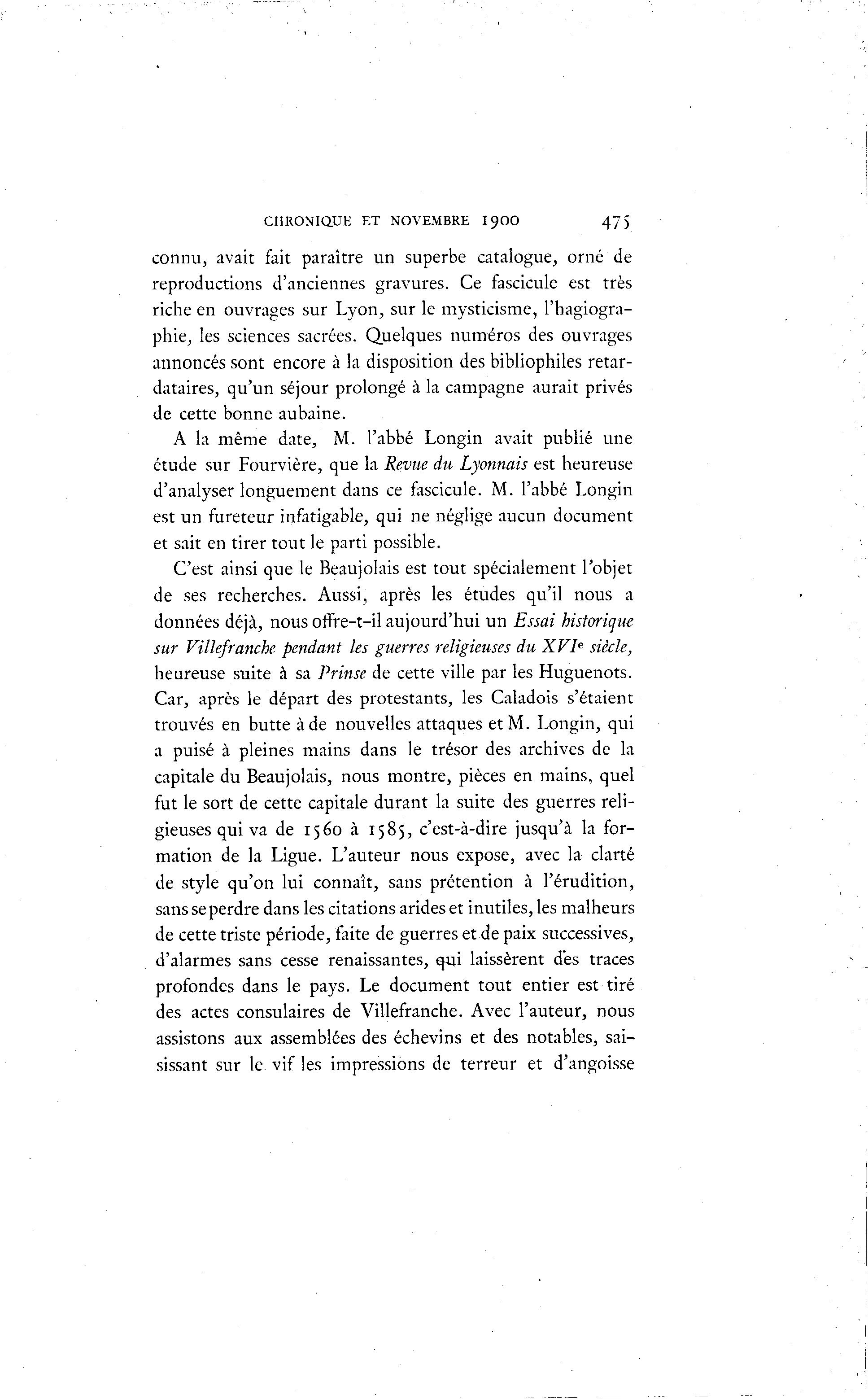 CHRONIQUE ET NOVEMBRE I9OO 475 connu, avait fait paraître un superbe catalogue, orné de reproductions d'anciennes gravures. Ce fascicule est très riche en ouvrages sur Lyon, sur le mysticisme, l'hagiogra- phie, les sciences sacrées. Quelques numéros des ouvrages annoncés sont encore à la disposition des bibliophiles retar- dataires, qu'un séjour prolongé à la campagne aurait privés de cette bonne aubaine. A la même date, M. l'abbé Longin avait publié une étude sur Fourvière, que la Revue du Lyonnais est heureuse d'analyser longuement dans ce fascicule. M. l'abbé Longin est un fureteur infatigable, qui ne néglige aucun document et sait en tirer tout le parti possible. C'est ainsi que le Beaujolais est tout spécialement l'objet de ses recherches. Aussi, après les études qu'il nous a données déjà , nous offre-t-il aujourd'hui un Essai historique sur Villefranche pendant les guerres religieuses du XVIe siècle, heureuse suite à sa Prinse de cette ville par les Huguenots. Car, après le départ des protestants, les Caladois s'étaient trouvés en butte à de nouvelles attaques et M. Longin, qui a puisé à pleines mains dans le trésor des archives de la capitale du Beaujolais, nous montre, pièces en mains, quel fut le sort de cette capitale durant la suite des guerres reli- gieuses qui va de 1560 à 1585, c'est-à -dire jusqu'à la for- mation de la Ligue. L'auteur nous expose, avec la clarté de style qu'on lui connaît, sans prétention à l'érudition, sans se perdre dans les citations arides et inutiles, les malheurs de cette triste période, faite de guerres et de paix successives, d'alarmes sans cesse renaissantes, qui laissèrent des traces profondes dans le pays. Le document tout entier est tiré des actes consulaires de Villefranche. Avec l'auteur, nous assistons aux assemblées des échevins et des notables, sai- sissant sur le- vif les impressions de terreur et d'angoisse