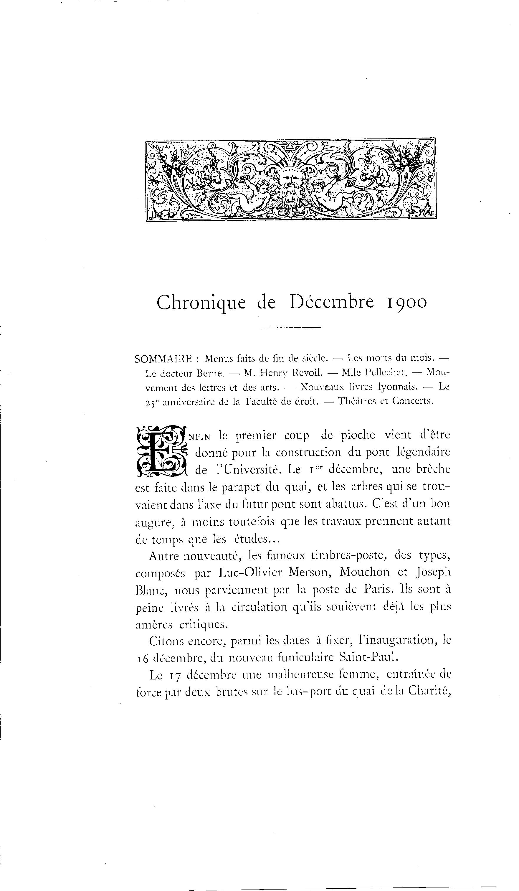 Chronique de Décembre 1900 SOMMAIRE : Menus faits de fin de siècle. — Les morts du mois. — Le docteur Berne. — M. Henry Revoil. — Mlle Pellechet. — Mou- vement des lettres et des arts. — Nouveaux livres lyonnais. — Le 25 e anniversaire de la Faculté de droit. — Théâtres et Concerts. NFIN le premier coup de pioche vient d'être donné pour la construction du pont légendaire de l'Université. Le I e r décembre, une brèche est faite dans le parapet du quai, et les arbres qui se trou- vaient dans l'axe du futur pont sont abattus. C'est d'un bon augure, à moins toutefois que les travaux prennent autant de temps que les études... Autre nouveauté, les fameux timbres-poste, des types, composés par Luc-Olivier Merson, Mouchon et Joseph Blanc, nous parviennent par la poste de Paris. Ils sont à peine livrés à la circulation qu'ils soulèvent déjà les plus arriéres critiques. Citons encore, parmi les dates à fixer, l'inauguration, le 16 décembre, du nouveau funiculaire Saint-Paul. Le 17 décembre une malheureuse femme, entraînée de force par deux brutes sur le bas-port du quai delà Charité,