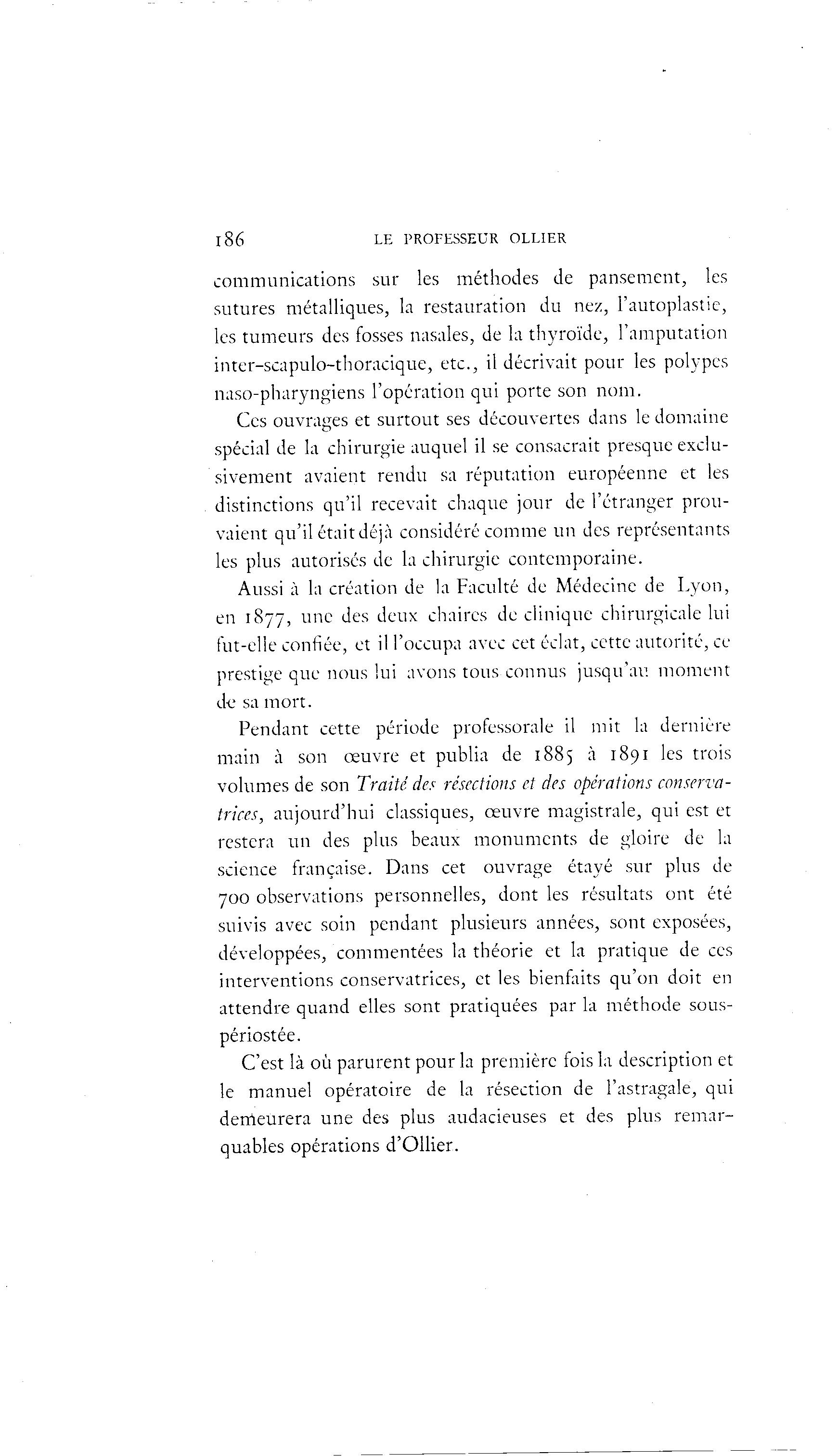 l86 LE PROFESSEUR OLLIER communications sur les méthodes de pansement, les sutures métalliques, la restauration du nez, l'autoplastie, les tumeurs des fosses nasales, de la thyroïde, l'amputation inter-scapulo-thoracique, etc., il décrivait pour les polypes naso-pharyngiens l'opération qui porte son nom. Ces ouvrages et surtout ses découvertes dans le domaine spécial de la chirurgie auquel il se consacrait presque exclu- sivement avaient rendu sa réputation européenne et les distinctions qu'il recevait chaque jour de l'étranger prou- vaient qu'il était déjà considéré comme un des représentants les plus autorisés de la chirurgie contemporaine. Aussi à la création de la Faculté de Médecine de Lyon, en 1877, une des deux chaires de clinique chirurgicale lui fut-elle confiée, et il l'occupa avec cet éclat, cette autorité, ce prestige que nous lui avons tous connus jusqu'au moment de sa mort. Pendant cette période professorale il mit la dernière main à son œuvre et publia de 1885 à 1891 les trois volumes de son Traité de.1- résections et des opérations conserva- trices, aujourd'hui classiques, œuvre magistrale, qui est et restera un des plus beaux monuments de gloire de la science française. Dans cet ouvrage étayé sur plus de 700 observations personnelles, dont les résultats ont été suivis avec soin pendant plusieurs années, sont exposées, développées, commentées la théorie et la pratique de ces interventions conservatrices, et les bienfaits qu'on doit en attendre quand elles sont pratiquées par la méthode sous- périostée. C'est là où parurent pour la première fois la description et le manuel opératoire de la résection de l'astragale, qui derrieurera une des plus audacieuses et des plus remar- quables opérations d'Ollier.