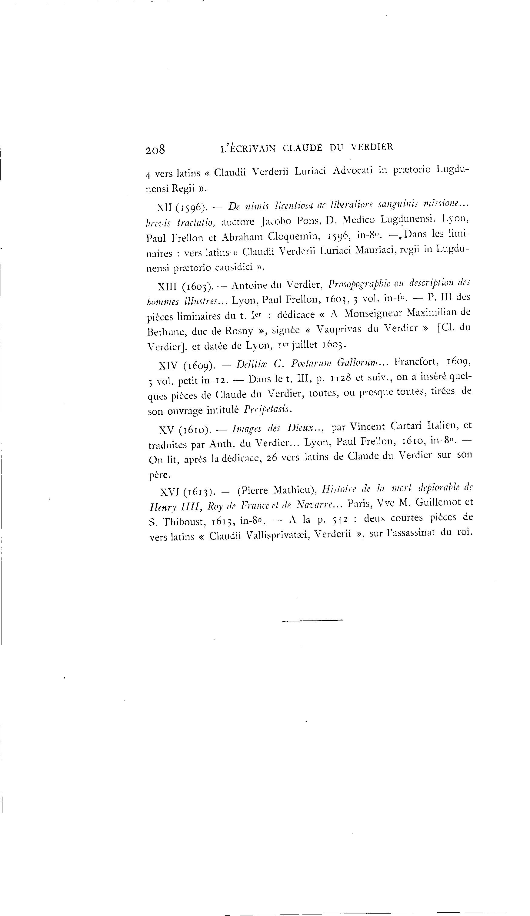 208 i/ÉCRIVAIN CLAUDE DU VERDIER 4 vers latins « Claudii Verderii Luriaci Advocati in prxtorio Lugdu- nensi Regii ». XII (1596). — De nimis licetitiosa ac liberaliore sanguinis missione... brevis tractatio, auctore Jacobo Pons, D. Medico Lugdunensi. Lvon, Paul Frellon et Abraham Cloquemin, 1596, in-8°. —.Dans les limi- naires : vers latins- « Claudii Verderii Luriaci Mauriaci, regii in Lugdu- nensi prœtorio causidici ». XIII (1603).— Antoine du Verdier, Prosopographie ou description des hommes illustres... Lyon, Paul Frellon, 1603, 3 vol. in-f°. — P. III des pièces liminaires du t. I er : dédicace « A Monseigneur Maximilian de Bethune, duc de Rosny », signée « Vauprivas du Verdier » [Cl. du Verdier], et datée de Lyon, I e r juillet 1603. XIV (1609). — Delilix C. Poctarum Gallorum... Francfort, 1609, 3 vol. petit in-12. — Dans le t. III, p. 1128 et suiv., on a inséré quel- ques pièces de Claude du Verdier, toutes, ou presque toutes, tirées de son ouvrage intitulé Peripetasis. XV (1610). — Images des Dieux.., par Vincent Cartari Italien, et traduites par Anth. du Verdier... Lyon, Paul Frellon, 1610, in-8°. — On lit, après la dédicace, 26 vers latins de Claude du Verdier sur son père. XVI (1613). — (Pierre Mathieu), Histoire de la mort déplorable de Henry IIII, Koy de France et de Navarre... Paris, Vve M. Guillemot et S. Thiboust, 1613, in-8°. — A la p. 542 : deux courtes pièces de vers latins « Claudii Vallisprivataei, Verderii », sur l'assassinat du roi.