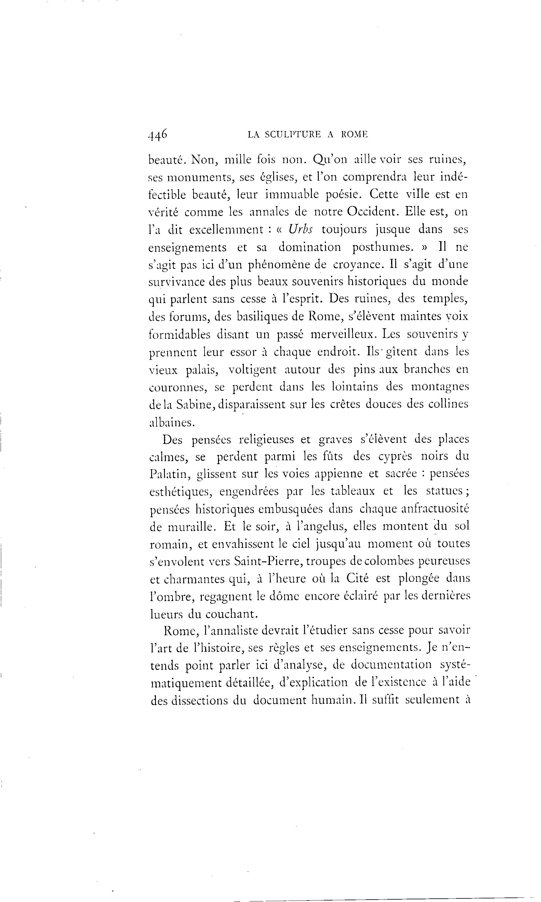 446 LA SCULPTURE A ROME beauté. Non, mille fois non. Qu'on aille voir ses ruines, ses monuments, ses églises, et l'on comprendra leur indé- fectible beauté, leur immuable poésie. Cette ville est en vérité comme les annales de notre Occident. Elle est, on l'a dit excellemment : « Urbs toujours jusque dans ses enseignements et sa domination posthumes. » Il ne s'agit pas ici d'un phénomène de croyance. Il s'agit d'une survivance des plus beaux souvenirs historiques du monde qui parlent sans cesse à l'esprit. Des ruines, des temples, des forums, des basiliques de Rome, s'élèvent maintes voix formidables disant un passé merveilleux. Les souvenirs y prennent leur essor à chaque endroit. Ils'gîtent dans les vieux palais, voltigent autour des pins aux branches en couronnes, se perdent dans les lointains des montagnes delà Sabine,disparaissent sur les crêtes douces des collines albaines. Des pensées religieuses et graves s'élèvent des places calmes, se perdent parmi les fûts des cyprès noirs du Palatin, glissent sur les voies appienne et sacrée : pensées esthétiques, engendrées par les tableaux et les statues ; pensées historiques embusquées dans chaque anfractuosité de muraille. Et le soir, à l'angelus, elles montent du sol romain, et envahissent le ciel jusqu'au moment où toutes s'envolent vers Saint-Pierre, troupes de colombes peureuses et charmantes qui, à l'heure où la Cité est plongée dans l'ombre, regagnent le dôme encore éclairé par les dernières lueurs du couchant. Rome, l'annaliste devrait l'étudier sans cesse pour savoir l'art de l'histoire, ses règles et ses enseignements. Je n'en- tends point parler ici d'analyse, de documentation systé- matiquement détaillée, d'explication de l'existence à l'aide des dissections du document humain. Il suffit seulement Ã