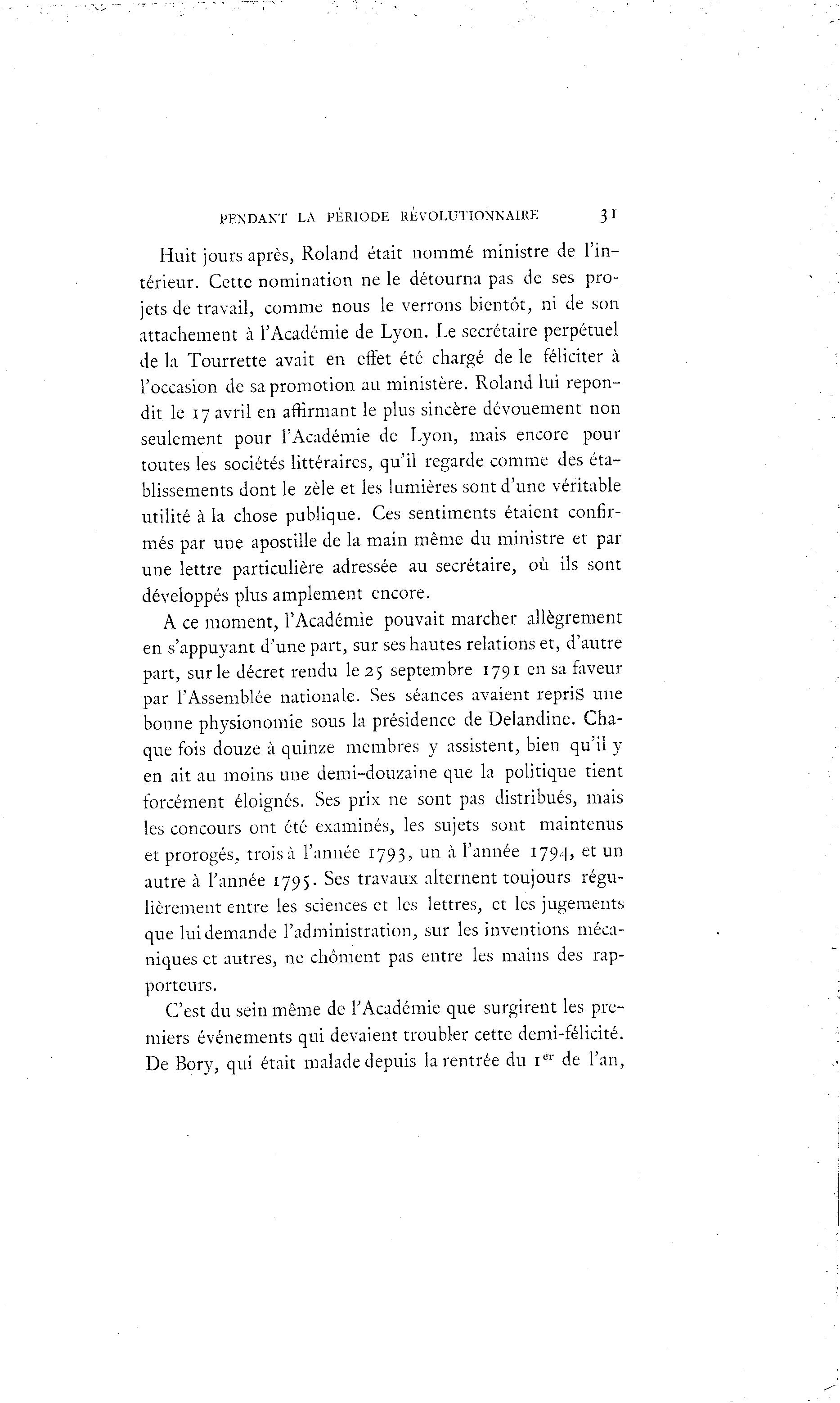PENDANT LA PERIODE REVOLUTIONNAIRE 31 Huit jours après, Roland était nommé ministre de l'in- térieur. Cette nomination ne le détourna pas de ses pro- jets de travail, comme nous le verrons bientôt, ni de son attachement à l'Académie de Lyon. Le secrétaire perpétuel de la Tourrette avait en effet été chargé de le féliciter à l'occasion de sa promotion au ministère. Roland lui repon- dit le 17 avril en affirmant le plus sincère dévouement non seulement pour l'Académie de Lyon, mais encore pour toutes les sociétés littéraires, qu'il regarde comme des éta- blissements dont le zèle et les lumières sont d'une véritable utilité à la chose publique. Ces sentiments étaient confir- més par une apostille de la main même du ministre et par une lettre particulière adressée au secrétaire, où ils sont développés plus amplement encore. A ce moment, l'Académie pouvait marcher allègrement en s'appuyant d'une part, sur ses hautes relations et, d'autre part, sur le décret rendu le 25 septembre 1791 en sa faveur par l'Assemblée nationale. Ses séances avaient repris une bonne physionomie sous la présidence de Delandine. Cha- que fois douze à quinze membres y assistent, bien qu'il y en ait au moins une demi-douzaine que la politique tient forcément éloignés. Ses prix ne sont pas distribués, mais les concours ont été examinés, les sujets sont maintenus et prorogés, trois à l'année 1793, un à l'année 1794, et un autre à Tannée 1795. Ses travaux alternent toujours régu- lièrement entre les sciences et les lettres, et les jugements que lui demande l'administration, sur les inventions méca- niques et autres, ne chôment pas entre les mains des rap- porteurs. C'est du sein même de l'Académie que surgirent les pre- miers événements qui devaient troubler cette demi-félicité. De Bory, qui était malade depuis la rentrée du i e r de l'an,