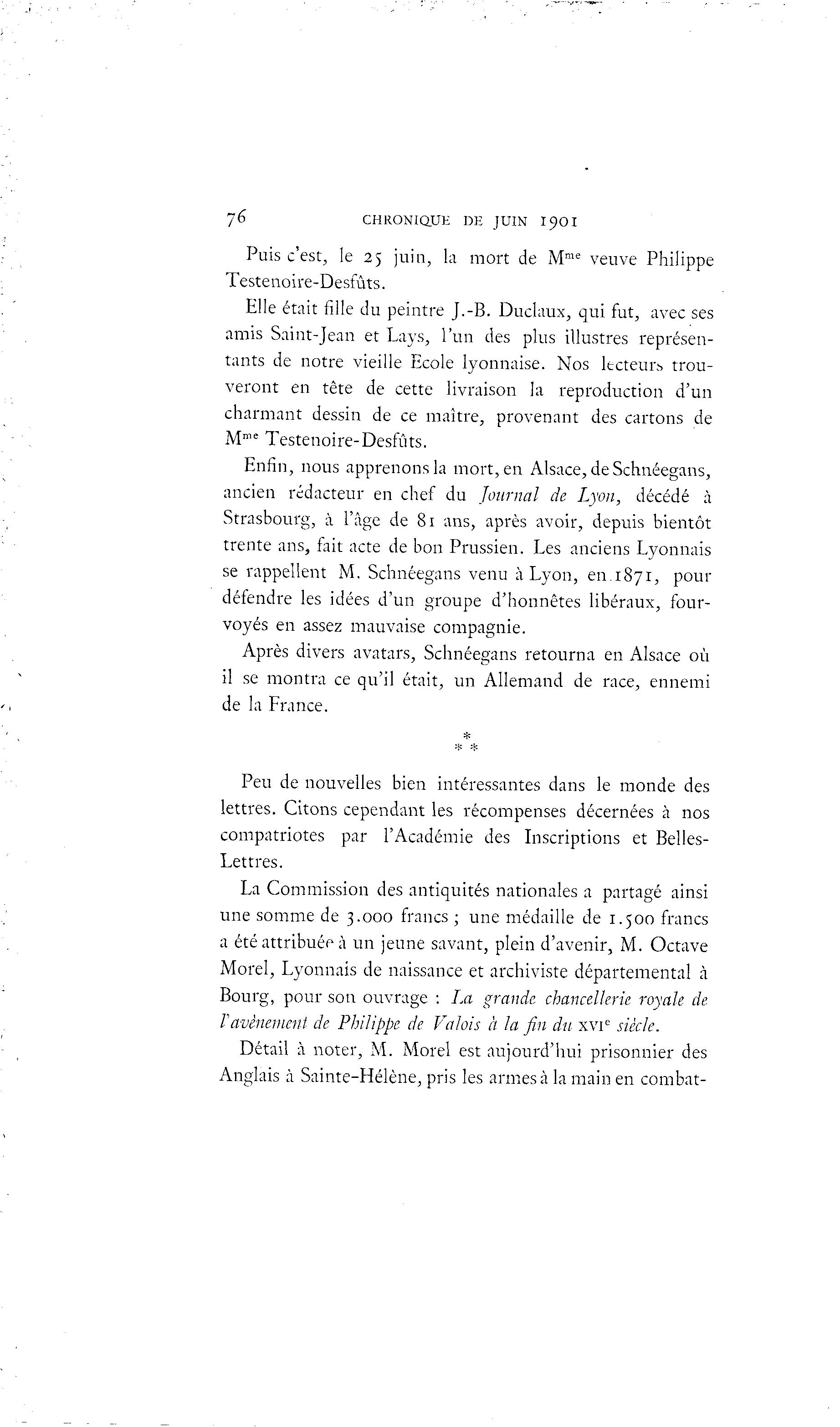 j6 CHRONIQUE DE JUIN I9OI Puis c'est, le 25 juin, la mort de Mme veuve Philippe Testenoire-Desfûts. Elle était fille du peintre J.-B. Duclaux, qui fut, avec ses amis Saint-Jean et Lays, l'un des plus illustres représen- tants de notre vieille Ecole lyonnaise. Nos lecteurs trou- veront en tête de cette livraison la reproduction d'un charmant dessin de ce maître, provenant des cartons de Mme Testenoire-Desfûts. Enfin, nous apprenons la mort, en Alsace, de Schnéegans, ancien rédacteur en chef du Journal de Lyon, décédé à Strasbourg, à l'âge de 81 ans, après avoir, depuis bientôt trente ans, fait acte de bon Prussien. Les anciens Lyonnais se rappellent M. Schnéegans venu à Lyon, en.1871, pour défendre les idées d'un groupe d'honnêtes libéraux, four- voyés en assez mauvaise compagnie. Après divers avatars, Schnéegans retourna en Alsace où il se montra ce qu'il était, un Allemand de race, ennemi de la France. Peu de nouvelles bien intéressantes dans le monde des lettres. Citons cependant les récompenses décernées à nos compatriotes par l'Académie des Inscriptions et Belles- Lettres. La Commission des antiquités nationales a partagé ainsi une somme de 3.000 francs ; une médaille de 1.500 francs a été attribuée à un jeune savant, plein d'avenir, M. Octave Morel, Lyonnais de naissance et archiviste départemental à Bourg, pour son ouvrage : La grande chancellerie royale de Favènement de Philippe de Valois à la fin du xvi e siècle. Détail à noter, M. Morel est aujourd'hui prisonnier des Anglais à Sainte-Hélène, pris les armes à la main en combat-