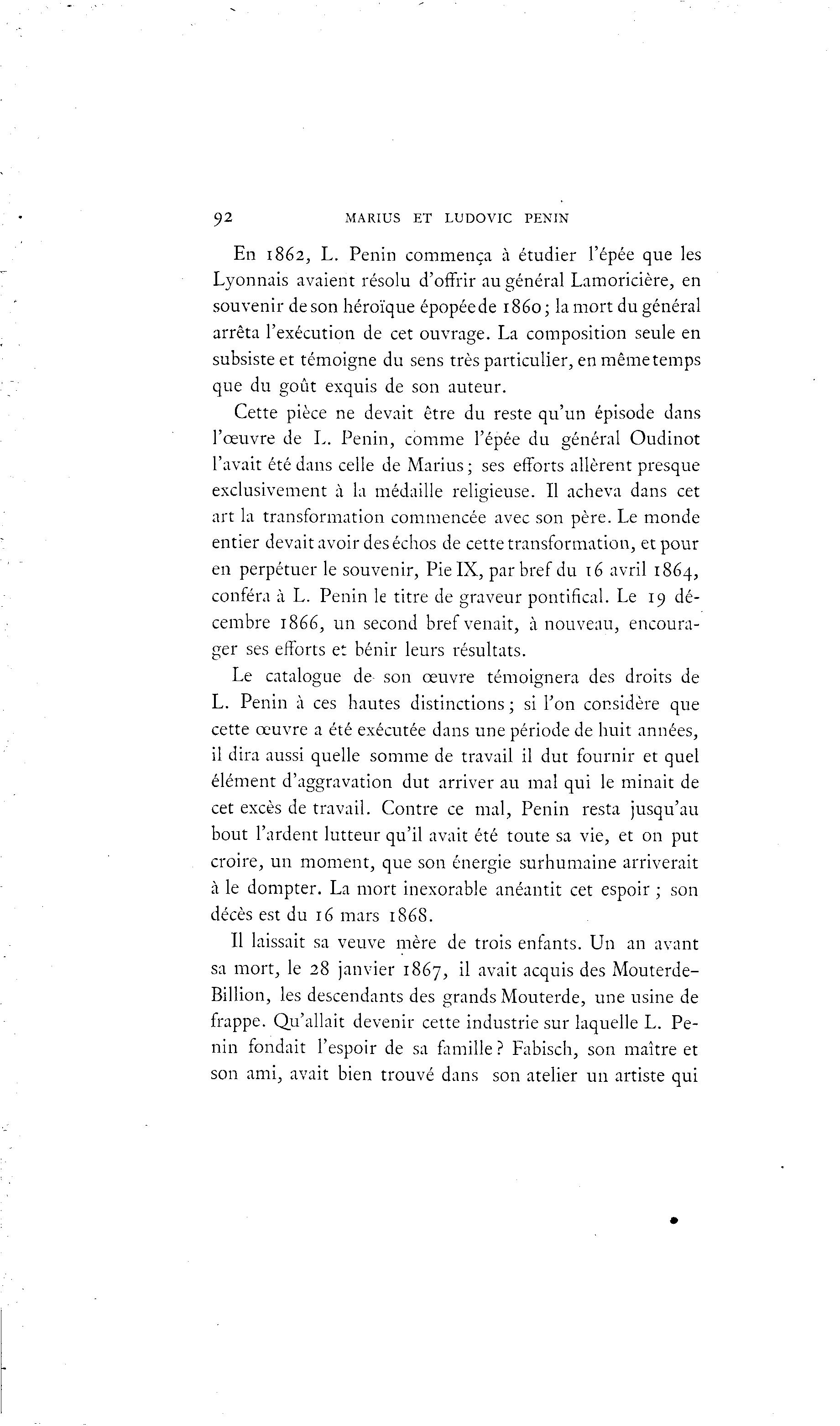 <)2 MARIUS ET LUDOVIC PENIN En 1862, L. Penin commença à étudier l'épée que les Lyonnais avaient résolu d'offrir au général Lamoricière, en souvenir deson héroïque épopéede 1860; la mort du général arrêta l'exécution de cet ouvrage. La composition seule en subsiste et témoigne du sens très particulier, en même temps que du goût exquis de son auteur. Cette pièce ne devait être du reste qu'un épisode dans l'œuvre de L. Penin, comme l'épée du général Oudinot l'avait été dans celle de Marius ; ses efforts allèrent presque exclusivement à la médaille religieuse. Il acheva dans cet art la transformation commencée avec son père. Le monde entier devait avoir des échos de cette transformation, et pour en perpétuer le souvenir, Pie IX, par bref du 16 avril 1864, conféra à L. Penin le titre de graveur pontifical. Le 19 dé- cembre 1866, un second bref venait, à nouveau, encoura- ger ses efforts et bénir leurs résultats. Le catalogue de son œuvre témoignera des droits de L. Penin à ces hautes distinctions ; si l'on considère que cette œuvre a été exécutée dans une période de huit années, il dira aussi quelle somme de travail il dut fournir et quel élément d'aggravation dut arriver au mal qui le minait de cet excès de travail. Contre ce mal, Penin resta jusqu'au bout l'ardent lutteur qu'il avait été toute sa vie, et on put croire, un moment, que son énergie surhumaine arriverait à le dompter. La mort inexorable anéantit cet espoir ; son décès est du 16 mars 1868. Il laissait sa veuve mère de trois enfants. Un an avant sa mort, le 28 janvier 1867, il avait acquis des Mouterde- Billion, les descendants des grands Mouterde, une usine de frappe. Qu'allait devenir cette industrie sur laquelle L. Pe- nin fondait l'espoir de sa famille ? Fabisch, son maître et son ami, avait bien trouvé dans son atelier un artiste qui