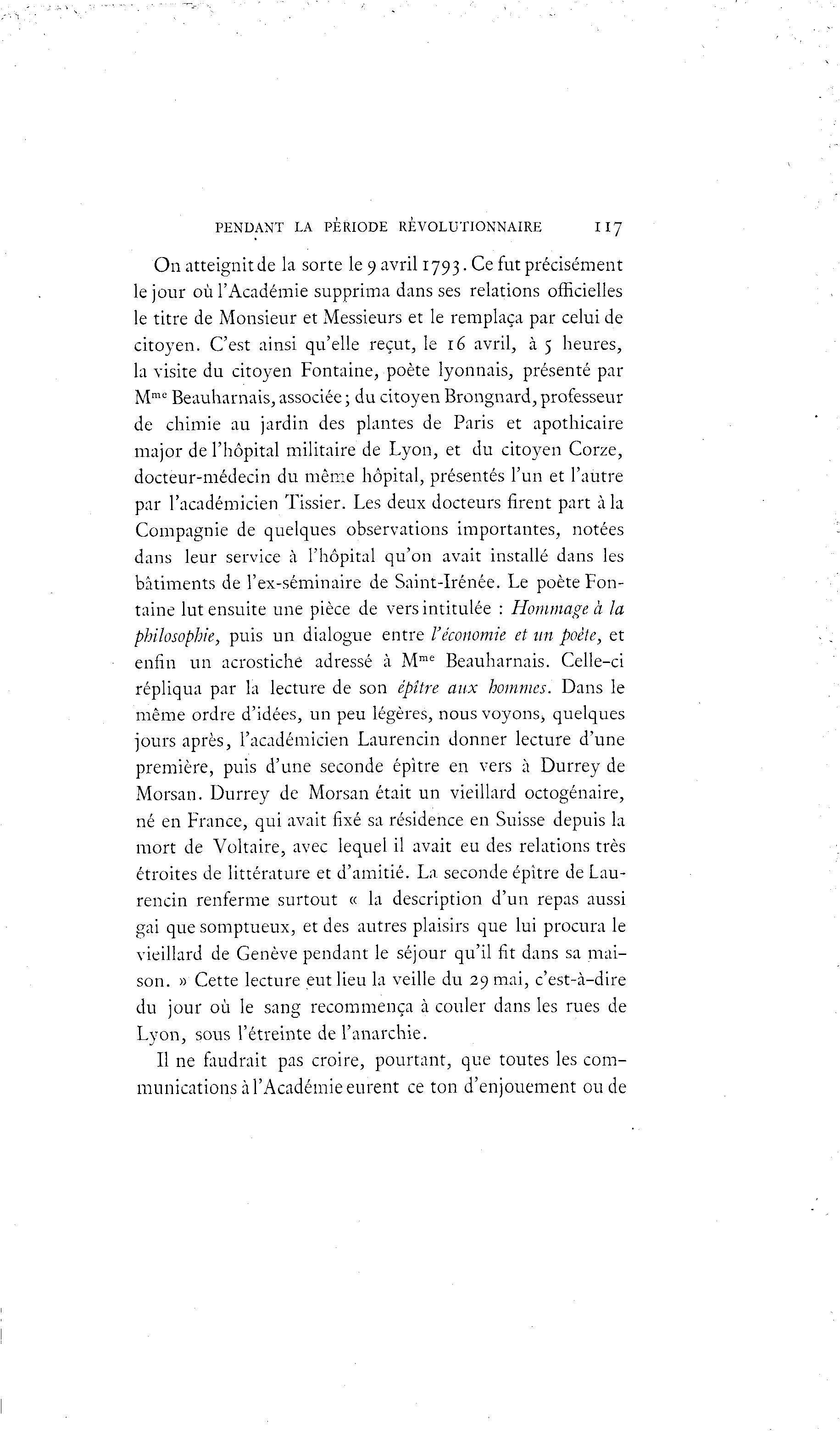 PENDANT LA PERIODE REVOLUTIONNAIRE II7 On atteignit de la sorte le 9 avril 1793. Ce fut précisément le jour où l'Académie supprima dans ses relations officielles le titre de Monsieur et Messieurs et le remplaça par celui de citoyen. C'est ainsi qu'elle reçut, le 16 avril, à 5 heures, la visite du citoyen Fontaine, poète lyonnais, présenté par Mme Beauharnais, associée ; du citoyen Brongnard, professeur de chimie au jardin des plantes de Paris et apothicaire major de l'hôpital militaire de Lyon, et du citoyen Corze, docteur-médecin du même hôpital, présentés l'un et l'autre par l'académicien Tissier. Les deux docteurs firent part à la Compagnie de quelques observations importantes, notées dans leur service à l'hôpital qu'on avait installé dans les bâtiments de l'ex-séminaire de Saint-Irénée. Le poète Fon- taine lut ensuite une pièce de vers intitulée : Hommage à la philosophie, puis un dialogue entre l'économie et un poète, et enfin un acrostiche adressé à Mme Beauharnais. Celle-ci répliqua par la lecture de son épître aux hommes. Dans le même ordre d'idées, un peu légères, nous voyons, quelques jours après, l'académicien Laurencin donner lecture d'une première, puis d'une seconde épître en vers à Durrey de Morsan. Durrey de Morsan était un vieillard octogénaire, né en France, qui avait fixé sa résidence en Suisse depuis la mort de Voltaire, avec lequel il avait eu des relations très étroites de littérature et d'amitié. La seconde épître de Lau- rencin renferme surtout « la description d'un repas aussi gai que somptueux, et des autres plaisirs que lui procura le vieillard de Genève pendant le séjour qu'il fit dans sa mai- son. » Cette lecture eut lieu la veille du 29 mai, c'est-à -dire du jour où le sang recommença à couler dans les rues de Lyon, sous l'étreinte de l'anarchie. Il ne faudrait pas croire, pourtant, que toutes les com- munications à l'Académie eurent ce ton d'enjouement ou de