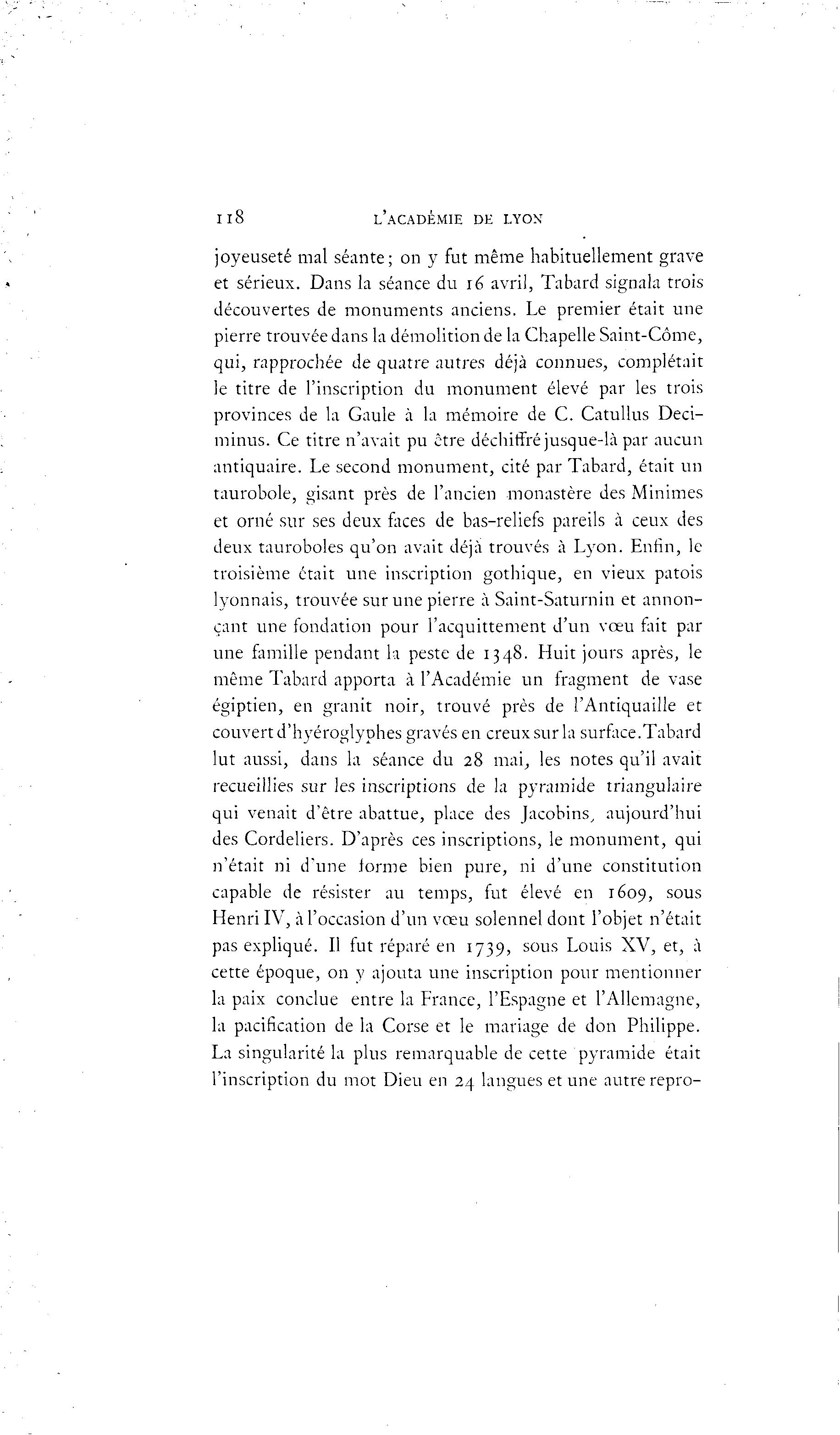 Il8 L'ACADÉMIE DE LYON joyeuseté mal séante; on y fut même habituellement grave et sérieux. Dans la séance du 16 avril, Tabard signala trois découvertes de monuments anciens. Le premier était une pierre trouvée dans la démolition de la Chapelle Saint-Côme, qui, rapprochée de quatre autres déjà connues, complétait le titre de l'inscription du monument élevé par les trois provinces de la Gaule à la mémoire de C. Catullus Deci- minus. Ce titre n'avait pu être déchiffré jusque-là par aucun antiquaire. Le second monument, cité par Tabard, était un taurobole, gisant près de l'ancien monastère des Minimes et orné sur ses deux faces de bas-reliefs pareils à ceux des deux tauroboles qu'on avait déjà trouvés à Lyon. Enfin, le troisième était une inscription gothique, en vieux patois lyonnais, trouvée sur une pierre à Saint-Saturnin et annon- çant une fondation pour l'acquittement d'un vœu fait par une famille pendant la peste de 1348. Huit jours après, le même Tabard apporta à l'Académie un fragment de vase égiptien, en granit noir, trouvé près de l'Antiquaille et couvert d'hyéroglyphes gravés en creux sur la surface.Tabard lut aussi, dans la séance du 28 mai, les notes qu'il avait recueillies sur les inscriptions de la pyramide triangulaire qui venait d'être abattue, place des Jacobins, aujourd'hui des Cordeliers. D'après ces inscriptions, le monument, qui n'était ni d'une forme bien pure, ni d'une constitution capable de résister au temps, fut élevé en 1609, sous Henri IV, à l'occasion d'un vœu solennel dont l'objet n'était pas expliqué. Il fut réparé en 1739, sous Louis XV, et, à cette époque, on y ajouta une inscription pour mentionner la paix conclue entre la France, l'Espagne et l'Allemagne, la pacification de la Corse et le mariage de don Philippe. La singularité la plus remarquable de cette pyramide était l'inscription du mot Dieu en 24 langues et une autre repro-