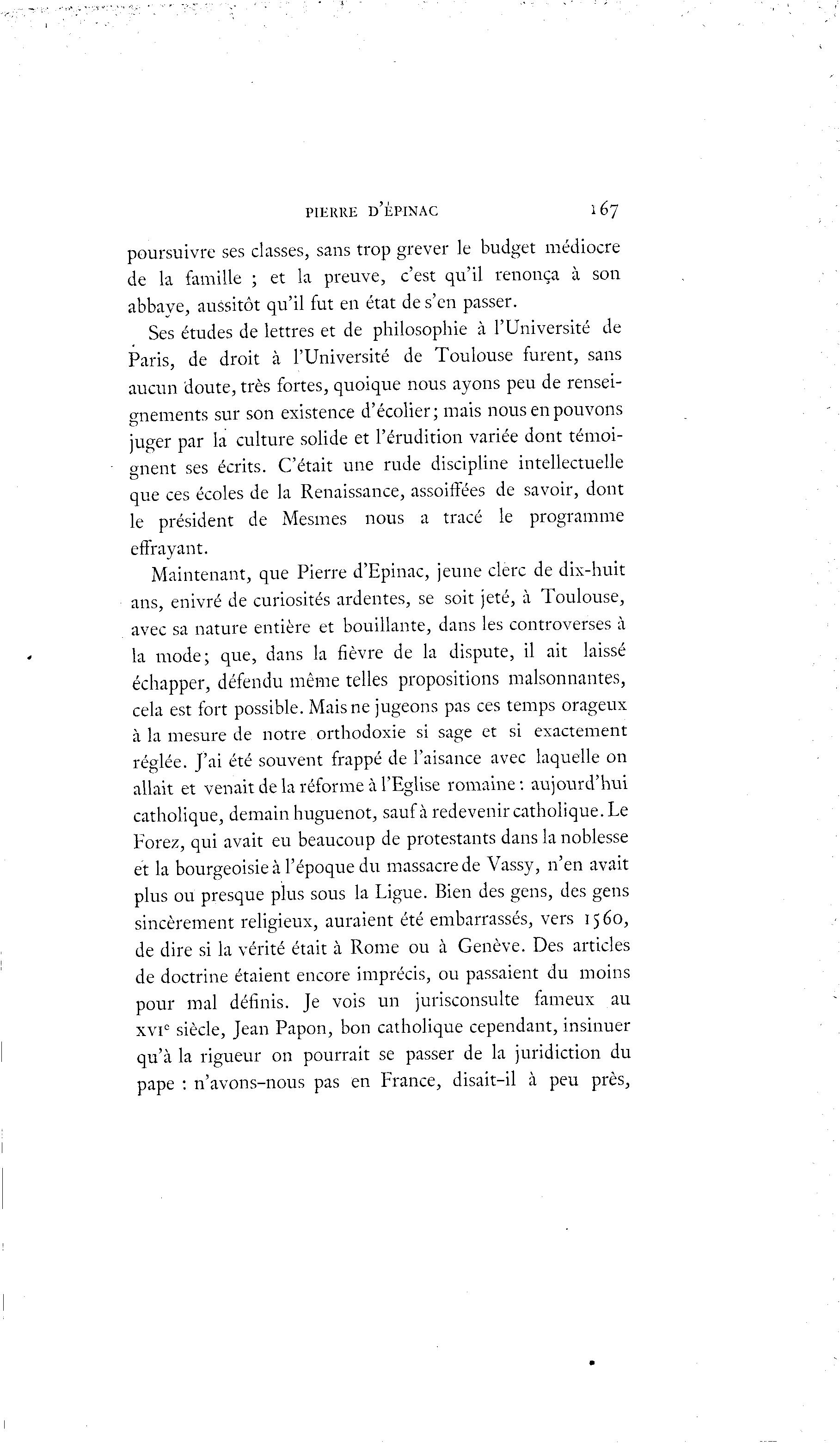 PIERRE D'ÈPINAC 1 67 poursuivre ses classes, sans trop grever le budget médiocre de la famille ; et la preuve, c'est qu'il renonça à son abbaye, aussitôt qu'il fut en état de s'en passer. Ses études de lettres et de philosophie à l'Université de Paris, de droit à l'Université de Toulouse furent, sans aucun doute, très fortes, quoique nous ayons peu de rensei- gnements sur son existence d'écolier; mais nous en pouvons juger par la culture solide et l'érudition variée dont témoi- gnent ses écrits. C'était une rude discipline intellectuelle que ces écoles de la Renaissance, assoiffées de savoir, dont le président de Mesures nous a tracé le programme effrayant. Maintenant, que Pierre d'Epinac, jeune clerc de dix-huit ans, enivré de curiosités ardentes, se soit jeté, à Toulouse, avec sa nature entière et bouillante, dans les controverses à la mode; que, dans la fièvre de la dispute, il ait laissé échapper, défendu même telles propositions malsonnantes, cela est fort possible. Mais ne jugeons pas ces temps orageux à la mesure de notre orthodoxie si sage et si exactement réglée. J'ai été souvent frappé de l'aisance avec laquelle on allait et venait de la réforme à l'Eglise romaine: aujourd'hui catholique, demain huguenot, sauf à redevenir catholique. Le Forez, qui avait eu beaucoup de protestants dans la noblesse et la bourgeoisie à l'époque du massacre de Vassy, n'en avait plus ou presque plus sous la Ligue. Bien des gens, des gens sincèrement religieux, auraient été embarrassés, vers 1560, de dire si la vérité était à Rome ou à Genève. Des articles de doctrine étaient encore imprécis, ou passaient du moins pour mal définis. Je vois un jurisconsulte fameux au xvi c siècle, Jean Papon, bon catholique cependant, insinuer qu'à la rigueur on pourrait se passer de la juridiction du pape : n'avons-nous pas en France, disait-il à peu près,