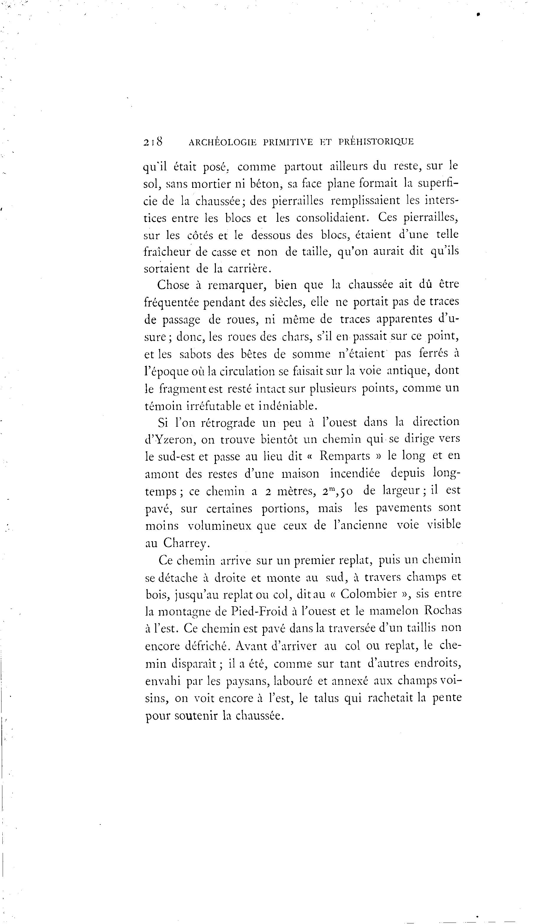 2 I8 ARCHÉOLOGIE PRIMITIVE ET PREHISTORIQUE qu'il était posé, comme partout ailleurs du reste, sur le sol, sans mortier ni béton, sa face plane formait la superfi- cie de la chaussée; des pierrailles remplissaient les inters- tices entre les blocs et les consolidaient. Ces pierrailles, sur les côtés et le dessous des blocs, étaient d'une telle fraîcheur de casse et non de taille, qu'on aurait dit qu'ils sortaient de la carrière. Chose à remarquer, bien que la chaussée ait dû être fréquentée pendant des siècles, elle ne portait pas de traces de passage de roues, ni même de traces apparentes d'u- sure; donc, les roues des chars, s'il en passait sur ce point, et les sabots des bêtes de somme n'étaient pas ferrés à l'époque où la circulation se faisait sur la voie antique, dont le fragment est resté intact sur plusieurs points, comme un témoin irréfutable et indéniable. Si l'on rétrograde un peu à l'ouest dans la direction d'Yzeron, on trouve bientôt un chemin qui se dirige vers le sud-est et passe au lieu dit « Remparts » le long et en amont des restes d'une maison incendiée depuis long- temps ; ce chemin a 2 mètres, 2 m ,50 de largeur; il est pavé, sur certaines portions, mais les pavements sont moins volumineux que ceux de l'ancienne voie visible au Charrey. Ce chemin arrive sur un premier replat, puis un chemin se détache à droite et monte au sud, à travers champs et bois, jusqu'au replat ou col, dit au « Colombier », sis entre la montagne de Pied-Froid à l'ouest et le mamelon Rochas à l'est. Ce chemin est pavé dans la traversée d'un taillis non encore défriché. Avant d'arriver au col ou replat, le che- min disparaît ; il a été, comme sur tant d'autres endroits, envahi par les paysans, labouré et annexé aux champs voi- sins, on voit encore à l'est, le talus qui rachetait la pente pour soutenir la chaussée.