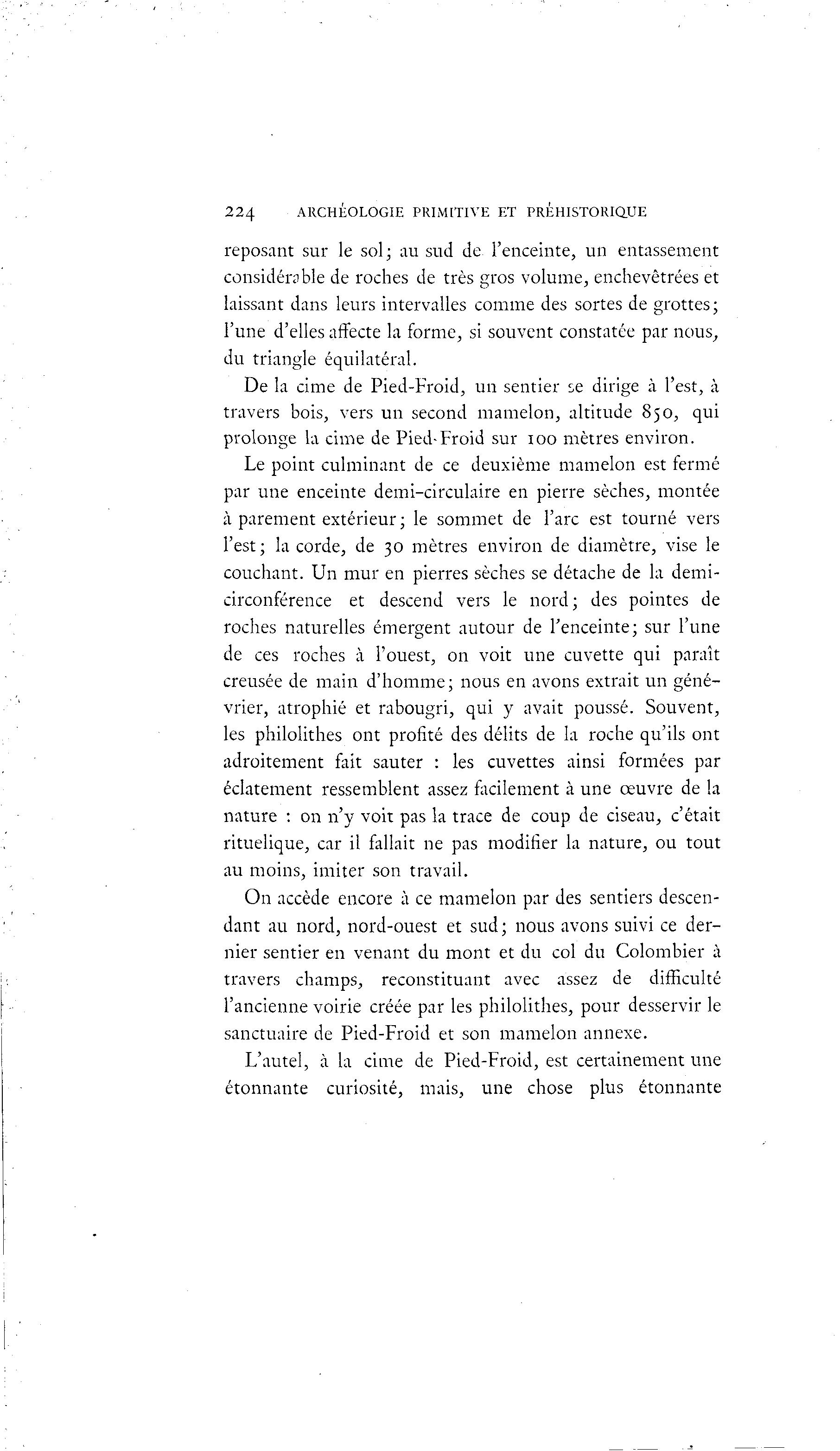 224 ARCHÉOLOGIE PRIMITIVE ET PREHISTORIQUE reposant sur le sol; au sud de l'enceinte, un entassement considérable de roches de très gros volume, enchevêtrées et laissant dans leurs intervalles comme des sortes de grottes; l'une d'elles affecte la forme, si souvent constatée par nous, du triangle équilatéral. De la cime de Pied-Froid, un sentier se dirige à l'est, à travers bois, vers un second mamelon, altitude 850, qui prolonge la cime de Pied-Froid sur 100 mètres environ. Le point culminant de ce deuxième mamelon est fermé par une enceinte demi-circulaire en pierre sèches, montée à parement extérieur ; le sommet de l'arc est tourné vers l'est; la corde, de 30 mètres environ de diamètre, vise le couchant. Un mur en pierres sèches se détache de la demi- circonférence et descend vers le nord; des pointes de roches naturelles émergent autour de l'enceinte; sur l'une de ces roches à l'ouest, on voit une cuvette qui paraît creusée de main d'homme; nous en avons extrait un gené- vrier, atrophié et rabougri, qui y avait poussé. Souvent, les philolithes ont profité des délits de la roche qu'ils ont adroitement fait sauter : les cuvettes ainsi formées par éclatement ressemblent assez facilement à une oeuvre de la nature : on n'y voit pas la trace de coup de ciseau, c'était rituelique, car il fallait ne pas modifier la nature, ou tout au moins, imiter son travail. On accède encore à ce mamelon par des sentiers descen- dant au nord, nord-ouest et sud; nous avons suivi ce der- nier sentier en venant du mont et du col du Colombier à travers champs, reconstituant avec assez de difficulté l'ancienne voirie créée par les philolithes, pour desservir le sanctuaire de Pied-Froid et son mamelon annexe. L'autel, à la cime de Pied-Froid, est certainement une étonnante curiosité, mais, une chose plus étonnante