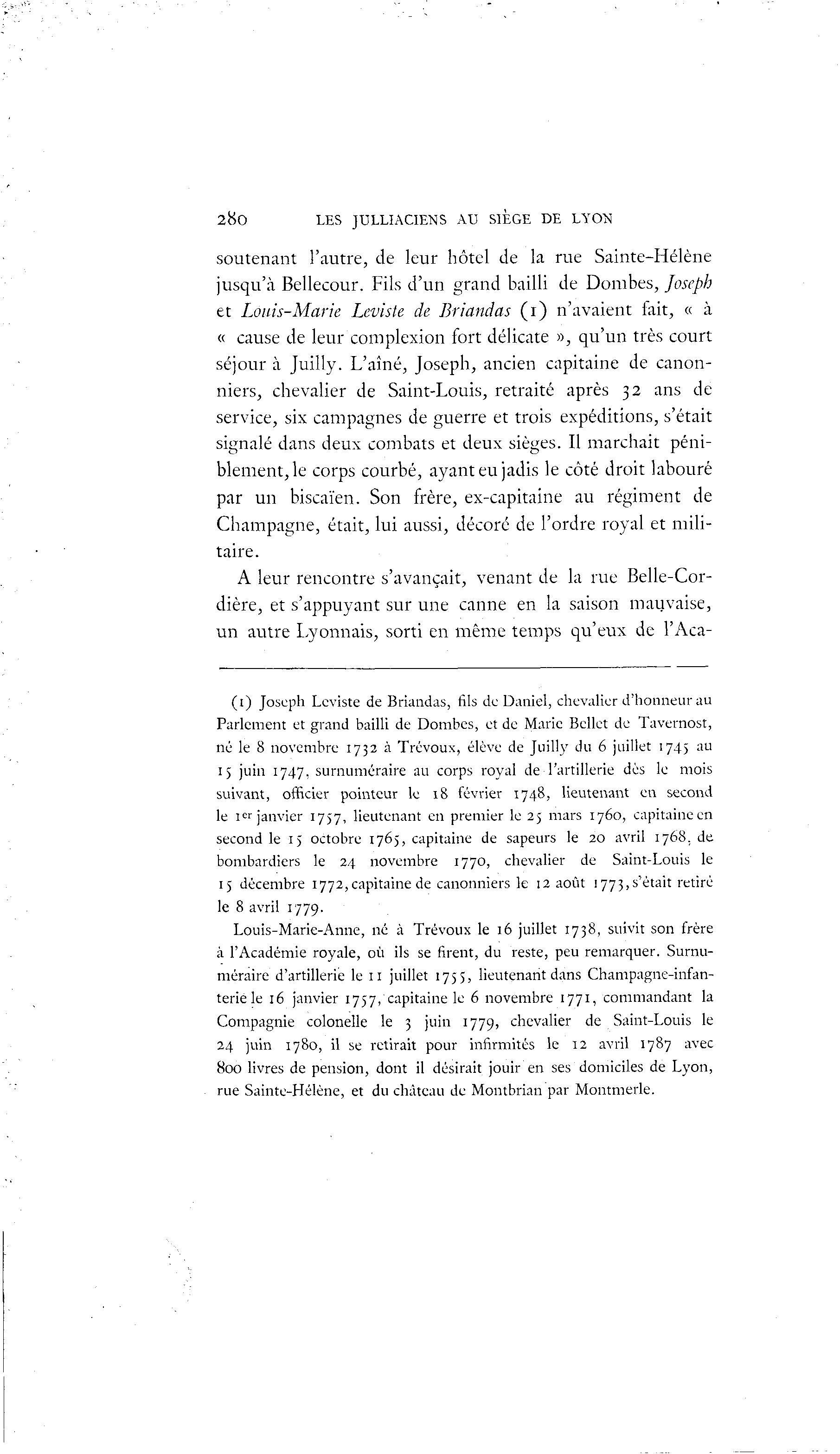 280 LES JULLIACIENS AU SIEGE DE LYON soutenant l'autre, de leur hôtel de la rue Sainte-Hélène jusqu'à Bellecour. Fils d'un grand bailli de Dombes, Joseph et Louis-Marie Levisle de Briandas ( i ) n'avaient fait, « à « cause de leur complexion fort délicate », qu'un très court séjour à Juilly. L'aîné, Joseph, ancien capitaine de canon- niers, chevalier de Saint-Louis, retraité après 32 ans de service, six campagnes de guerre et trois expéditions, s'était signalé dans deux combats et deux sièges. Il marchait péni- blement, le corps courbé, ayant eu jadis le côté droit labouré par un biscaïen. Son frère, ex-capitaine au régiment de Champagne, était, lui aussi, décoré de l'ordre royal et mili- taire. A leur rencontre s'avançait, venant de la rue Belle-Cor- dière, et s'appuyant sur une canne en la saison mauvaise, un autre Lyonnais, sorti en même temps qu'eux de l'Aea- (1) Joseph Leviste de Briandas, fils de Daniel, chevalier d'honneur au Parlement et grand bailli de Dombes, et de Marie Bcllct de Tavernost, né le 8 novembre 1732 à Trévoux, élève de Juilly du 6 juillet 1745 au 15 juin 1747, surnuméraire au corps royal de l'artillerie dés le mois suivant, officier pointeur le 18 février 1748, lieutenant en second le i c r janvier 1757, lieutenant en premier le 25 mars 1760, capitaine en second le 15 octobre 1765, capitaine de sapeurs le 20 avril 1768, de bombardiers le 24 novembre 1770, chevalier de Saint-Louis le 15 décembre 1772, capitaine de canonniers le 12 août 1773,s'était retiré le 8 avril 1779. Louis-Marie-Anne, né à Trévoux le 16 juillet 1738, suivit son frère à l'Académie royale, où ils se firent, du reste, peu remarquer. Surnu- méraire d'artillerie le 11 juillet 1755, lieutenant dans Champagne-infan- terie le 16 janvier 1757, capitaine le 6 novembre 1771, commandant la Compagnie colonelle le 3 juin 1779, chevalier de Saint-Louis le 24 juin 1780, il se retirait pour infirmités le 12 avril 1787 avec 800 livres de pension, dont il désirait jouir en ses domiciles de Lyon, rue Sainte-Hélène, et du château de Montbrian par Montmerle.