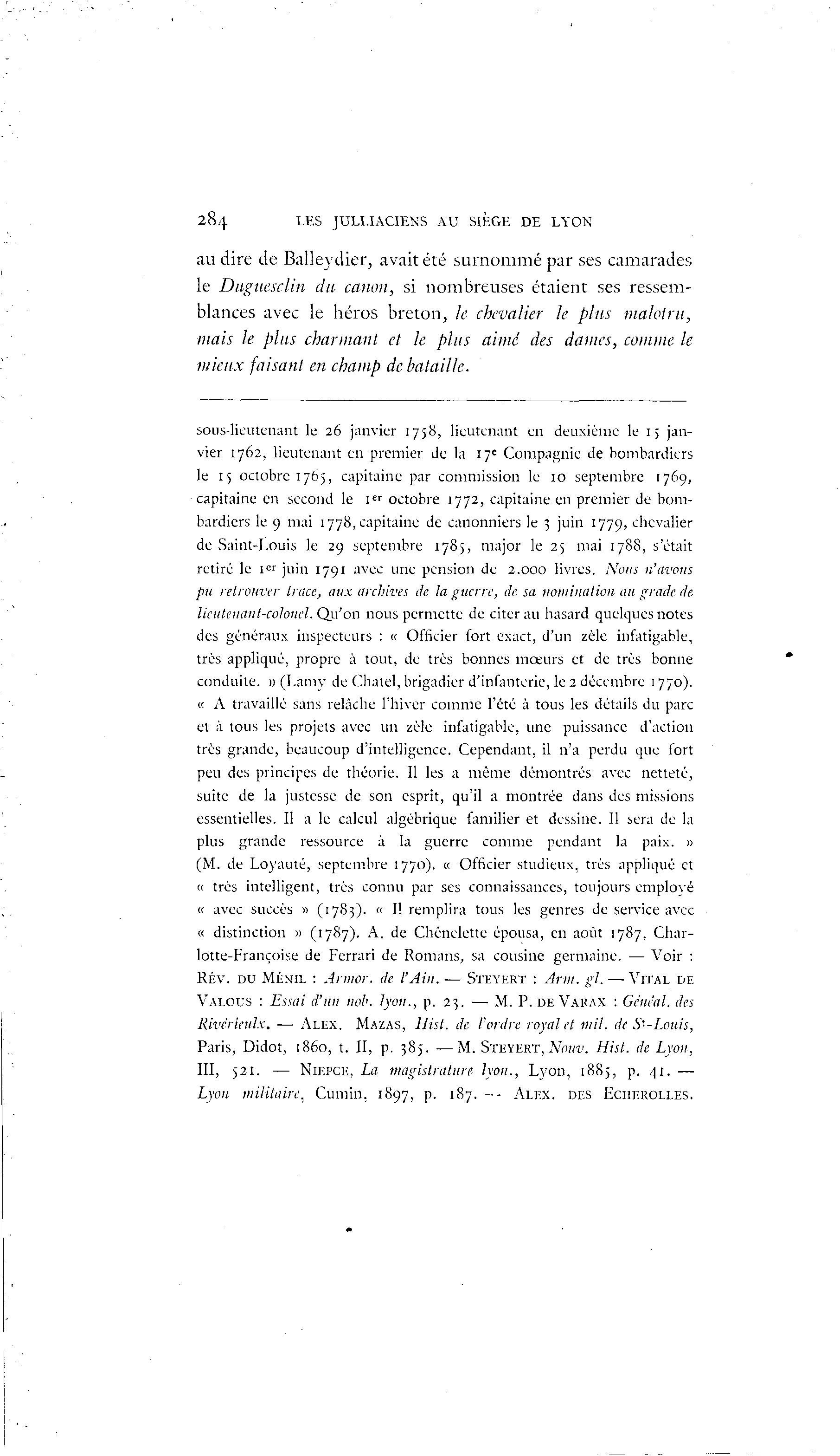 284 LES JULLIACIENS AU SIEGE DE LYON au dire de Balleydier, avait été surnommé par ses camarades le Duguesclin du canon, si nombreuses étaient ses ressem- blances avec le héros breton, le chevalier le pins malotru, mais le plus charmant et le plus aimé des dames, comme le mieux faisant en champ de bataille. sous-lieutenant le 26 janvier 1758, lieutenant en deuxième le 15 jan- vier 1762, lieutenant en premier de la 17e Compagnie de bombardiers le 15 octobre 1765, capitaine par commission le 10 septembre 1769, capitaine en second le i c r octobre 1772, capitaine en premier de bom- bardiers le 9 mai 1778, capitaine de canonniers le 3 juin 1779, chevalier de Saint-Louis le 29 septembre 1785, major le 25 mai 1788, s'était retiré le I e r juin 1791 avec une pension de 2.000 livres. Nous n'avons pu retrouver trace, aux archives de, la guerre, de sa nomination au grade de lieutenant-colonel. Qu'on nous permette de citerait hasard quelques notes des généraux inspecteurs : « Officier fort exact, d'un zèle infatigable, très appliqué, propre à tout, de très bonnes mœurs et de très bonne conduite. » (Lamv de Chatel, brigadier d'infanterie, le 2 décembre 1770). « A travaillé sans relâche l'hiver comme l'été à tous les détails du parc et à tous les projets avec un zèle infatigable, une puissance d'action très grande, beaucoup d'intelligence. Cependant, il n'a perdu que fort peu des principes de théorie. Il les a même démontrés avec netteté, suite de la justesse de son esprit, qu'il a montrée dans des missions essentielles. Il a le calcul algébrique familier et dessine. Il sera de la plus grande ressource à la guerre comme pendant la paix. » (M. de Loyauté, septembre 1770). « Officier studieux, très appliqué et « très intelligent, très connu par ses connaissances, toujours employé « avec succès » (1783). « I! remplira tous les genres de service avec « distinction » (1787). A. de Chênelette épousa, en août 1787, Char- lotte-Françoise de Ferrari de Romans, sa cousine germaine. — Voir : RÉv. DU MÉX'IL : Armor. de l'Ain. — STEYERT : Ann. gl. — VITAL DE VALOUS : Essai d'un nob. lyon., p. 23. — M. P. DE VARAX : Ge'neal. des Rive'rieulx. — ALEX. MAZAS, Hist. de l'ordre royal et mil. de Sl-Louis, Paris, Didot, 1860, t. II, p. 385. •—M. STEYERT, NOUV. Hist. de Lyon, III, 521. — NIEPCE, La magistrature lyon., Lyon, 1885, p. 41. — Lyon militaire, Cumin, 1897, p. 187. — ALEX, DES ECHEROLLES.