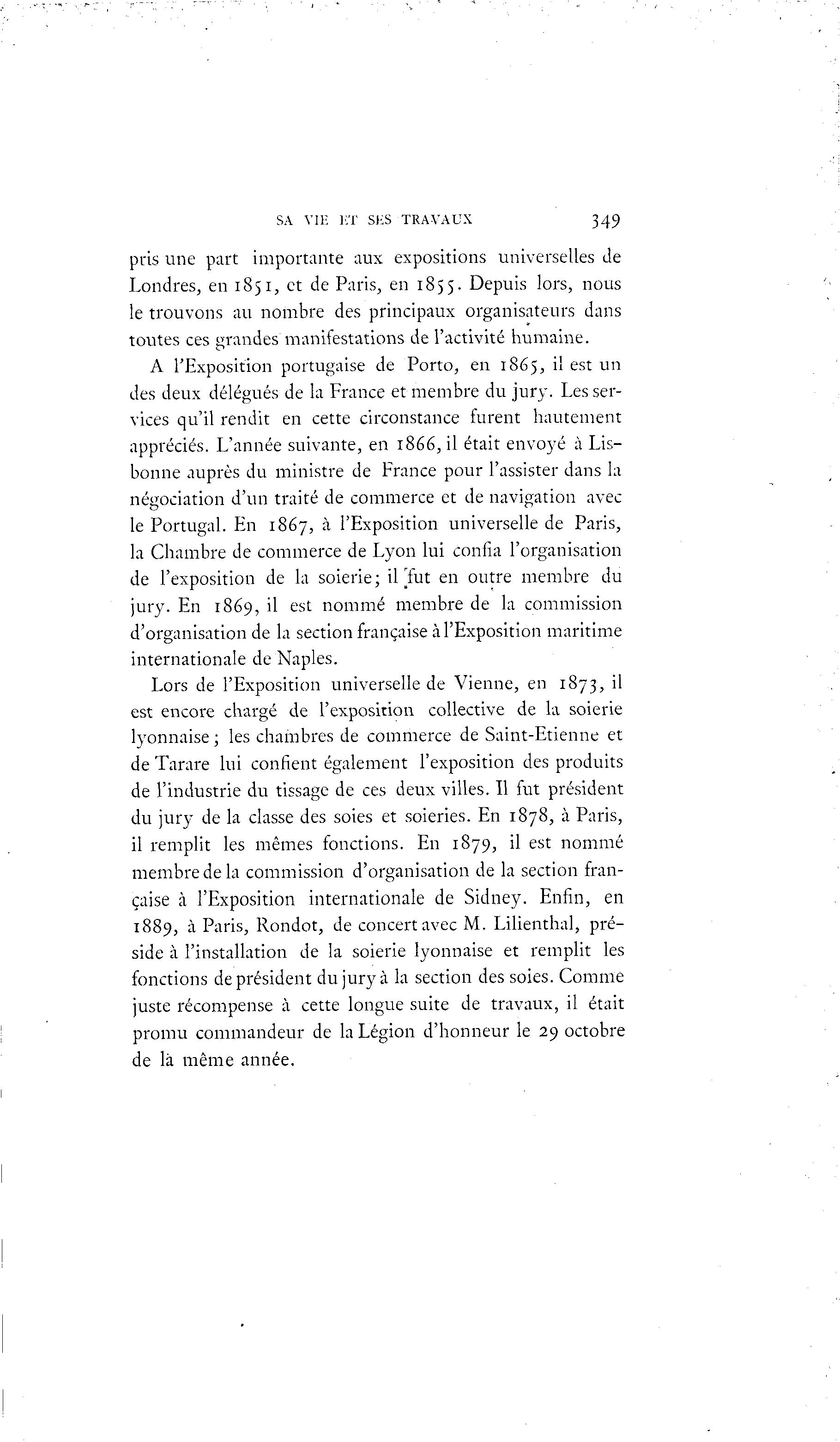 SA VIE ET SES TRAVAUX 349 pris une part importante aux expositions universelles de Londres, en 1851, et de Paris, en 1855. Depuis lors, nous le trouvons au nombre des principaux organisateurs dans toutes ces grandes manifestations de l'activité humaine. A l'Exposition portugaise de Porto, en 1865, il est un des deux délégués de la France et membre du jury. Les ser- vices qu'il rendit en cette circonstance furent hautement appréciés. L'année suivante, en 1866, il était envoyé à Lis- bonne auprès du ministre de France pour l'assister dans la négociation d'un traité de commerce et de navigation avec le Portugal. En 1867, à l'Exposition universelle de Paris, la Chambre de commerce de Lyon lui confia l'organisation de l'exposition de la soierie; il Tut en outre membre du jury. En 1869, il est nommé membre de la commission d'organisation de la section française à l'Exposition maritime internationale de Naples. Lors de l'Exposition universelle de Vienne, en 1873, il est encore chargé de l'exposition collective de la soierie lyonnaise ; les chambres de commerce de Saint-Etienne et de Tarare lui confient également l'exposition des produits de l'industrie du tissage de ces deux villes. Il fut président du jury de la classe des soies et soieries. En 1878, à Paris, il remplit les mêmes fonctions. En 1879, il est nommé membre de la commission d'organisation de la section fran- çaise à l'Exposition internationale de Sidney. Enfin, en 1889, à Paris, Rondot, de concert avec M. Lilienthal, pré- side à l'installation de la soierie lyonnaise et remplit les fonctions de président du jury à la section des soies. Comme juste récompense à cette longue suite de travaux, il était promu commandeur de la Légion d'honneur le 29 octobre de là même année.