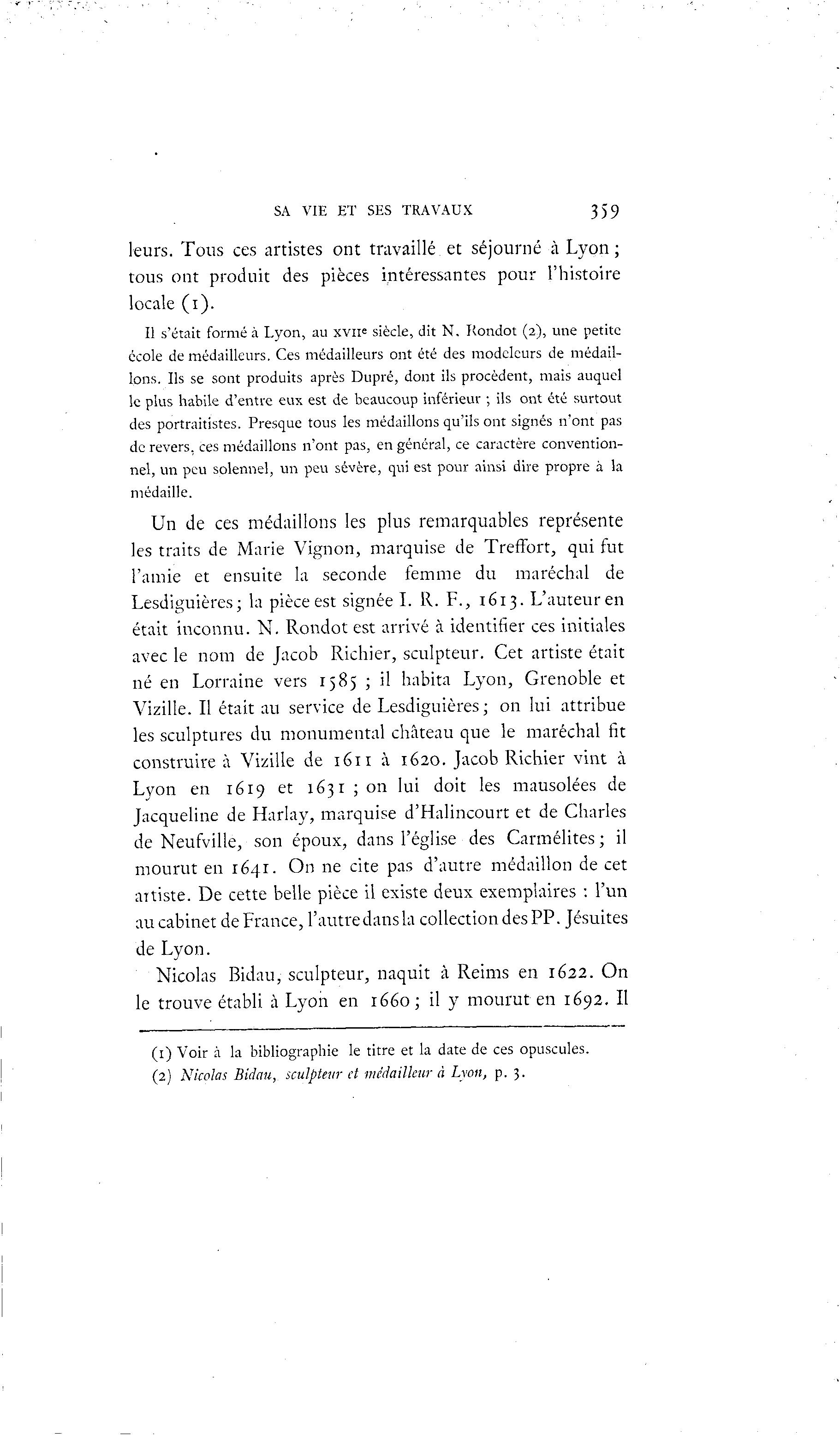 SA VIE ET SES TRAVAUX 359 leurs. Tous ces artistes ont travaillé et séjourné à Lyon ; tous ont produit des pièces intéressantes pour l'histoire locale (1). Il s'était formé à Lyon, au xvn= siècle, dit N . Rondot (2), une petite école de médailleurs. Ces médailleurs ont été des modeleurs de médail- lons. Ils se sont produits après Dupré, dont ils procèdent, mais auquel le plus habile d'entre eux est de beaucoup inférieur ; ils ont été surtout des portraitistes. Presque tous les médaillons qu'ils ont signés n'ont pas de revers, ces médaillons n'ont pas, en général, ce caractère convention- nel, un peu solennel, un peu sévère, qui est pour ainsi dire propre à la médaille. Un de ces médaillons les plus remarquables représente les traits de Marie Vignon, marquise de Treffort, qui fut l'amie et ensuite la seconde femme du maréchal de Lesdiguières ; la pièce est signée I. II. F., 1613. L'auteur en était inconnu. N . Rondot est arrivé à identifier ces initiales avec le nom de Jacob Richier, sculpteur. Cet artiste était né en Lorraine vers 1585 ; il habita Lyon, Grenoble et Vizille. Il était au service de Lesdiguières; on lui attribue les sculptures du monumental château que le maréchal fit construire à Vizille de 1611 à 1620. Jacob Richier vint à Lyon en 1619 et 1631 ; on lui doit les mausolées de Jacqueline de Harlay, marquise d'Halincourt et de Charles de Neufville, son époux, dans l'église des Carmélites ; il mourut en 1641. On ne cite pas d'autre médaillon de cet artiste. De cette belle pièce il existe deux exemplaires : l'un au cabinet de France, l'autre dans la collection des PP. Jésuites de Lyon. Nicolas Bidau, sculpteur, naquit à Reims en 1622. On le trouve établi à Lyon en 1660; il y mourut en 1692. Il (1) Voir à la bibliographie le titre et la date de ces opuscules. (2) Nicolas Bidau, sculpteur et médaillear à Lyon, p. 3.