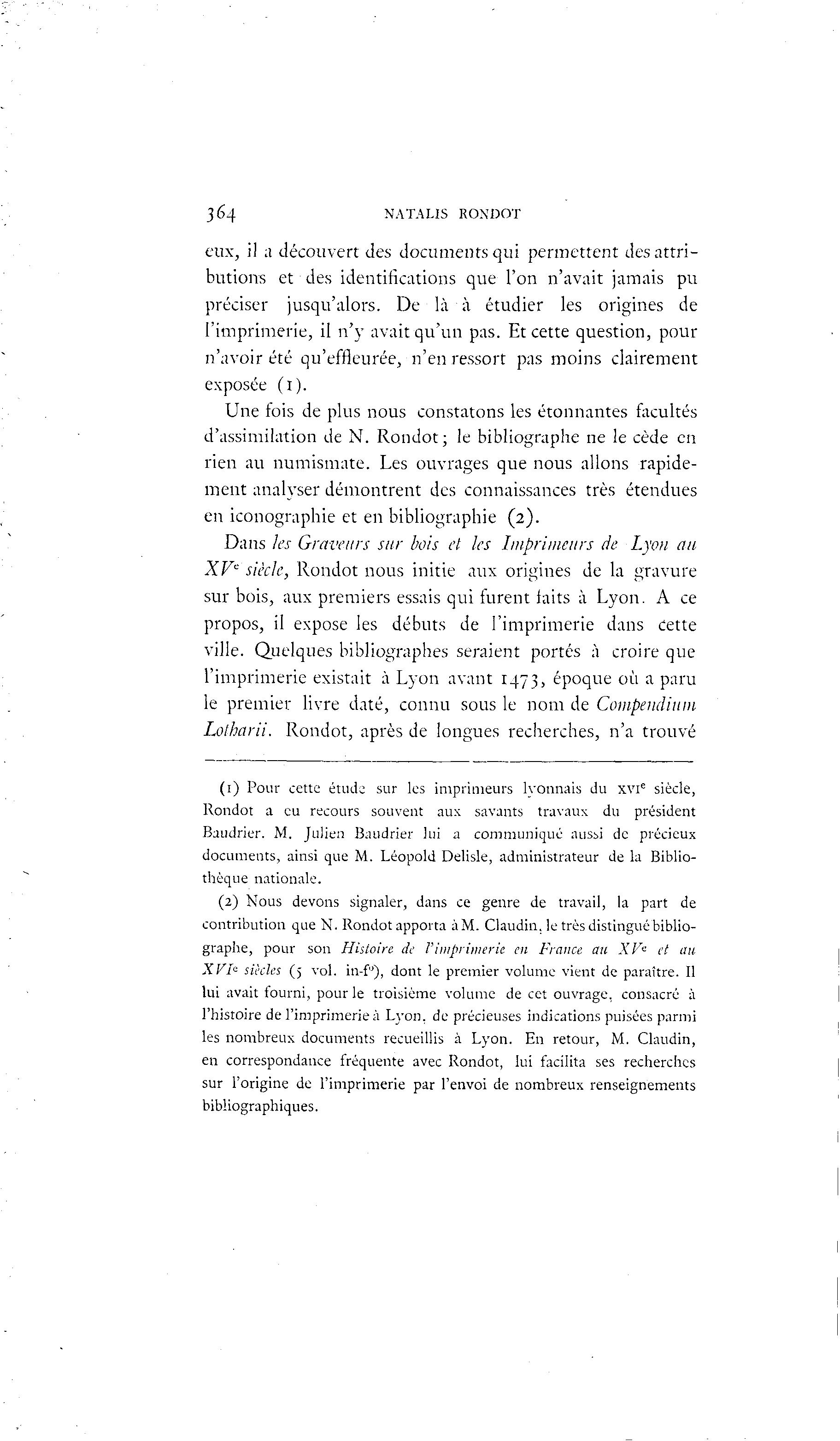 364 NATAUS RONDOT eux, il a découvert des documents qui permettent des attri- butions et des identifications que l'on n'avait jamais pu préciser jusqu'alors. De là à étudier les origines de l'imprimerie, il n'y avait qu'un pas. Et cette question, pour n'avoir été qu'effleurée, n'en ressort pas moins clairement exposée (1). Une fois de plus nous constatons les étonnantes facultés d'assimilation de N. Rondot; le bibliographe ne le cède en rien au numismate. Les ouvrages que nous allons rapide- ment analyser démontrent des connaissances très étendues en iconographie et en bibliographie (2). Dans les Graveurs sur bois et les Imprimeurs de Lyon au XVe siècle, Rondot nous initie aux origines de la gravure sur bois, aux premiers essais qui furent faits à Lyon. A ce propos, il expose les débuts de l'imprimerie dans cette ville. Quelques bibliographes seraient portés à croire que l'imprimerie existait à Lyon avant 1473, époque où a paru le premier livre daté, connu sous le nom de Compenà ium Lolharii. Rondot, après de longues recherches, n'a trouvé (1) Pour cette étude sur les imprimeurs lvonnais du xvi e siècle, Rondot a eu recours souvent aux savants travaux du président Baudrier. M. Julien Baudrier lui a communiqué aussi de précieux documents, ainsi que M. Léopold Delisle, administrateur de la Biblio- thèque nationale. (2) Nous devons signaler, dans ce genre de travail, la part de contribution que N. Rondot apporta à M. Claudin, le très distingué biblio- graphe, pour son Histoire de l'imprimerie en France au XV' et au XVI" siècles (5 vol. in-f"), dont le premier volume vient de paraître. Il lui avait fourni, pour le troisième volume de cet ouvrage, consacré à l'histoire de l'imprimerie à Lyon, de précieuses indications puisées parmi les nombreux documents recueillis à Lyon. En retour, M. Claudin, en correspondance fréquente avec Rondot, lui facilita ses recherches sur l'origine de l'imprimerie par l'envoi de nombreux renseignements bibliographiques.