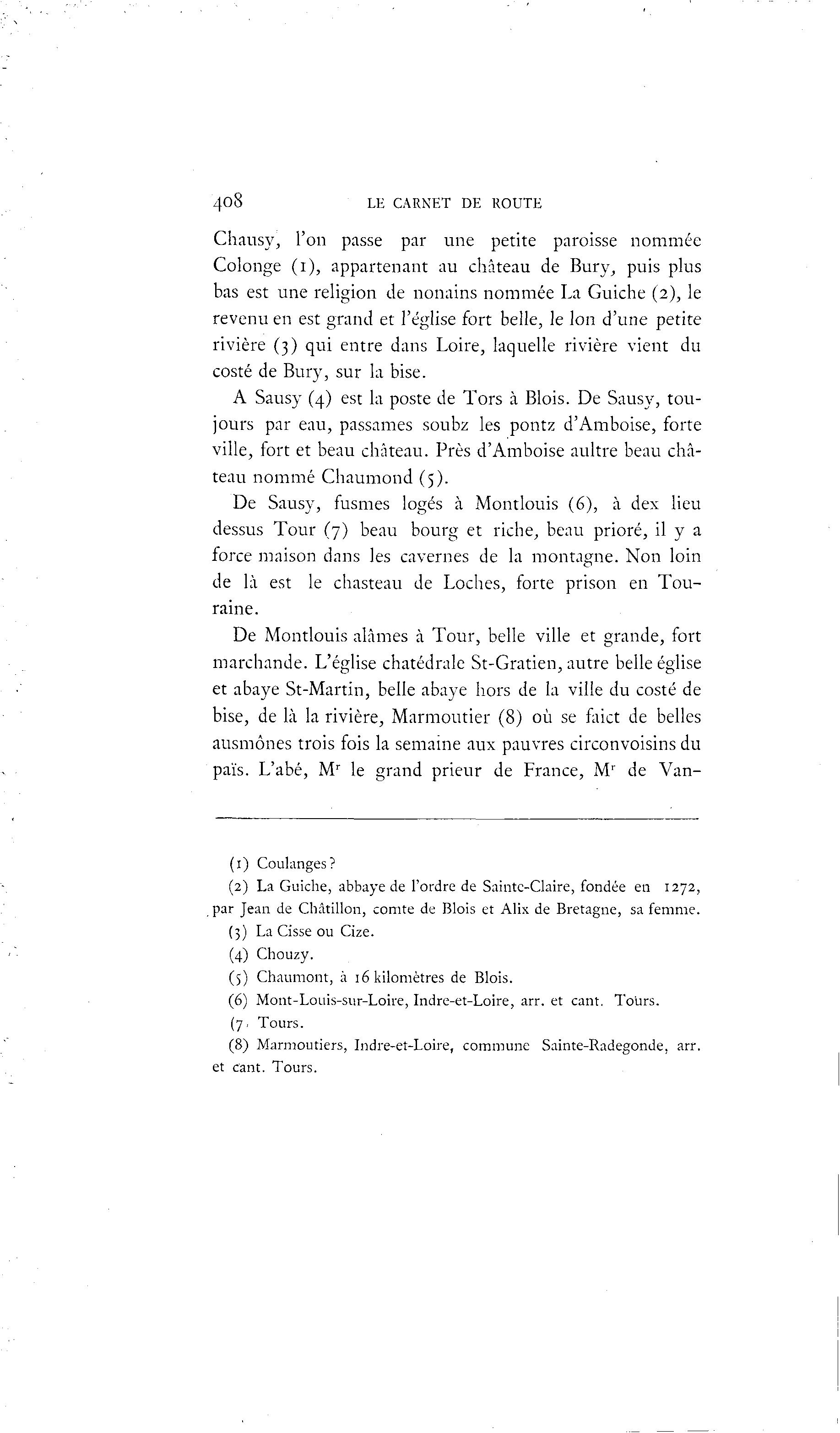 408 LE CARNET DE ROUTE Chausy, l'on passe par une petite paroisse nommée Colonge (i), appartenant au château de Bury, puis plus bas est une religion de nonains nommée La Guiche (2), le revenu en est grand et l'église fort belle, le Ion d'une petite rivière (3) qui entre dans Loire, laquelle rivière vient du costé de Bury, sur la bise. A Sausy (4) est la poste de Tors à Blois. De Sausy, tou- jours par eau, passâmes soubz les pontz d'Amboise, forte ville, fort et beau château. Près d'Amboise aultre beau châ- teau nommé Chaumond (5). De Sausy, fusmes logés à Montlouis (6), à dex lieu dessus Tour (7) beau bourg et riche, beau prioré, il y a force maison dans les cavernes de la montagne. Non loin de là est le chasteau de Loches, forte prison en Tou- raine. De Montlouis alâmes à Tour, belle ville et grande, fort marchande. L'église chatédrale St-Gratien, autre belle église et abaye St-Martin, belle abaye hors de la ville du costé de bise, de là la rivière, Marmoutier (8) où se faict de belles ausmônes trois fois la semaine aux pauvres circonvoisins du païs. L'abé, Mr le grand prieur de France, Mr de Van- (1) Coulanges? (2) La Guiche, abbaye de l'ordre de Sainte-Claire, fondée en 1272, par Jean de Châtillon, comte de Blois et Alix de Bretagne, sa femme. (3) La Cisse ou Cize. (4) Chouzy. (5) Chaumont, à 16 kilomètres de Blois. (6) Mont-Louis-sur-Loire, Indre-et-Loire, arr. et cant. Tours. (7. Tours. (8) Marmoutiers, Indre-et-Loire, commune Sainte-Radegonde, arr. et cant. Tours.
