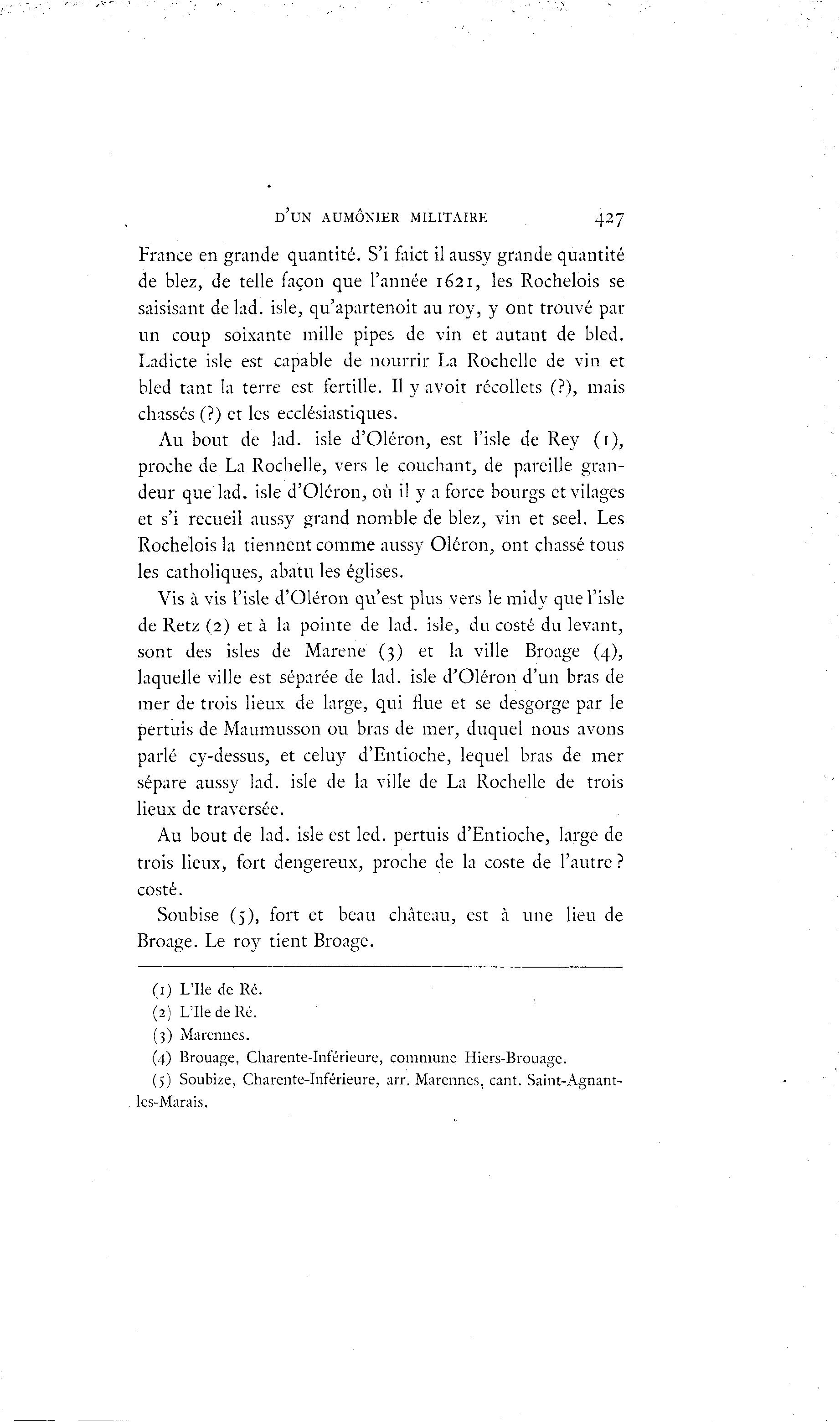 D'UN AUMÔNIER MILITAIRE 427 France en grande quantité. S'i faict il aussy grande quantité de blez, de telle façon que l'année 1621, les Rochelois se saisisant de lad. isle, qu'apartenoit au roy, y ont trouvé par un coup soixante mille pipes de vin et autant de bled. Ladicte isle est capable de nourrir La Rochelle de vin et bled tant la terre est fertille. Il y avoit récollets (?), mais chassés (?) et les ecclésiastiques. Au bout de lad. isle d'Oléron, est l'isle de Rey ( t ) , proche de La Rochelle, vers le couchant, de pareille gran- deur que lad. isle d'Oléron, où il y a force bourgs et vilages et s'i recueil aussy grand nomble de blez, vin et seel. Les Rochelois la tiennent comme aussy Oléron, ont chassé tous les catholiques, abatu les églises. Vis à vis l'isle d'Oléron qu'est plus vers le midy que l'isle de Retz (2) et à la pointe de lad. isle, du costé du levant, sont des isles de Marene (3) et la ville Broage (4), laquelle ville est séparée de lad. isle d'Oléron d'un bras de mer de trois lieux de large, qui nue et se desgorge par le permis de Maumusson ou bras de mer, duquel nous avons parlé cy-dessus, et celuy d'Entioche, lequel bras de mer sépare aussy lad. isle de la ville de La Rochelle de trois lieux de traversée. Au bout de lad. isle est led. permis d'Entioche, large de trois lieux, fort dengereux, proche de la coste de l'autre ? costé. Soubise (5), fort et beau château, est à une lieu de Broage. Le roy tient Broage. (1) L'Ile de Ré. (2) L'Ile de Ré. (3) Marennes. (4) Brouage, Charente-Inférieure, commune Hiers-Brouage. (5) Soubize, Charente-Inférieure, arr. Marennes, cant. Saint-Agnant- les-Marais.