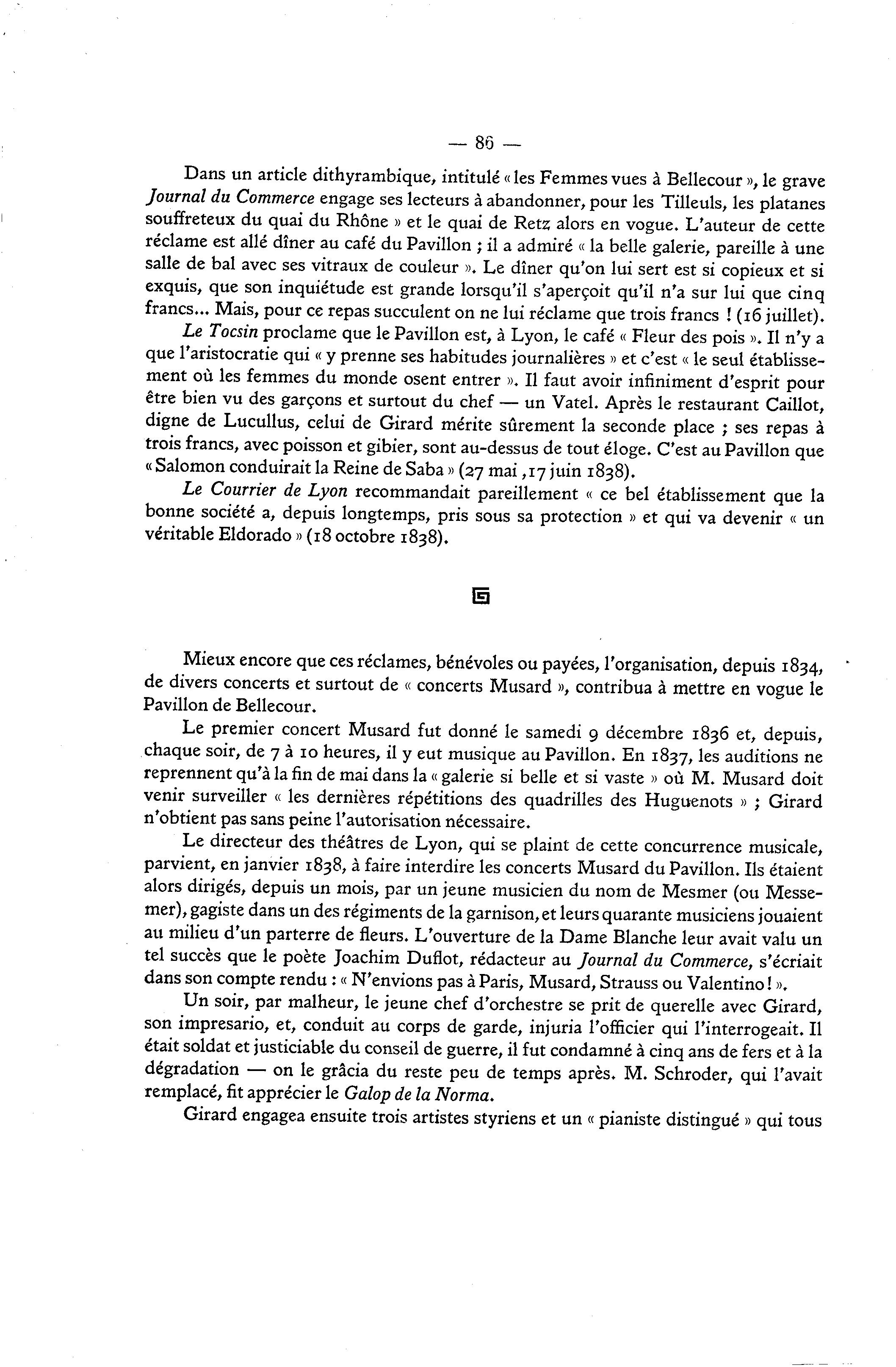 — 86 — Dans un article dithyrambique, intitulé « les Femmes vues à Bellecour », le grave Journal du Commerce engage ses lecteurs à abandonner, pour les Tilleuls, les platanes souffreteux du quai du Rhône » et le quai de Retz alors en vogue. L'auteur de cette réclame est allé dîner au café du Pavillon ; il a admiré « la belle galerie, pareille à une salle de bal avec ses vitraux de couleur ». Le dîner qu'on lui sert est si copieux et si exquis, que son inquiétude est grande lorsqu'il s'aperçoit qu'il n'a sur lui que cinq francs... Mais, pour ce repas succulent on ne lui réclame que trois francs ! (16 juillet). Le Tocsin proclame que le Pavillon est, à Lyon, le café « Fleur des pois ». Il n'y a que l'aristocratie qui « y prenne ses habitudes journalières » et c'est « le seul établisse- ment où les femmes du monde osent entrer ». Il faut avoir infiniment d'esprit pour être bien vu des garçons et surtout du chef — un Vatel. Après le restaurant Caillot, digne de Lucullus, celui de Girard mérite sûrement la seconde place ; ses repas à trois francs, avec poisson et gibier, sont au-dessus de tout éloge. C'est au Pavillon que « Salomon conduirait la Reine de Saba » (27 mai ,17 juin 1838). Le Courrier de Lyon recommandait pareillement « ce bel établissement que la bonne société a, depuis longtemps, pris sous sa protection » et qui va devenir « un véritable Eldorado » (18 octobre 1838). Mieux encore que ces réclames, bénévoles ou payées, l'organisation, depuis 1834, de divers concerts et surtout de « concerts Musard », contribua à mettre en vogue le Pavillon de Bellecour. Le premier concert Musard fut donné le samedi 9 décembre 1836 et, depuis, chaque soir, de 7 à 10 heures, il y eut musique au Pavillon. En 1837, les auditions ne reprennent qu'à la fin de mai dans la « galerie si belle et si vaste » où M. Musard doit venir surveiller « les dernières répétitions des quadrilles des Huguenots » ; Girard n'obtient pas sans peine l'autorisation nécessaire. Le directeur des théâtres de Lyon, qui se plaint de cette concurrence musicale, parvient, en janvier 1838, à faire interdire les concerts Musard du Pavillon. Ils étaient alors dirigés, depuis un mois, par un jeune musicien du nom de Mesmer (ou Messe- mer), gagiste dans un des régiments de la garnison, et leurs quarante musiciens jouaient au milieu d'un parterre de fleurs. L'ouverture de la Dame Blanche leur avait valu un tel succès que le poète Joachim Duflot, rédacteur au Journal du Commerce, s'écriait dans son compte rendu : « N'envions pas à Paris, Musard, Strauss ou Valentino ! ». Un soir, par malheur, le jeune chef d'orchestre se prit de querelle avec Girard, son imprésario, et, conduit au corps de garde, injuria l'officier qui l'interrogeait. Il était soldat et justiciable du conseil de guerre, il fut condamné à cinq ans de fers et à la dégradation — on le gracia du reste peu de temps après. M. Schroder, qui l'avait remplacé, fit apprécier le Galop de la Norma. Girard engagea ensuite trois artistes styriens et un « pianiste distingué » qui tous