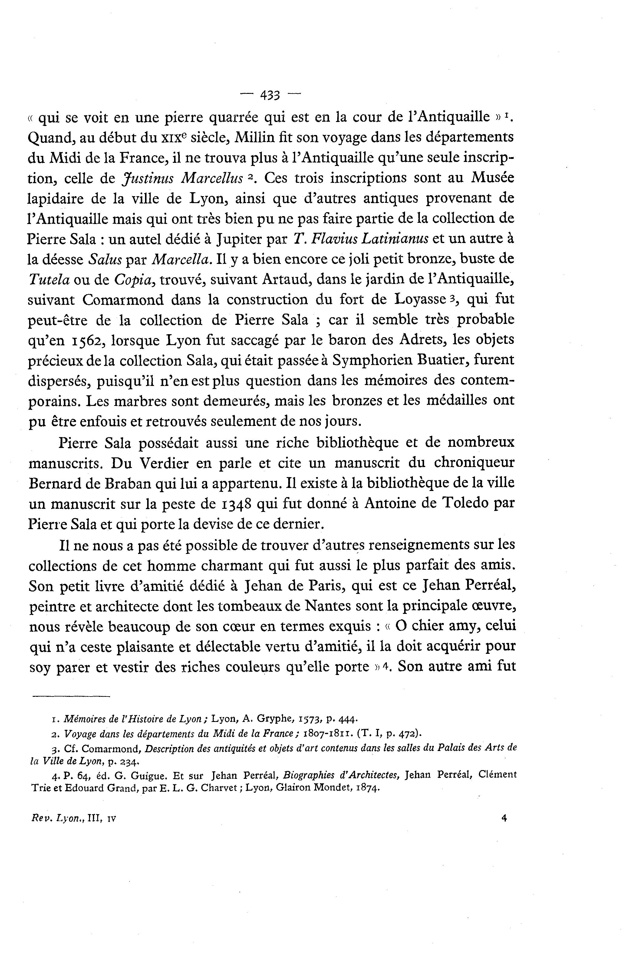 — 433 — « qui se voit en une pierre quarrée qui est en la cour de l'Antiquaille » t . Quand, au début du XIXe siècle, Millin fit son voyage dans les départements du Midi de la France, il ne trouva plus à l'Antiquaille qu'une seule inscrip- tion, celle de Justinus Marcellus 3. Ces trois inscriptions sont au Musée lapidaire de la ville de Lyon, ainsi que d'autres antiques provenant de l'Antiquaille mais qui ont très bien pu ne pas faire partie de la collection de Pierre Sala : un autel dédié à Jupiter par T. Flavius Latinianus et un autre à la déesse Salus par Marcella. Il y a bien encore ce joli petit bronze, buste de Tutela ou de Copia, trouvé, suivant Artaud, dans le jardin de l'Antiquaille, suivant Comarmond dans la construction du fort de Loyasses, qui fut peut-être de la collection de Pierre Sala ; car il semble très probable qu'en 1562, lorsque Lyon fut saccagé par le baron des Adrets, les objets précieux de la collection Sala, qui était passée à Symphorien Buatier, furent dispersés, puisqu'il n'en est plus question dans les mémoires des contem- porains. Les marbres sont demeurés, mais les bronzes et les médailles ont pu être enfouis et retrouvés seulement de nos jours. Pierre Sala possédait aussi une riche bibliothèque et de nombreux manuscrits. Du Verdier en parle et cite un manuscrit du chroniqueur Bernard de Braban qui lui a appartenu. Il existe à la bibliothèque de la ville un manuscrit sur la peste de 1348 qui fut donné à Antoine de Toledo par Pierre Sala et qui porte la devise de ce dernier. Il ne nous a pas été possible de trouver d'autres renseignements sur les collections de cet homme charmant qui fut aussi le plus parfait des amis. Son petit livre d'amitié dédié à Jehan de Paris, qui est ce Jehan Perréal, peintre et architecte dont les tombeaux de Nantes sont la principale œuvre, nous révèle beaucoup de son cœur en termes exquis : « O chier amy, celui qui n'a ceste plaisante et délectable vertu d'amitié, il la doit acquérir pour soy parer et vestir des riches couleurs qu'elle porte » 4. Son autre ami fut 1. Mémoires de l'Histoire de Lyon; Lyon, A. Gryphe, 1573, p. 444. a. Voyage dans les départements du Midi de la France; 1807-1811. (T. I, p. 473). 3. Cf. Comarmond, Description des antiquités et objets d'art contenus dans les salles du Palais des Arts de la Ville de Lyon, p. 334. 4. P. 64, éd. G. Guigue. Et sur Jehan Perréal, Biographies d'Architectes, Jehan Perréal, Clément Trie et Edouard Grand, par E. L. G. Charvet ; Lyon, Glairon Mondet, 1874. Rev. Lyon,, III, iv 4