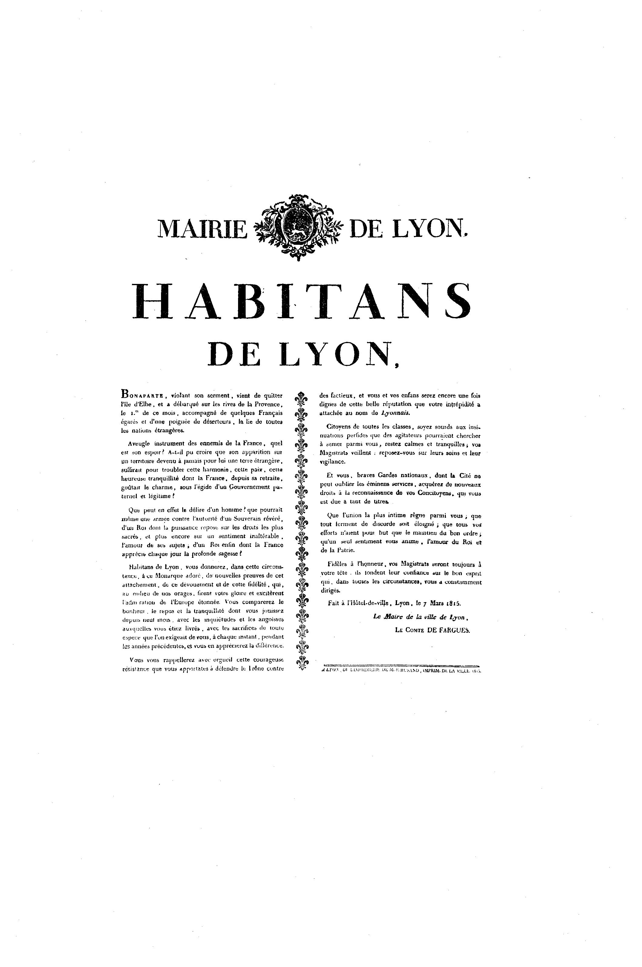 l'a dm raiio» de l'Europe étonnée. Voua comparerez le Fait à l'Hôtel-de-viUe, Lyon, le 7 Mara i 8 i 5 .
