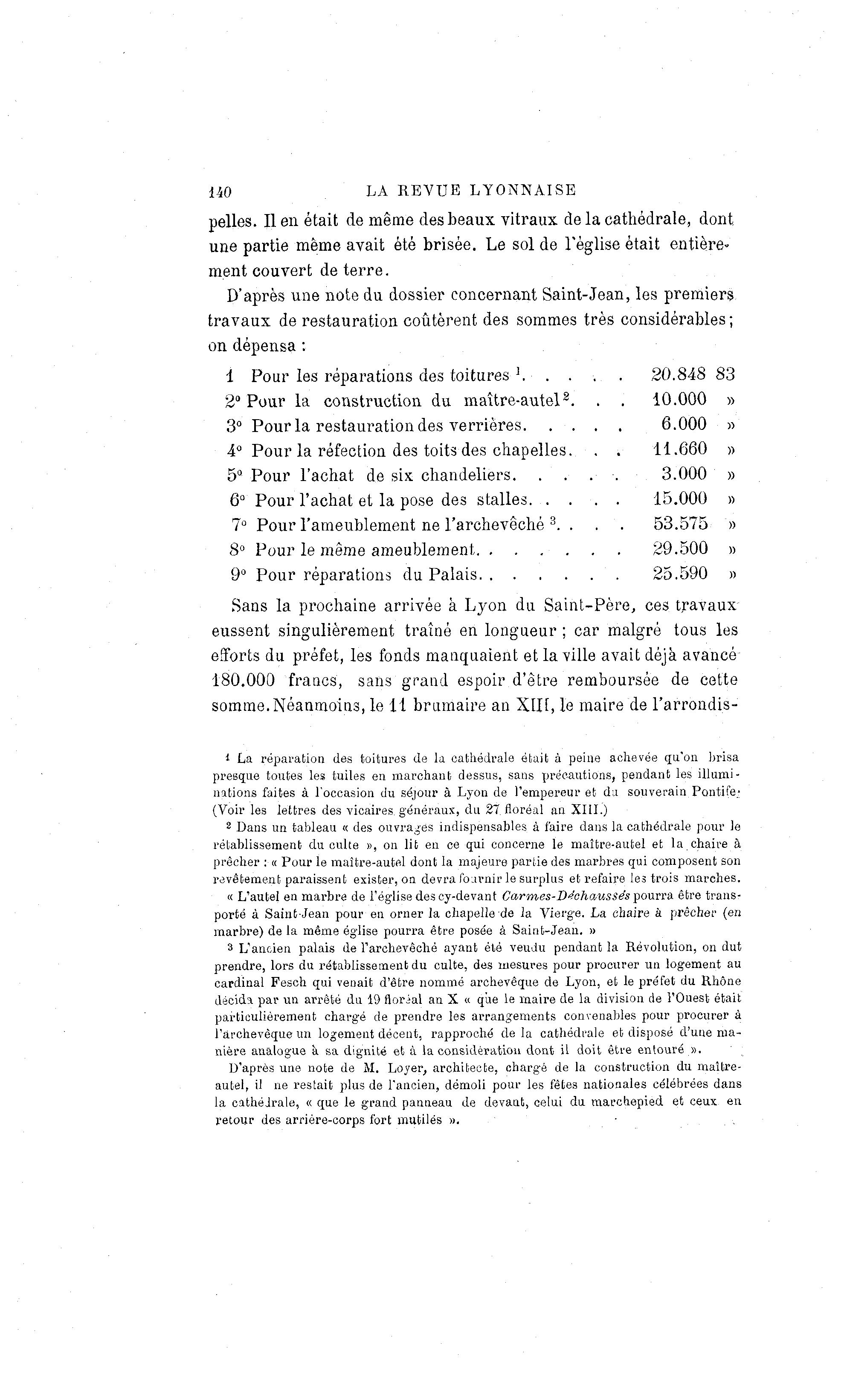 HO LA R E V U E L Y O N N A I S E pelles. lien était de même des beaux vitraux de la cathédrale, dont une partie même avait été brisée. Le sol de l'église était entière» ment couvert de terre. D'après une note du dossier concernant Saint-Jean, les premiers travaux de restauration coûtèrent des sommes très considérables ; on dépensa : 1 Pour les réparations des toitures ] . . . . . 20.848 83 2° Pour la construction du maître-autel2. . . 10.000 » 3° Pour la restauration des verrières 6.000 » 4° Pour la réfection des toits des chapelles. . . 11.660 » 5° Pour l'achat de six chandeliers. . . . . 3.000 » 6° Pour l'achat et la pose des stalles 15.000 » 7° Pour l'ameublement ne l'archevêché 3. . . . 53.575 » 8° Pour le même ameublement 29.500 » 9° Pour réparations du Palais 25.590 » Sans la prochaine arrivée à Lyon du Saint-Père, ces travaux eussent singulièrement traîné en longueur ; car malgré tous les efforts du préfet, les fonds manquaient et la ville avait déjà avancé 180.000 francs, sans grand espoir d'être remboursée de cette somme. Néanmoins, le 11 brumaire an XLU, le maire de l'arrondis- 1 La réparation des toitures de la cathédrale était à peine achevée qu'on brisa presque toutes les tuiles en marchant dessus, sans précautions, pendant les illumi- nations faites à l'occasion du séjour à Lyon de l'empereur et da souverain Pontife,' (Voir les lettres des vicaires généraux, du 27 floréal an XIII.) 8 Dans un tableau « des ouvragés indispensables à faire dans la cathédrale pour le rétablissement du culte », on lit en ce qui concerne le maître-autel et la chaire à prêcher : « Pour le maître-autel dont la majeure partie des marbres qui composent son revêtement paraissent exister, on devra foLirnir le surplus et refaire les trois marehes. « L'autel en marbre de l'église des cy-devant Carmes-Dechaussés pourra être trans- porté à Saint-Jean pour en orner la chapelle de la Vierge. La chaire à prêcher (en marbre) de la même église pourra être posée à Saint-Jean. » 3 L'ancien palais de l'archevêché ayant été veudu pendant la Révolution, on dut prendre, lors du rétablissement du culte, des mesures pour procurer un logement au cardinal Fesch qui venait d'être nommé archevêque de Lyon, et le préfet du Rhône décida par un arrêté du 19 floréal an X « que le maire de la division de l'Ouest était particulièrement chargé de prendre les arrangements convenables pour procurer à l'archevêque un logement décent, rapproché de la cathédrale et disposé d'une ma- nière analogue à sa dignité et à la considération dont il doit être entouré ». D'après une note de M. Loyer, architecte, chargé de la construction du maître- autel, il ne restait plus de l'ancien, démoli pour les fêtes nationales célébrées dans la cathéjrale, « que le grand panneau de devant, celui du marchepied et ceux en retour des arrière-corps fort mutilés ».