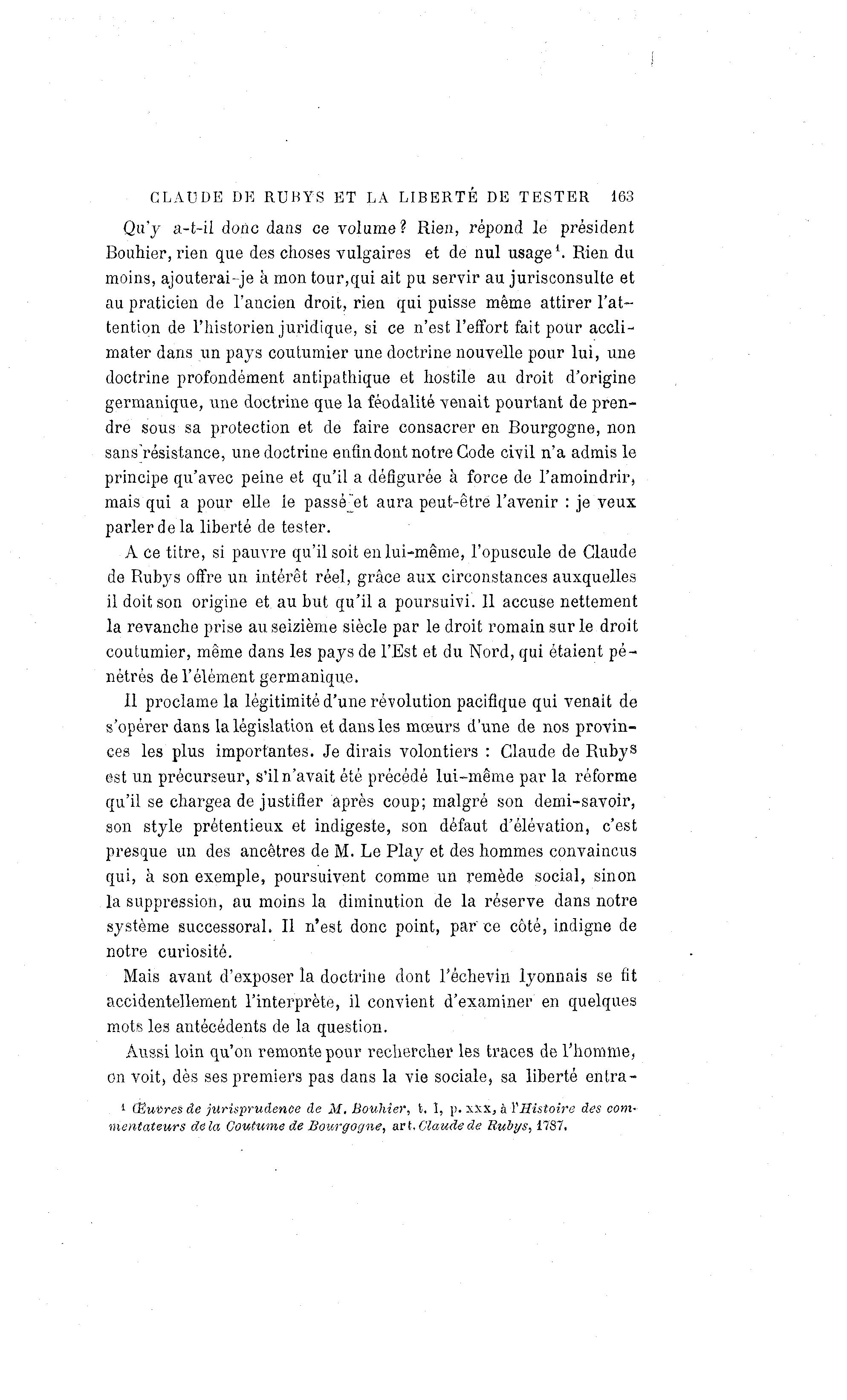 CLAUDE DK RTJBYS ET LA L I B E R T É DE T E S T E R 163 Qu'y a-t-il donc dans ce volume? Rien, répond le président Bouhier, rien que des choses vulgaires et de nul usage1. Rien du moins, ajouterai-je à mon tour,qui ait pu servir au jurisconsulte et au praticien de l'ancien droit, rien qui puisse même attirer l'at- tention de l'historien juridique, si ce n'est l'effort fait pour accli- mater dans un pays coutumier une doctrine nouvelle pour lui, une doctrine profondément antipathique et hostile au droit d'origine germanique, une doctrine que la féodalité venait pourtant de pren- dre sous sa protection et de faire consacrer en Bourgogne, non sansVésistance, une doctrine enfin dont notre Gode civil n'a admis le principe qu'avec peine et qu'il a défigurée à force de l'amoindrir, mais qui a pour elle le passent aura peut-être l'avenir : je veux parler de la liberté de tester. A ce titre, si pauvre qu'il soit en lui-même, l'opuscule de Claude de Rubys offre un intérêt réel, grâce aux circonstances auxquelles il doit son origine et au but qu'il a poursuivi. Il accuse nettement la revanche prise au seizième siècle par le droit romain sur le droit coutumier, même dans les pays de l'Est et du Nord, qui étaient pé- nétrés de l'élément germanique. Il proclame la légitimité d'une révolution pacifique qui venait de s'opérer dans la législation et dans les mœurs d'une de nos provin- ces les plus importantes. Je dirais volontiers : Claude de RubyS est un précurseur, s'il n'avait été précédé lui-même par la réforme qu'il se chargea de justifier après coup; malgré son demi-savoir, son style prétentieux et indigeste, son défaut d'élévation, c'est presque un des ancêtres de M. Le Play et des hommes convaincus qui, à son exemple, poursuivent comme un remède social, sinon la suppression, au moins la diminution de la réserve dans notre système successoral. Il n'est donc point, par ce côté, indigne de notre curiosité. Mais avant d'exposer la doctrine dont l'échevin lyonnais se fit accidentellement l'interprète, il convient d'examiner en quelques mots les antécédents de la question. Aussi loin qu'on remonte pour rechercher les traces de l'homme, on voit, dès ses premiers pas dans la vie sociale, sa liberté entra - 1 (ËuVres de jurisprudence de M. Bouhier, t. 1, p. xxx, à YSistoire des com- mentateurs delà Coutume de Bourgogne, art, Claude de Rubys, 1787.