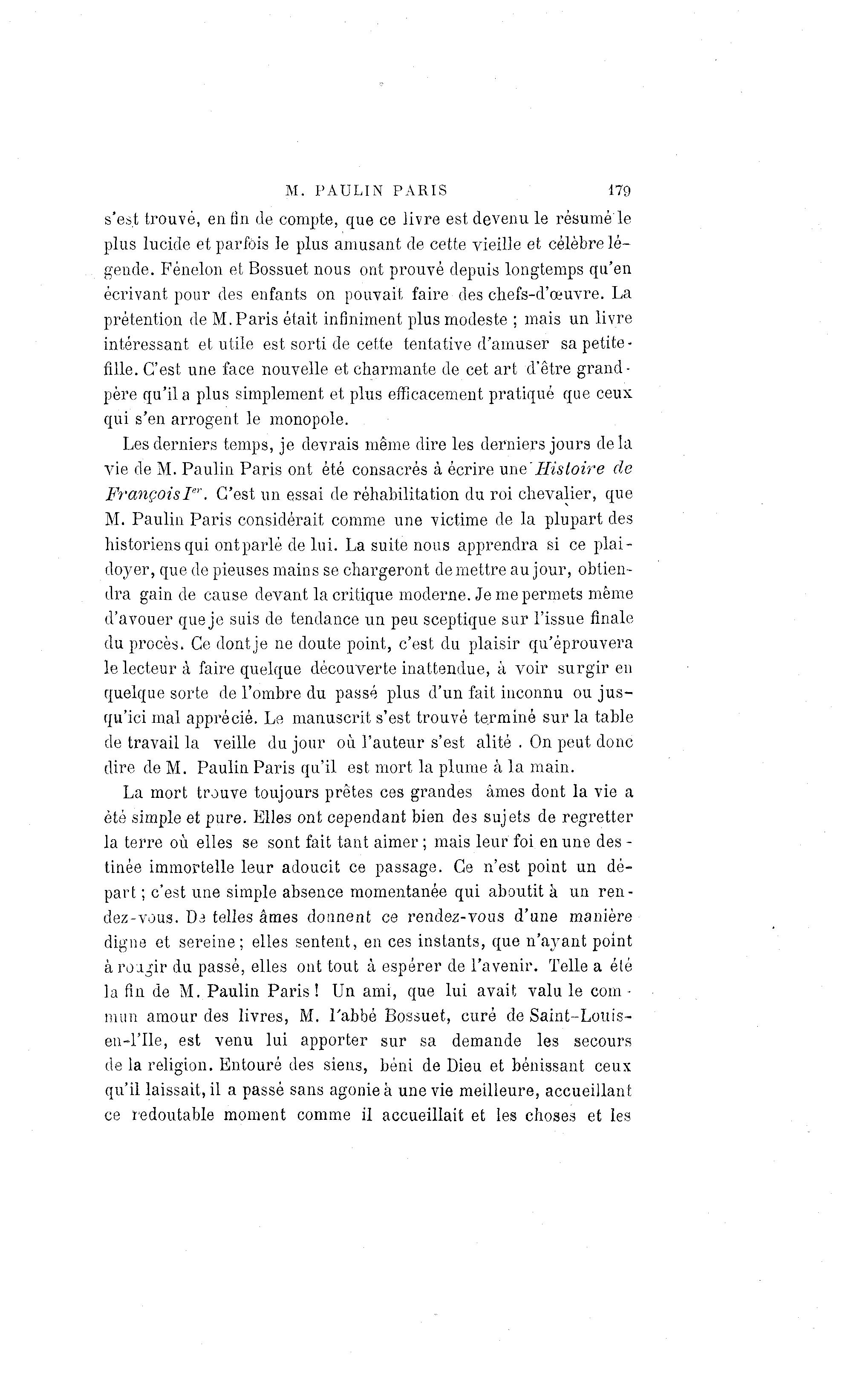 M. PAULIN P A R I S 179 s'est trouvé, en fin de compte, que ce livre est devenu le résumé le plus lucide et parfois le plus amusant de cette vieille et célèbre lé- gende. Fénelon et Bossuet nous ont prouvé depuis longtemps qu'en écrivant pour des enfants on pouvait faire des chefs-d'œuvre. La prétention de M.Paris était infiniment plus modeste ; mais un livre intéressant et utile est sorti de cette tentative d'amuser sa petite - fille. C'est une face nouvelle et charmante de cet art d'être grand - père qu'il a plus simplement et plus efficacement pratiqué que ceux qui s'en arrogent le monopole. Les derniers temps, je devrais même dire les derniers jours delà vie de M. Paulin Paris ont été consacrés à écrire une' Histoire de FrançoisIer. C'est un essai de réhabilitation du roi chevalier, que M. Paulin Paris considérait comme une victime de la plupart des historiens qui ontparlé de lui. La suite nous apprendra si ce plai- doyer, que de pieuses mains se chargeront démettre au jour, obtien- dra gain de cause devant la critique moderne. Je me permets même d'avouer que je suis de tendance un peu sceptique sur l'issue finale du procès. Ce dont je ne doute point, c'est du plaisir qu'éprouvera le lecteur à faire quelque découverte inattendue, à voir surgir en quelque sorte de l'ombre du passé plus d'un fait inconnu ou j u s - qu'ici mal apprécié. Le manuscrit s'est trouvé terminé sur la table de travail la veille du jour où l'auteur s'est alité . On peut donc dire de M. Paulin Paris qu'il est mort la plume à la main. La mort trouve toujours prêtes ces grandes âmes dont la vie a été simple et pure. Elles ont cependant bien des sujets de regretter la terre où elles se sont fait tant aimer ; mais leur foi en une des - tinêe immortelle leur adoucit ce passage. Ce n'est point un dé- part ; c'est une simple absence momentanée qui aboutit à un ren- dez-vous. V)î telles âmes donnent ce rendez-vous d'une manière digne et sereine; elles sentent, en ces instants, que n'ayant point à rougir du passé, elles ont tout à espérer de l'avenir. Telle a été la fin de M. Paulin Paris ! Un ami, que lui avait valu le corn • mun amour des livres, M. l'abbé Bossuet, curé de Saint-Louis- en-l'Ile, est venu lui apporter sur sa demande les secours de la religion. Entouré des siens, béni de Dieu et bénissant ceux qu'il laissait, il a passé sans agonie à une vie meilleure, accueillant ce redoutable moment comme il accueillait et les choses et les