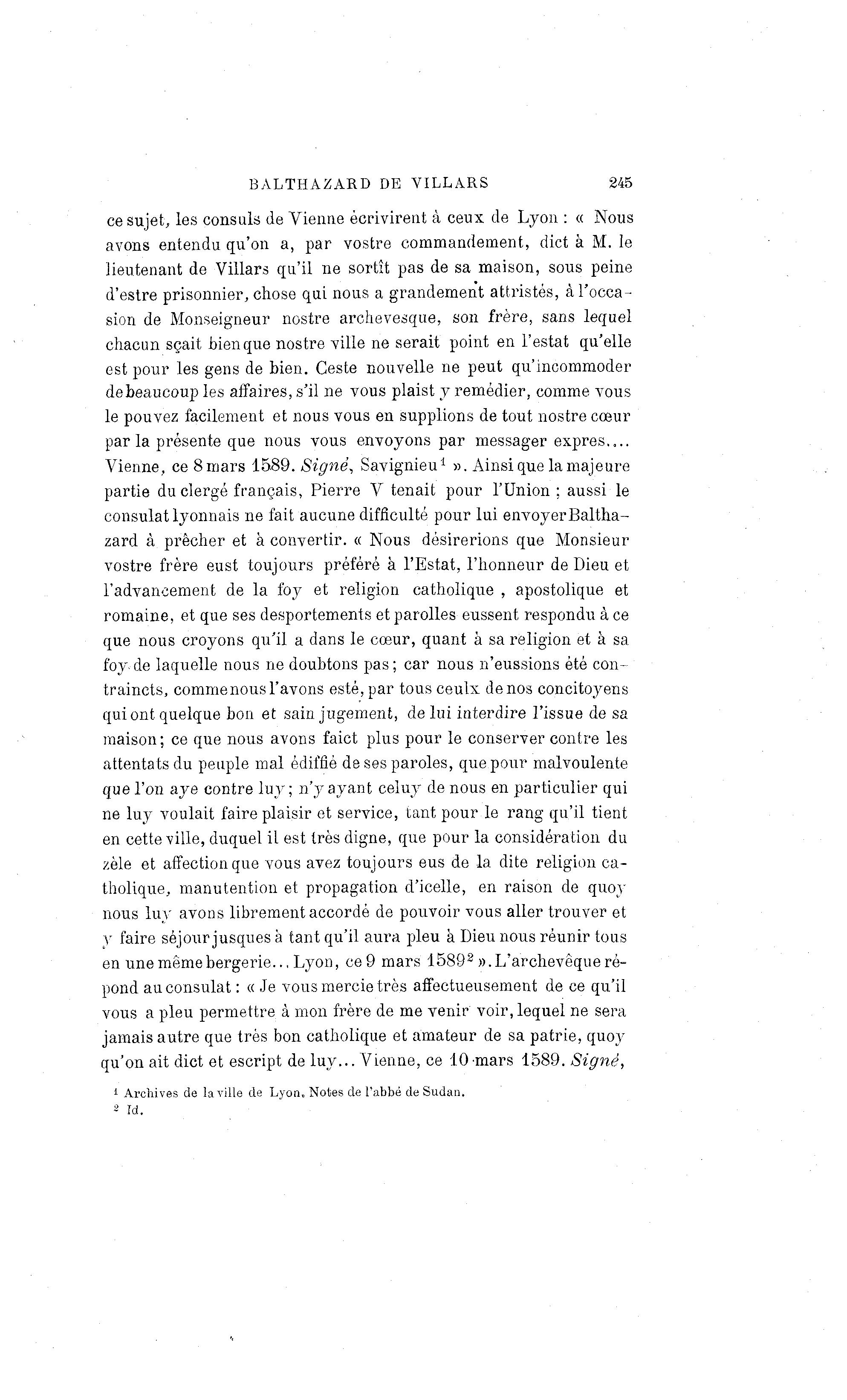 BALTHAZARD DE VILLARS 245 ce sujet, les consuls de Vienne écrivirent à ceux de Lyon : « Nous avons entendu qu'on a, par vostre commandement, dict à M. le lieutenant de Villars qu'il ne sortît pas de sa maison, sous peine d'estre prisonnier, chose qui nous a grandement attristés, à l'occa- sion de Monseigneur nostre archevesque, son frère, sans lequel chacun sçait bien que nostre ville ne serait point en Testât qu'elle est pour les gens de bien. Ceste nouvelle ne peut qu'incommoder debeaucoup les affaires, s'il ne vous plaist y remédier, comme vous le pouvez facilement et nous vous en supplions de tout nostre cœur par la présente que nous vous envoyons par messager exprès.... Vienne, ce 8 mars 1589. Signé, Savignieu 1 ». Ainsi que la majeure partie du clergé français, Pierre V tenait pour l'Union ; aussi le consulat lyonnais ne fait aucune difficulté pour lui envoyer Baltha- zard à prêcher et à convertir. « Nous désirerions que Monsieur vostre frère eust toujours préféré à l'Estat, l'honneur de Dieu et l'advaneement de la foy et religion catholique , apostolique et romaine, et que ses desportements et parolles eussent respondu à ce que nous croyons qu'il a dans le cœur, quant à sa religion et à sa foy de laquelle nous ne doubtons pas; car nous n'eussions été coiv traincts, commenous l'avons esté, par tous ceulx de nos concitoyens qui ont quelque bon et sain jugement, de lui interdire l'issue de sa maison; ce que nous avons faict plus pour le conserver contre les attentats du peuple mal édiffié de ses paroles, que pour malvoulente que l'on aye contre luy; n'y ayant celuy de nous en particulier qui ne luy voulait faire plaisir et service, tant pour le rang qu'il tient en cette ville, duquel il est très digne, que pour la considération du zèle et affection que vous avez toujours eus de la dite religion ca- tholique, manutention et propagation d'icelle, en raison de quoy nous luy avons librement accordé de pouvoir vous aller trouver et y faire séjour jusques à tant qu'il aura pieu à Dieu nous réunir tous en une même bergerie.., Lyon, ce 9 mars 1589 2 ». L'archevêque ré- pond au consulat : « Je vous mercie très affectueusement de ce qu'il vous a pieu permettre à mon frère de me venir voir, lequel ne sera jamais autre que très bon catholique et amateur de sa patrie, quoy qu'on ait dict et escript de luy... Vienne, ce 10 mars 1589. Signé, 1 Archives de la ville de Lyon, Notes de l'abbé de Sudan. 2 Td.
