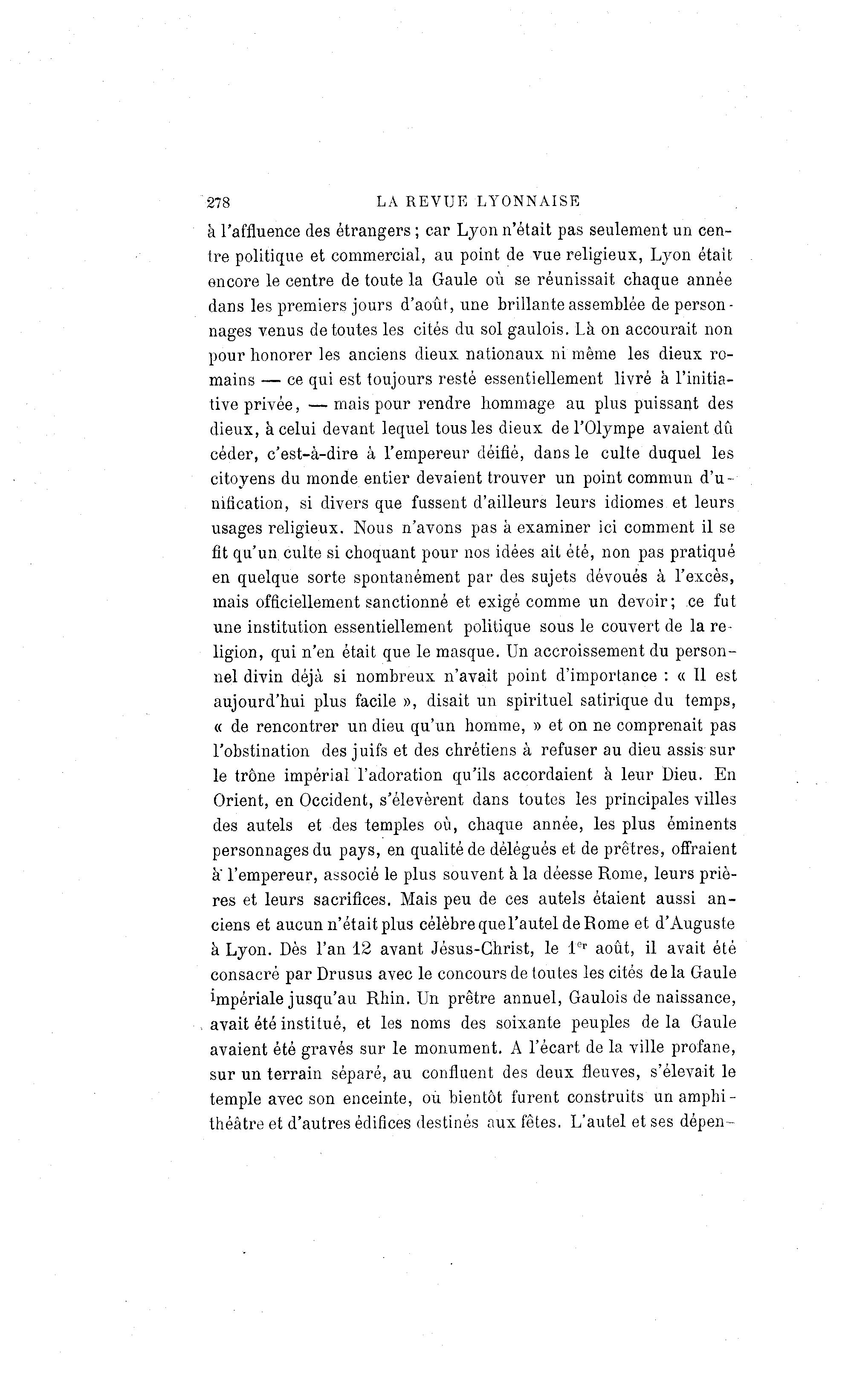 278 LA R E V U E LYONNAISE à l'affluence des étrangers ; car Lyon n'était pas seulement un cen- tre politique et commercial, au point de vue religieux, Lyon était encore le centre de toute la Gaule où se réunissait chaque année dans les premiers jours d'août, une brillante assemblée de person- nages venus de toutes les cités du sol gaulois. Là on accourait non pour honorer les anciens dieux nationaux ni même les dieux ro- mains — ce qui est toujours resté essentiellement livré à l'initia- tive privée, — mais pour rendre hommage au plus puissant des dieux, à celui devant lequel tous les dieux de l'Olympe avaient dû céder, c'est-à -dire à l'empereur déifié, dans le culte duquel les citoyens du monde entier devaient trouver un point commun d'u- nification, si divers que fussent d'ailleurs leurs idiomes et leurs usages religieux. Nous n'avons pas à examiner ici comment il se fit qu'un culte si choquant pour nos idées ait été, non pas pratiqué en quelque sorte spontanément par des sujets dévoués à l'excès, mais officiellement sanctionné et exigé comme un devoir; ce fut une institution essentiellement politique sous le couvert de la re- ligion, qui n'en était que le masque. Un accroissement du person- nel divin déjà si nombreux n'avait point d'importance : « 11 est aujourd'hui plus facile », disait un spirituel satirique du temps, « de rencontrer un dieu qu'un homme, » et on ne comprenait pas l'obstination des juifs et des chrétiens à refuser au dieu assis sur le trône impérialTadoration qu'ils accordaient à leur Dieu. En Orient, en Occident, s'élevèrent dans toutes les principales villes des autels et des temples où, chaque année, les plus éminents personnages du pays, en qualité de délégués et de prêtres, offraient a l'empereur, associé le plus souvent à la déesse Rome, leurs priè- res et leurs sacrifices. Mais peu de ces autels étaient aussi an- ciens et aucun n'était plus célèbre que l'autel de Rome et d'Auguste à Lyon. Dès l'an 12 avant Jésus-Christ, le 1er août, il avait été consacré par Drusus avec le concours de toutes les cités de la Gaule impériale jusqu'au Rhin. Un prêtre annuel, Gaulois de naissance, avait été institué, et les noms des soixante peuples de la Gaule avaient été gravés sur le monument. A l'écart de la ville profane, sur un terrain séparé, au confluent des deux fleuves, s'élevait le temple avec son enceinte, ou bientôt furent construits un amphi- théâtre et d'autres édifices destinés aux fêtes. L'autel et ses dépen-