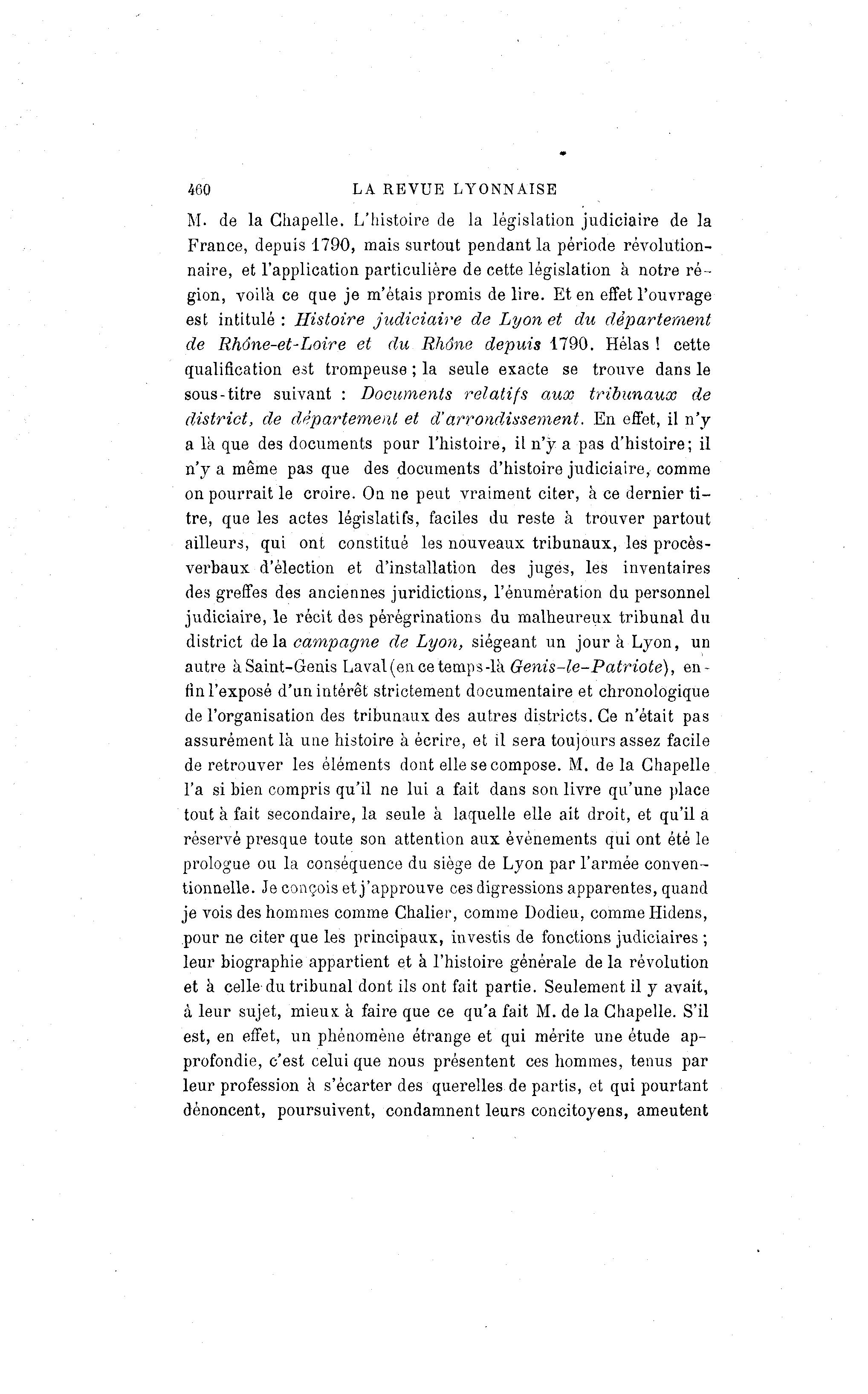 460 LA REVUE LYONNAISE M. de la Chapelle. L'histoire de la législation judiciaire de la France, depuis 1790, mais surtout pendant la période révolution- naire, et l'application particulière de cette législation à notre ré- gion, voilà ce que je m'étais promis de lire. Et en effet l'ouvrage est intitulé : Histoire judiciaire de Lyon et du département de Rhône-et-Loire et du Rhône depuis 1790. Hélas ! cette qualification est trompeuse ; la seule exacte se trouve dans le sous-titre suivant : Documents relatifs aux tribunaux de district, de département et d'arrondissement. En effet, il n'y a là que des documents pour l'histoire, il n'y a pas d'histoire; il n'y a même pas que des documents d'histoire judiciaire, comme on pourrait le croire. On ne peut vraiment citer, à ce dernier ti- tre, que les actes législatifs, faciles du reste à trouver partout ailleurs, qui ont constitué les nouveaux tribunaux, les procès- verbaux d'élection et d'installation des juges, les inventaires des greffes des anciennes juridictions, l'énumération du personnel judiciaire, le récit des pérégrinations du malheureux tribunal du district delà campagne de Lyon, siégeant un jour à Lyon, un autre à Saint-Genis Laval (en ce temps -là Genis-le-Patriote), en- fin l'exposé d'un intérêt strictement documentaire et chronologique de l'organisation des tribunaux des autres districts. Ce n'était pas assurément là une histoire à écrire, et il sera toujours assez facile de retrouver les éléments dont elle se compose. M. delà Chapelle l'a si bien compris qu'il ne lui a fait dans son livre qu'une place tout à fait secondaire, la seule à laquelle elle ait droit, et qu'il a réservé presque toute son attention aux événements qui ont été le prologue ou la conséquence du siège de Lyon par l'armée conven- tionnelle. Je conçois et j'approuve ces digressions apparentes, quand je vois des hommes comme Chalier, comme Dodieu, comme Hidens, pour ne citer que les principaux, investis de fonctions judiciaires ; leur biographie appartient et à l'histoire générale de la révolution et à celle du tribunal dont ils ont fait partie. Seulement il y avait, à leur sujet, mieux à faire que ce qu'a fait M. de la Chapelle. S'il est, en effet, un phénomène étrange et qui mérite une étude ap- profondie, c'est celui que nous présentent ces hommes, tenus par leur profession à s'écarter des querelles de partis, et qui pourtant dénoncent, poursuivent, condamnent leurs concitoyens, ameutent