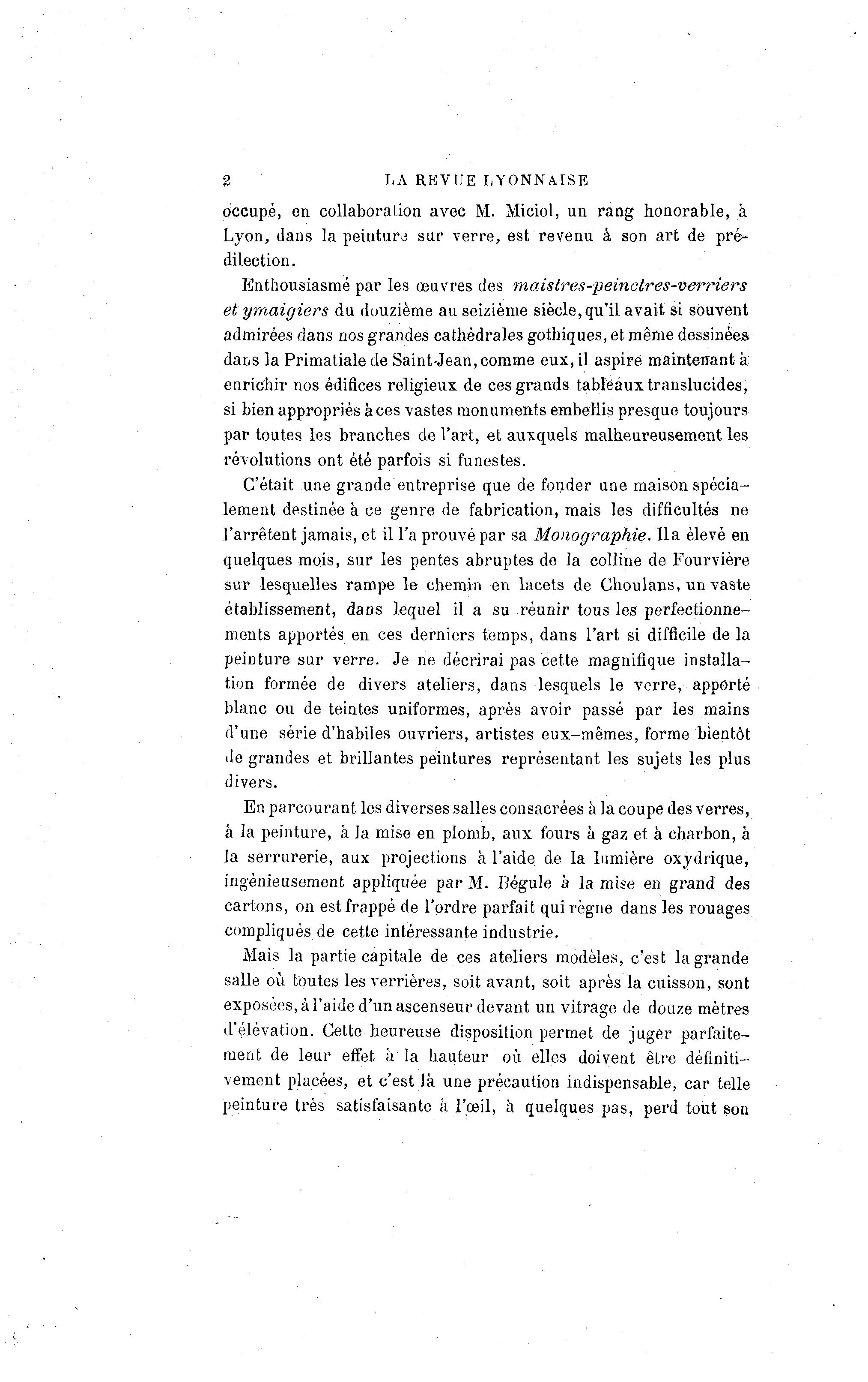 2 LA REVUE LYONNAISE occupé, en collaboration avec M. Miciol, un rang honorable, à Lyon, dans la peintura sur verre, est revenu à son art de pré- dilection. Enthousiasmé par les œuvres des maistres-peinctres-verriers et ymaigiers du douzième au seizième siècle,qu'il avait si souvent admirées dans nos grandes cathédrales gothiques, et même dessinées dans la Primatiale de Sain Wean, comme eux, il aspire maintenant à enrichir nos édifices religieux de ces grands tableaux translucides, si bien appropriés à ces vastes monuments embellis presque toujours par toutes les branches de l'art, et auxquels malheureusement les révolutions ont été parfois si funestes. C'était une grande entreprise que de fonder une maison spécia- lement destinée à ce genre de fabrication, mais les difficultés ne l'arrêtent jamais, et il l'a prouvé par sa Monographie. lia élevé en quelques mois, sur les pentes abruptes de la colline de Fourvière sur lesquelles rampe le chemin en lacets de Choulans, un vaste établissement, dans lequel il a su réunir tous les perfectionne- ments apportés en ces derniers temps, dans l'art si difficile de la peinture sur verre. Je ne décrirai pas cette magnifique installa- tion formée de divers ateliers, dans lesquels le verre, apporté blanc ou de teintes uniformes, après avoir passé par les mains d'une série d'habiles ouvriers, artistes eux-mêmes, forme bientôt de grandes et brillantes peintures représentant les sujets les plus divers. En parcourant les diverses salles consacrées à la coupe des verres, à la peinture, à Ja mise en plomb, aux fours à gaz et à charbon, à la serrurerie, aux projections à l'aide de la lumière oxydrique, ingénieusement appliquée par M. Régule à la mise en grand des cartons, on est frappé de l'ordre parfait qui règne dans les rouages compliqués de cette intéressante industrie. Mais la partie capitale de ces ateliers modèles, c'est la grande salle où toutes les verrières, soit avant, soit après la cuisson, sont exposées, à l'aide d'un ascenseur devant un vitrage de douze mètres d'élévation. Cette heureuse disposition permet de juger parfaite- ment de leur effet à la hauteur où elles doivent être définiti- vement placées, et c'est là une précaution indispensable, car telle peinture très satisfaisante à l'œil, à quelques pas, perd tout son