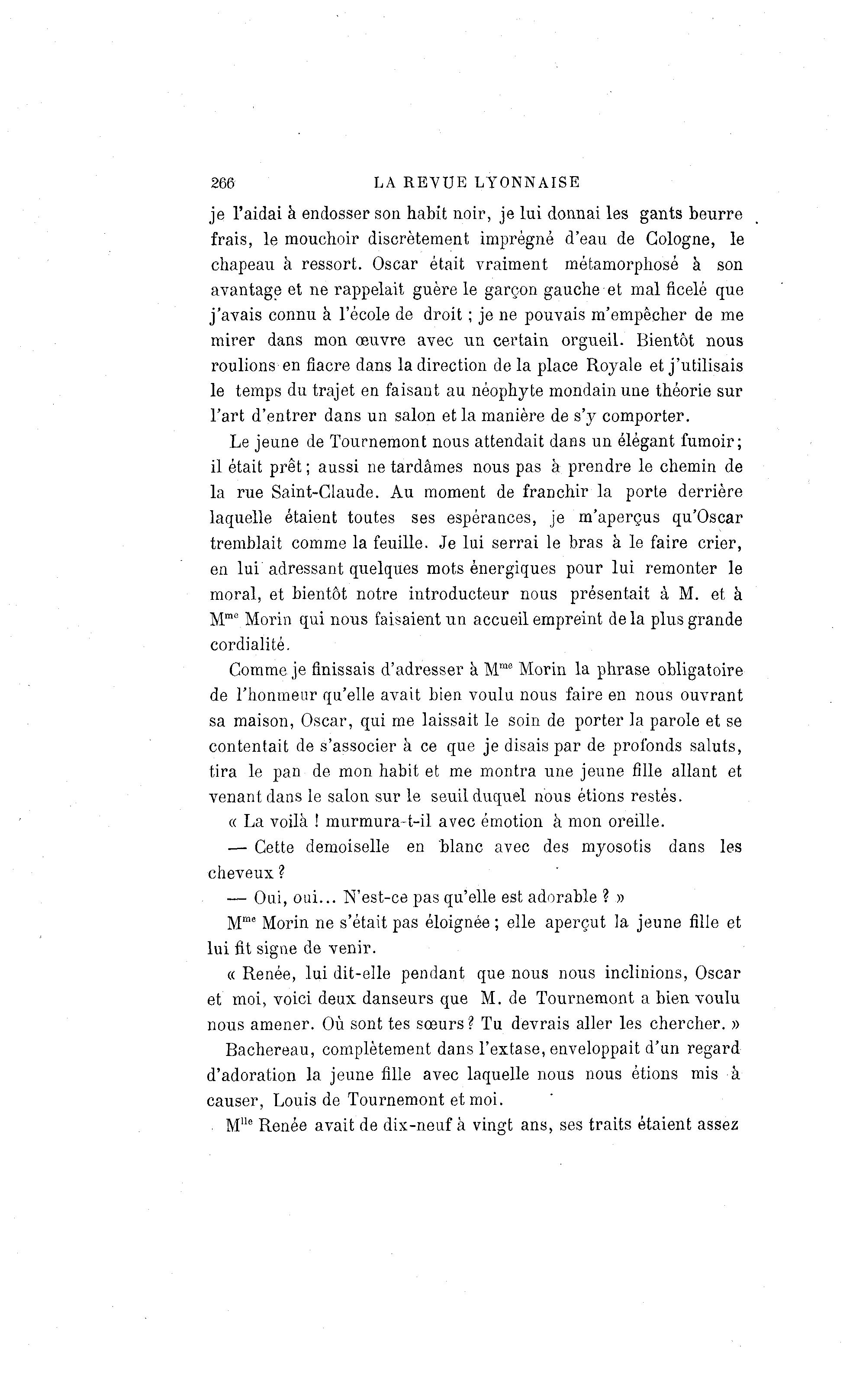 266 LA R E V U E LYONNAISE je l'aidai à endosser son habit noir, je lui donnai les gants beurre frais, le mouchoir discrètement imprégné d'eau de Cologne, le chapeau à ressort. Oscar était vraiment métamorphosé à son avantage et ne rappelait guère le garçon gauche et mal ficelé que j'avais connu à l'école de droit ; je ne pouvais m'empêcher de me mirer dans mon œuvre avec un certain orgueil. Bientôt nous roulions en fiacre dans la direction de la place Royale et j'utilisais le temps du trajet en faisant au néophyte mondain une théorie sur l'art d'entrer dans un salon et la manière de s'y comporter. Le jeune de Tournemont nous attendait dans un élégant fumoir; il était prêt ; aussi ne tardâmes nous pas à prendre le chemin de la rue Saint-Claude. Au moment de franchir la porte derrière laquelle étaient toutes ses espérances, je m'aperçus qu'Oscar tremblait comme la feuille. Je lui serrai le bras à le faire crier, en lui adressant quelques mots énergiques pour lui remonter le moral, et bientôt notre introducteur nous présentait à M. et à Mme Morin qui nous faisaient un accueil empreint de la plus grande cordialité. Comme je finissais d'adresser à Mme Morin la phrase obligatoire de l'honmeur qu'elle avait bien voulu nous faire en nous ouvrant sa maison, Oscar, qui me laissait le soin de porter la parole et se contentait de s'associer à ce que je disais par de profonds saluts, tira le pan de mon habit et me montra une jeune fille allant et venant dans le salon sur le seuil duquel nous étions restés. « La voilà ! murmura-t-il avec émotion à mon oreille. — Cette demoiselle en blanc avec des myosotis dans les cheveux ? — Oui, oui... N'est-ce pas qu'elle est adorable ? » Mme Morin ne s'était pas éloignée ; elle aperçut la jeune fille et lui fit signe de venir. « Renée, lui dit-elle pendant que nous nous inclinions, Oscar et moi, voici deux danseurs que M. de Tournemont a bien voulu nous amener. Où sont tes sœurs ? Tu devrais aller les chercher. » Bachereau, complètement dans l'extase, enveloppait d'un regard d'adoration la jeune fille avec laquelle nous nous étions mis à causer, Louis de Tournemont et moi. Mlle Renée avait de dix-neuf à vingt ans, ses traits étaient assez
