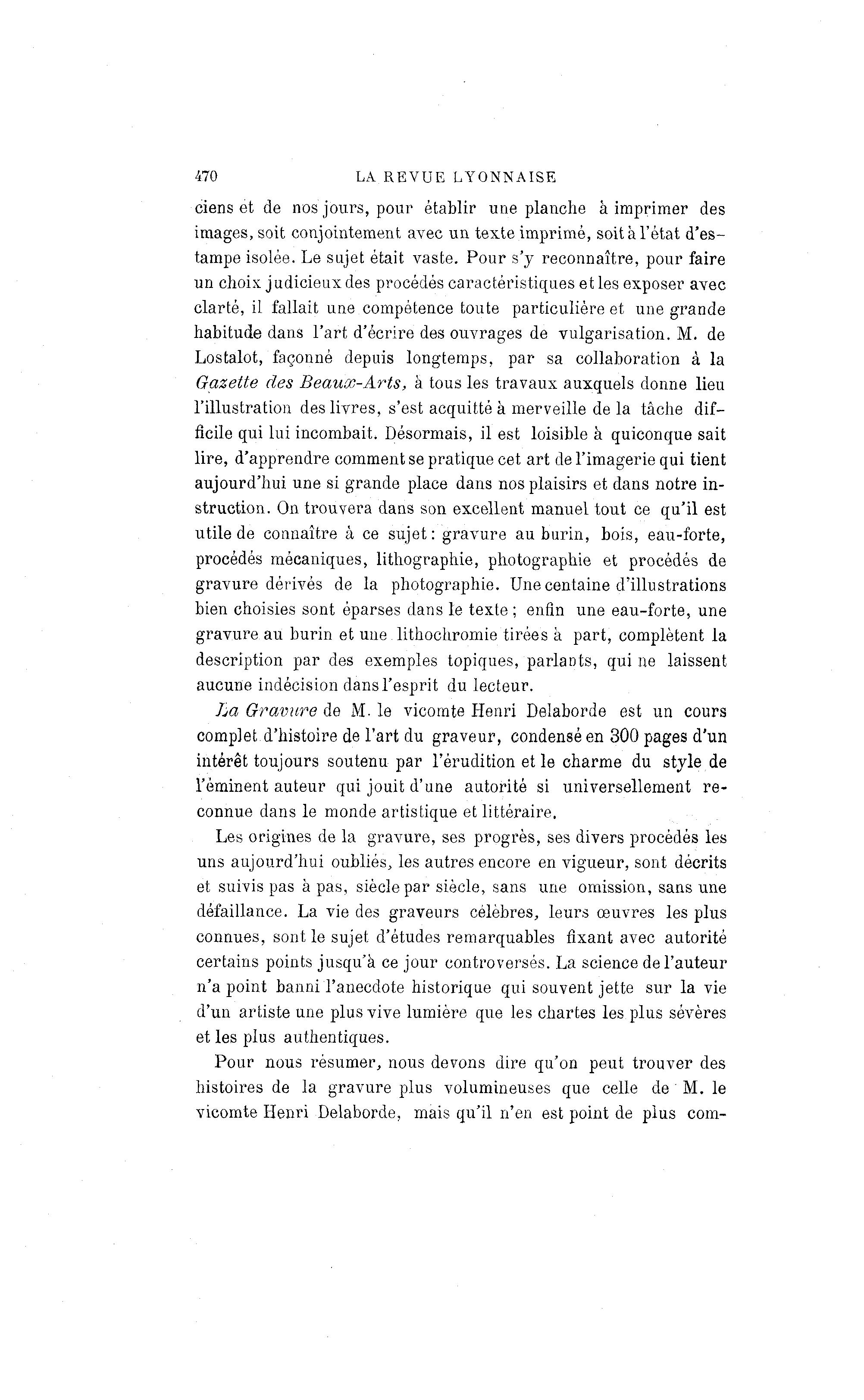 470 LA REVUE LYONNAISE ciens et de nos jours, pour établir une planche à imprimer des images, soit conjointement avec un texte imprimé, soit à l'état d'es- tampe isolée. Le sujet était vaste. Pour s'y reconnaître, pour faire un choix judicieux des procédés caractéristiques et les exposer avec clarté, il fallait une compétence toute particulière et une grande habitude dans l'art d'écrire des ouvrages de vulgarisation. M. de Lostalot, façonné depuis longtemps, par sa collaboration à la Gazette des Beaux-Arts, à tous les travaux auxquels donne lieu l'illustration des livres, s'est acquitté à merveille de la tâche dif- ficile qui lui incombait. Désormais, il est loisible à quiconque sait lire, d'apprendre comment se pratique cet art de l'imagerie qui tient aujourd'hui une si grande place dans nos plaisirs et dans notre in- struction. On trouvera dans son excellent manuel tout ce qu'il est utile de connaître à ce sujet: gravure au burin, bois, eau-forte, procédés mécaniques, lithographie, photographie et procédés de gravure dérivés de la photographie. Une centaine d'illustrations bien choisies sont éparses dans le texte ; enfin une eau-forte, une gravure au burin et une lithochromie tirées à part, complètent la description par des exemples topiques, parlants, qui ne laissent aucune indécision dans l'esprit du lecteur. La Gravure de M- le vicomte Henri Delaborde est un cours complet d'histoire de l'art du graveur, condensé en 300 pages d'un intérêt toujours soutenu par l'érudition et le charme du style de l'éminent auteur qui jouit d'une autorité si universellement re- connue dans le monde artistique et littéraire. Les origines de la gravure, ses progrès, ses divers procédés les uns aujourd'hui oubliés, les autres encore en vigueur, sont décrits et suivis pas à pas, siècle par siècle, sans une omission, sans une défaillance. La vie des graveurs célèbres, leurs œuvres les plus connues, sont le sujet d'études remarquables fixant avec autorité certains points jusqu'à ce jour controversés. La science de l'auteur n'a point banni l'anecdote historique qui souvent jette sur la vie d'un artiste une plus vive lumière que les chartes les plus sévères et les plus authentiques. Pour nous résumer, nous devons dire qu'on peut trouver des histoires de la gravure plus volumineuses que celle de M. le vicomte Henri Delaborde, mais qu'il n'en est point de plus com-