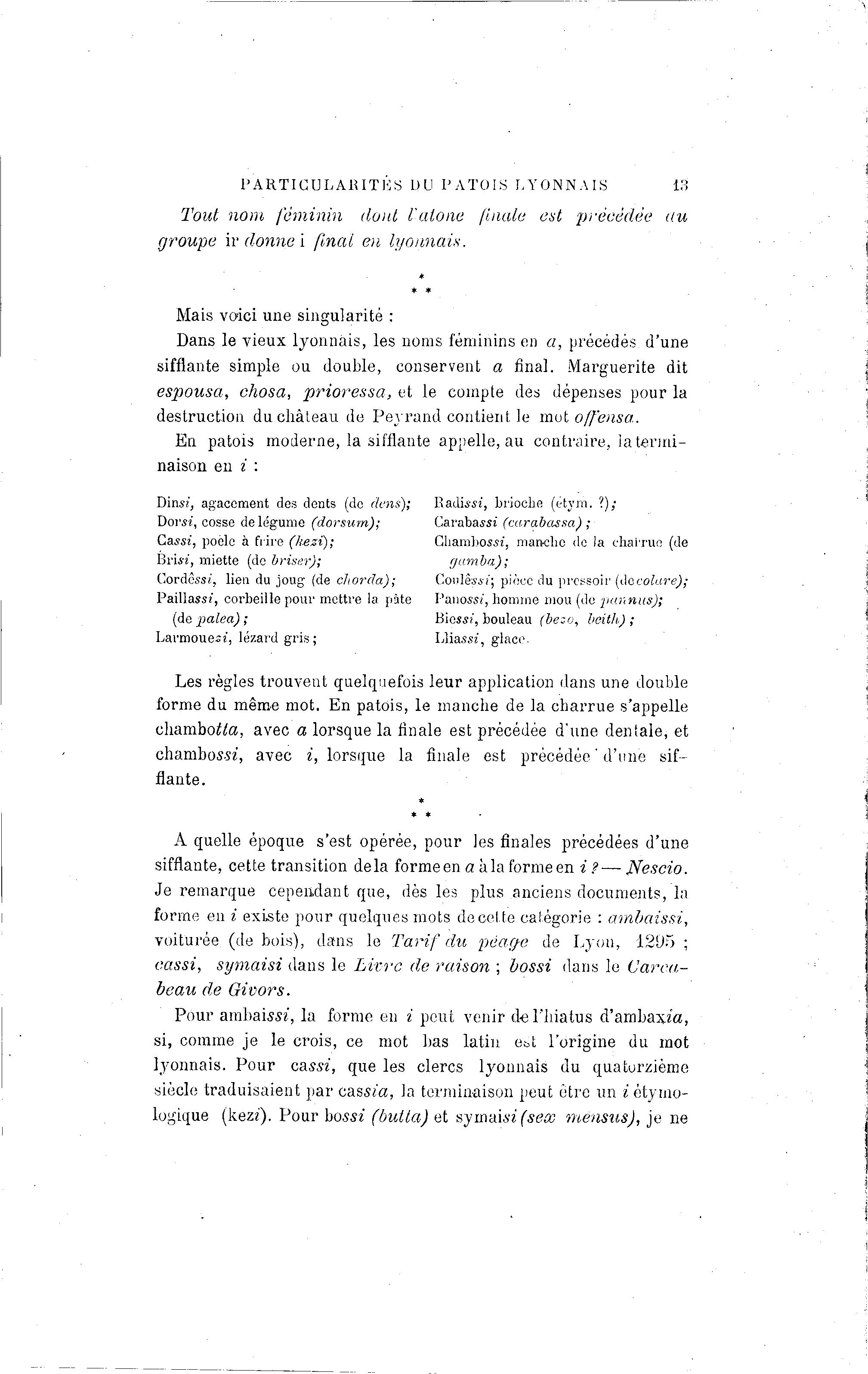 P A R T I C U L A R I T E S DU P A T O I S L Y O N N A I S 13 Tout nom féminin dont l'atone finale eut précédée au groupe ir donne i final en lyonnais. Mais voici une singularité : Dans le vieux lyonnais, les noms féminins en a, précédés d'une sifflante simple ou double, conservent a final. Marguerite dit espousa, chosa, prioressa, et le compte des dépenses pour la destruction du château de Peyrand contient le mot offensa.. Eu patois moderne, la sifflante appelle, au contraire, la termi- naison en i : Dirm, agacement des dents (de tiens); R a d i a i , brioche (etym. ?); D o m , cosse de légume (dorsum); Carabawi (carabassa) ; Cassi, poêle à frire (kezî); Chambos,s!, manche de la chalrue (de B r i « , miette (de briser); gamba); Gov&cssi, lien du joug (de chorcla); Coulés*;'; pièce du pressoir (ilocolare); Paillasse, corbeille pour mettre la pâte Panass;, homme mou (de jiannus); (de palea) ; Bios*!, bouleau (be:o, beith) ; Larmoues!, lézard g r i s ; Lliassi, glace. Les règles trouvent quelquefois leur application dans une double forme du même mot. En patois, le manche de la charrue s'appelle chamboWa, avec a lorsque la finale est précédée d'une dentale, et chambos-M, avec i, lorsque la finale est précédée ' d'une sif- flante. A quelle époque s'est opérée, pour les finales précédées d'une sifflante, cette transition delà forme en a à la forme en i ?— JSfescio. Je remarque cependant que, dès les plus anciens documents, la forme en i existe pour quelques mots de cette catégorie : arnbaissi, voiturée (de bois), dans le Tarif du péage de Lyon, 1295 ; cassi, symaisi dans le Livre de raison ; bossi dans le Varea- beau de Givors. Pour ambaim, la forme en i peut venir de l'hiatus d'ambaxia, si, comme je le crois, ce mot bas latin e&t l'origine du mot lyonnais. Pour ca,m', que les clercs lyonnais du quatorzième siècle traduisaient par cassia, la terminaison peut être un i étymo- logique (kezi). Pour bossi (butla) et symaisifseœ mensus), je ne