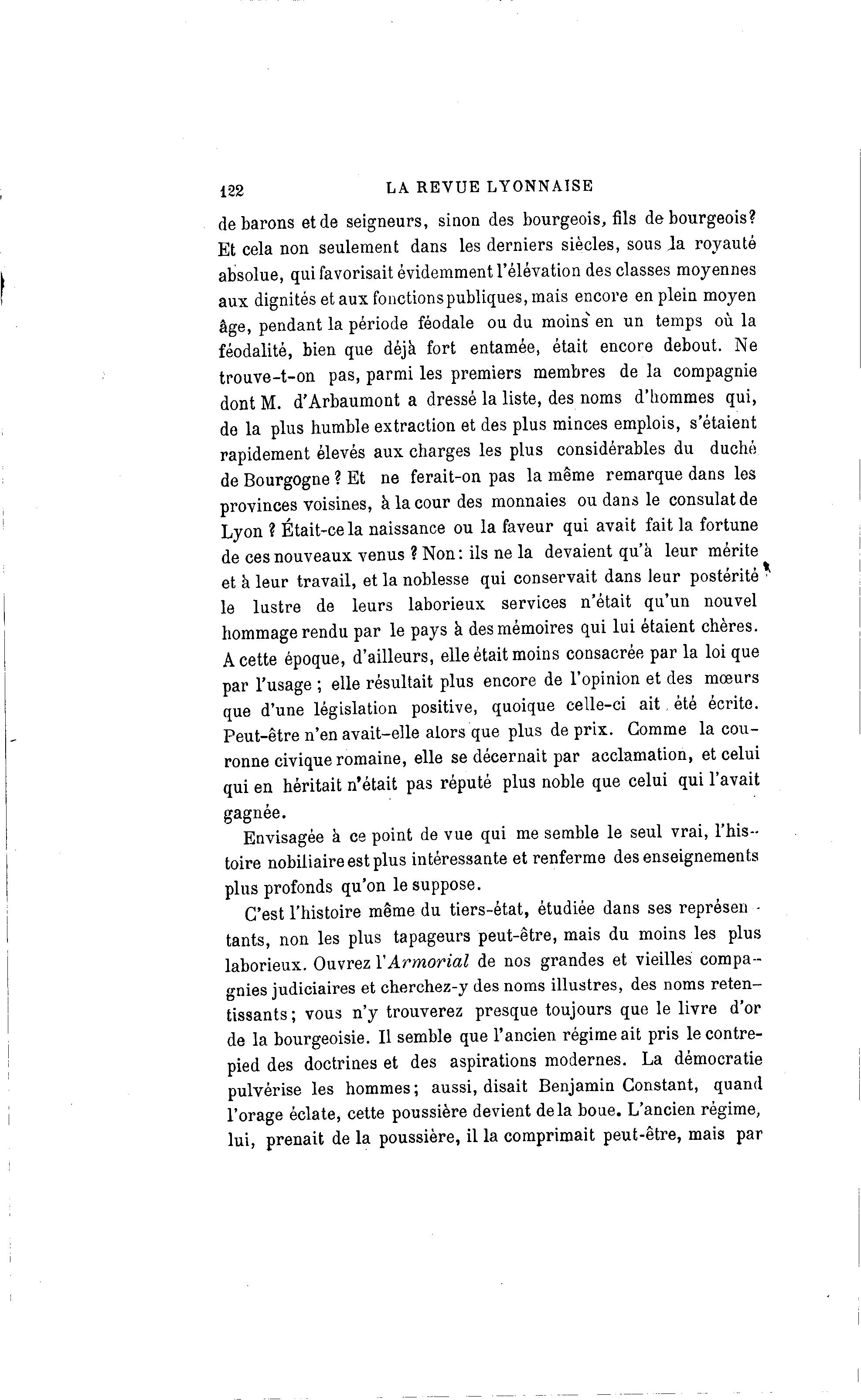 122 LA REVUE LYONNAISE de barons et de seigneurs, sinon des bourgeois, fils de bourgeois? Et cela non seulement dans les derniers siècles, sous Ja royauté absolue, qui favorisait évidemment l'élévation des classes moyennes aux dignités et aux fonctions publiques, mais encore en plein moyen âge, pendant la période féodale ou du moins en un temps où la féodalité, bien que déjà fort entamée, était encore debout. Ne trouve-t-on pas, parmi les premiers membres de la compagnie dont M. d'Arbaumont a dressé la liste, des noms d'hommes qui, de la plus humble extraction et des plus minces emplois, s'étaient rapidement élevés aux charges les plus considérables du duché de Bourgogne ? Et ne ferait-on pas la même remarque dans les provinces voisines, à la cour des monnaies ou dans le consulat de Lyon ? Était-ce la naissance ou la faveur qui avait fait la fortune de ces nouveaux venus ? Non: ils ne la devaient qu'à leur mérite et à leur travail, et la noblesse qui conservait dans leur postérité le lustre de leurs laborieux services n'était qu'un nouvel hommage rendu par le pays à des mémoires qui lui étaient chères. A cette époque, d'ailleurs, elle était moins consacrée par la loi que par l'usage ; elle résultait plus encore de l'opinion et des mœurs que d'une législation positive, quoique celle-ci ait, été écrite. Peut-être n'en avait-elle alors que plus de prix. Gomme la cou- ronne civique romaine, elle se décernait par acclamation, et celui qui en héritait n'était pas réputé plus noble que celui qui l'avait gagnée. Envisagée à ce point de vue qui me semble le seul vrai, l'his- toire nobiliaire est plus intéressante et renferme des enseignements plus profonds qu'on le suppose. C'est l'histoire même du tiers-état, étudiée dans ses représen - tants, non les plus tapageurs peut-être, mais du moins les plus laborieux. Ouvrez Y Armoriai de nos grandes et vieilles compa- gnies judiciaires et cherchez-y des noms illustres, des noms reten- tissants ; vous n'y trouverez presque toujours que le livre d'or de la bourgeoisie. Il semble que l'ancien régime ait pris le contre- pied des doctrines et des aspirations modernes. La démocratie pulvérise les hommes ; aussi, disait Benjamin Constant, quand l'orage éclate, cette poussière devient delà boue. L'ancien régime, lui, prenait de la poussière, il la comprimait peut-être, mais par