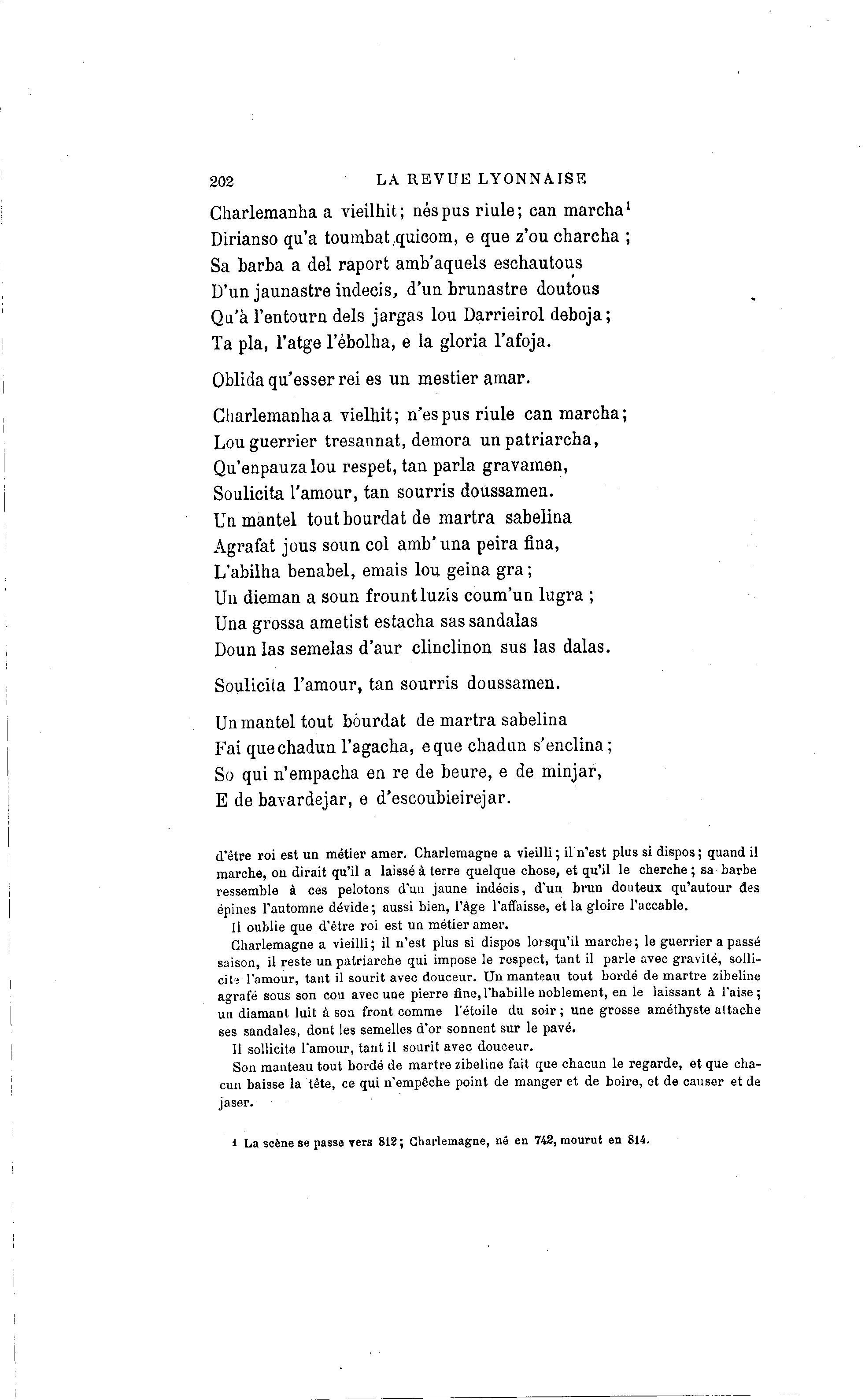 202 LA REVUE LYONNAISE Charlemanha a vieilhit; nés pus riule; can marcha1 Dirianso qu'a toumbat quicom, e que z'ou charcha ; Sa barba a del raport amb'aquels eschautous D'un jaunastre indécis, d'un brunastre doutous Qu'à l'entoura dels jargas lou Darrieirol deboja; Ta pla, l'atge l'ébolha, e la gloria l'afoja. Oblidaqu'esserrei es un mestier amar. Charlemanha a vielhit; n'es pus riule can marcha; Lou guerrier tresannat, demora unpatriarcha, Qu'enpauzalou respet, tan parla gravamen, Soulicita l'amour, tan sourris doussamen. Uu mantel tout bourdat de martra sabeliaa Agrafât jous soun col amb'una peira flna, L'abilha benabel, emais lou geina gra ; Un dieman a soun frountluzis coum'un lugra ; Una grossa ametist estacha sas sandalas Doun las semelas d'aur clinclinon sus las dalas. Soulicita l'amour, tan sourris doussamen. Un mantel tout bourdat de martra sabelina Fai quechadun l'agacha, eque chadun s'enclina ; So qui n'empacha en re de heure, e de minjar, E de bavardejar, e d'escoubieirejar. d'être roi est un métier amer. Charlemagne a vieilli ; il n'est plus si dispos ; quand il marche, on dirait qu'il a laissé à terre quelque chose, et qu'il le cherche ; sa barbe ressemble à ces pelotons d'un jaune indécis, d'un brun douteux qu'autour des épines l'automne dévide ; aussi bien, l'âge l'affaisse, et la gloire l'accable. Il oublie que d'être roi est un métier amer, Charlemagne a vieilli ; il n'est plus si dispos lorsqu'il marche ; le guerrier a passé saison, il reste un patriarche qui impose le respect, tant il parle avec gravité, solli- cita l'amour, tant il sourit avec douceur. Un manteau tout bordé de martre zibeline agrafé sous son cou avec une pierre fine, l'habille noblement, en le laissant à l'aise ; un diamant luit à son front comme l'étoile du soir ; une grosse améthyste attache ses sandales, dont les semelles d'or sonnent sur le pavé. Il sollicite l'amour, tant il sourit avec douceur. Son manteau tout bordé de martre zibeline fait que chacun le regarde, et que cha- cun baisse la tête, ce qui n'empêche point de manger et de boire, et de causer et de jaser. i La scène se passa vers 812; Charlemagne, né en 742, mourut en 814.