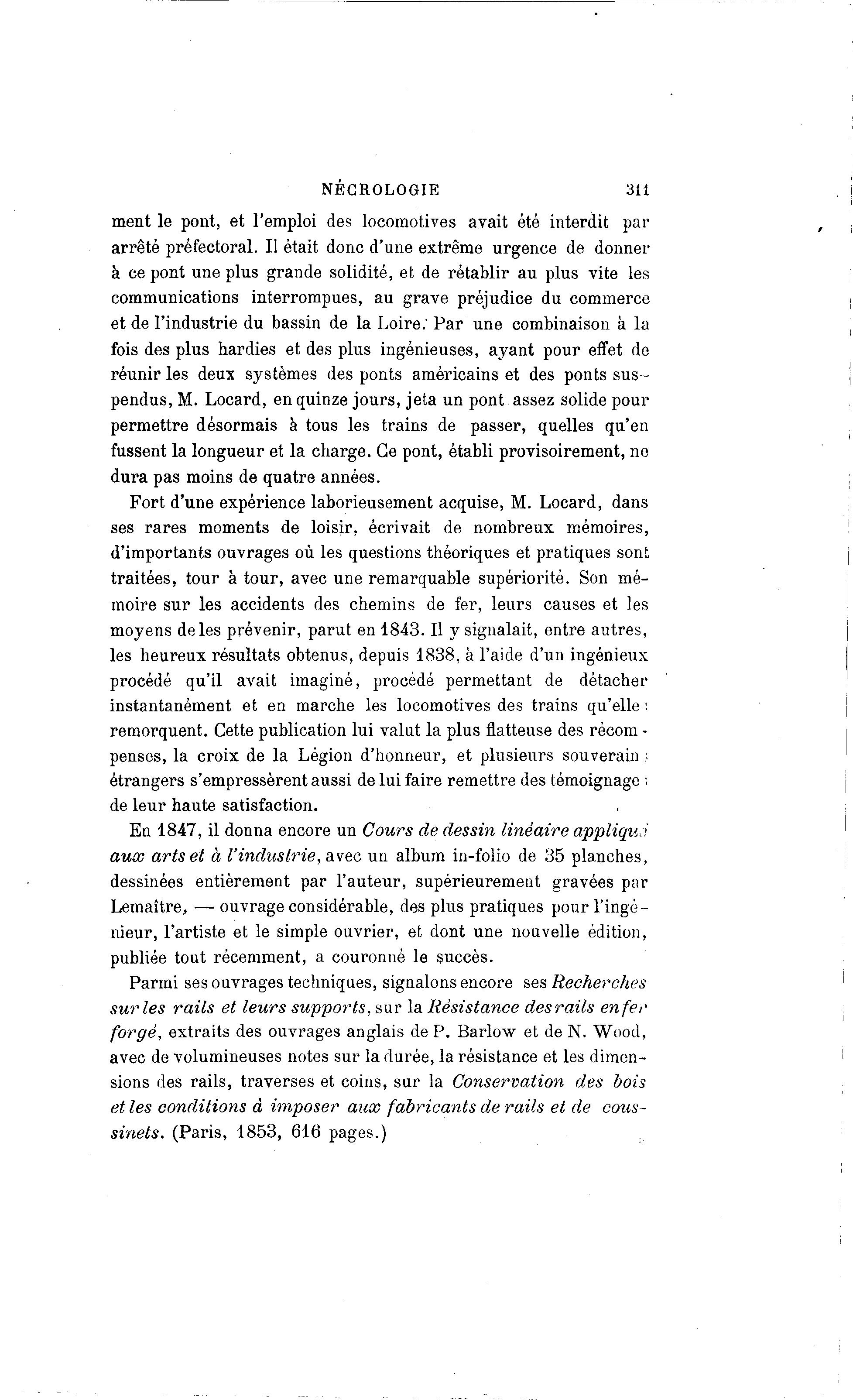 NECROLOGIE 311 ment le pont, et l'emploi des locomotives avait été interdit par arrêté préfectoral. Il était donc d'une extrême urgence de donner à ce pont une plus grande solidité, et de rétablir au plus vite les communications interrompues, au grave préjudice du commerce et de l'industrie du bassin de la Loire: Par une combinaison à la fois des plus hardies et des plus ingénieuses, ayant pour effet de réunir les deux systèmes des ponts américains et des ponts s u s - pendus, M. Locard, en quinze jours, jeta un pont assez solide pour permettre désormais à tous les trains de passer, quelles qu'en fussent la longueur et la charge. Ce pont, établi provisoirement, ne dura pas moins de quatre années. Fort d'une expérience laborieusement acquise, M. Locard, dans ses rares moments de loisir, écrivait de nombreux mémoires, d'importants ouvrages où les questions théoriques et pratiques sont traitées, tour à tour, avec une remarquable supériorité. Son mé- moire sur les accidents des chemins de fer, leurs causes et les moyens de les prévenir, parut en 1843. Il y signalait, entre autres, les heureux résultats obtenus, depuis 1838, à l'aide d'un ingénieux procédé qu'il avait imaginé, procédé permettant de détacher instantanément et en marche les locomotives des trains qu'elle ; remorquent. Cette publication lui valut la plus flatteuse des récom - penses, la croix de la Légion d'honneur, et plusieurs souverain ; étrangers s'empressèrent aussi de lui faire remettre des témoignage ; de leur haute satisfaction. En 1847, il donna encore un Cours de dessin linéaire appliqua aux arts et à l'industrie, avec un album in-folio de 35 planches, dessinées entièrement par l'auteur, supérieurement gravées par Lemaître, — ouvrage considérable, des plus pratiques pour l'ingé- nieur, l'artiste et le simple ouvrier, et dont une nouvelle édition, publiée tout récemment, a couronné le succès. Parmi ses ouvrages techniques, signalons encore ses Recherches sur les rails et leurs supports, sur la Résistance desrails enfer forgé, extraits des ouvrages anglais de P. Barlow et de N. Wood, avec de volumineuses notes sur la durée, la résistance et les dimen- sions des rails, traverses et coins, sur la Conservation des bois et les conditions à imposer aux fabricants de rails et de cous- sinets. (Paris, 1853, 616 pages.)