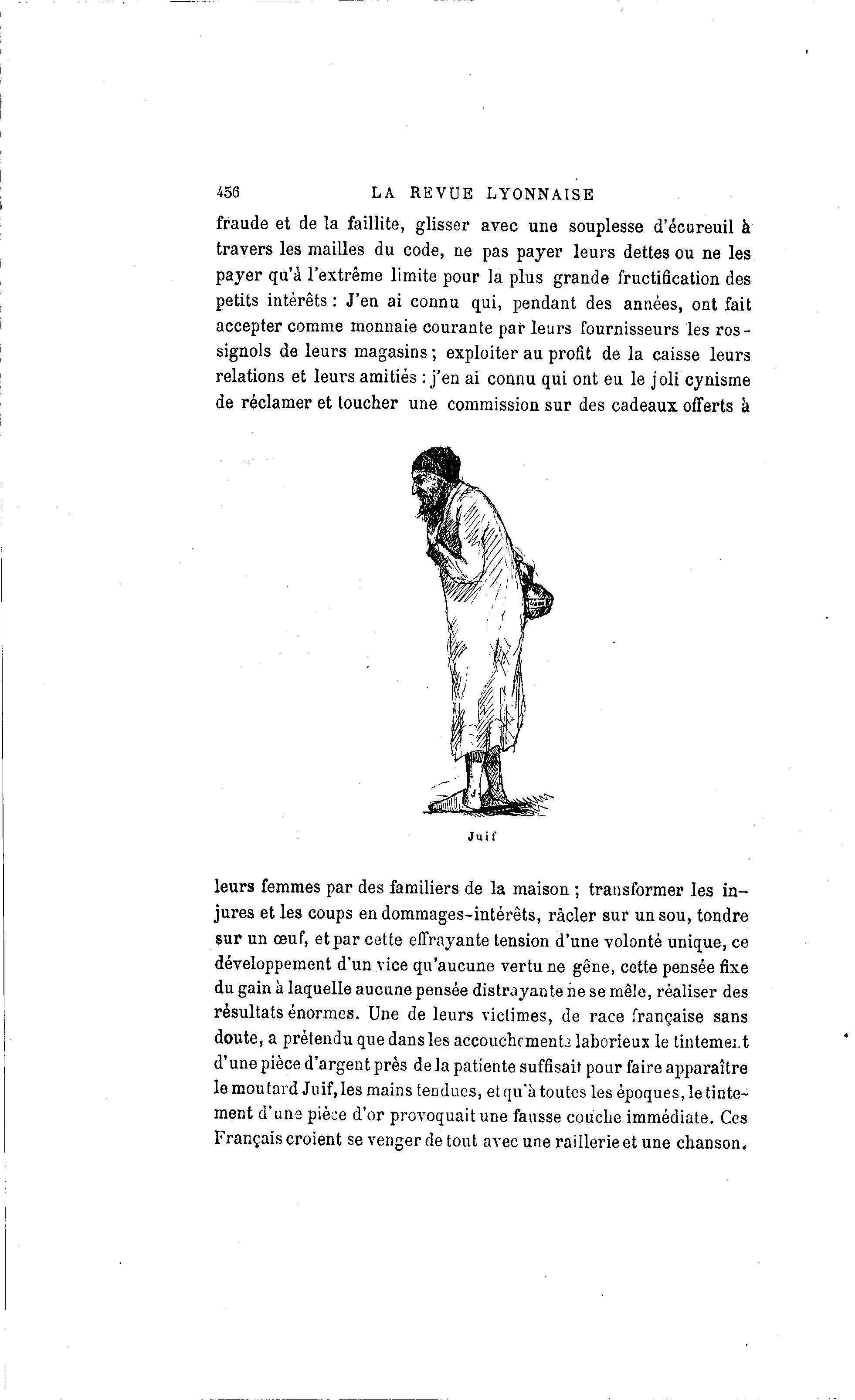 456 LA REVUE LYONNAISE fraude et de la faillite, glisser avec une souplesse d'écureuil à travers les mailles du code, ne pas payer leurs dettes ou ne les payer qu'à l'extrême limite pour la plus grande fructification des petits intérêts : J'en ai connu qui, pendant des années, ont fait accepter comme monnaie courante par leurs fournisseurs les ros- signols de leurs magasins ; exploiter au profit de la caisse leurs relations et leurs amitiés : j'en ai connu qui ont eu le joli cynisme de réclamer et toucher une commission sur des cadeaux offerts à leurs femmes par des familiers de la maison ; transformer les in- jures et les coups endommages-intérêts, racler sur un sou, tondre sur un œuf, et par cette effrayante tension d'une volonté unique, ce développement d'un vice qu'aucune vertu ne gêne, cette pensée fixe du gain à laquelle aucune pensée distrayante ne se mêle, réaliser des résultats énormes. Une de leurs victimes, de race française sans doute, a prétendu que dans les accouchements laborieux le tintement d'une pièce d'argent près de la patiente suffisait pour faire apparaître le moutard Juif, les mains tendues, et qu'à toutes les époques, le tinte- ment d'una pièce d'or provoquait une fausse couche immédiate. Ces Français croient se venger de tout avec une raillerie et une chanson.