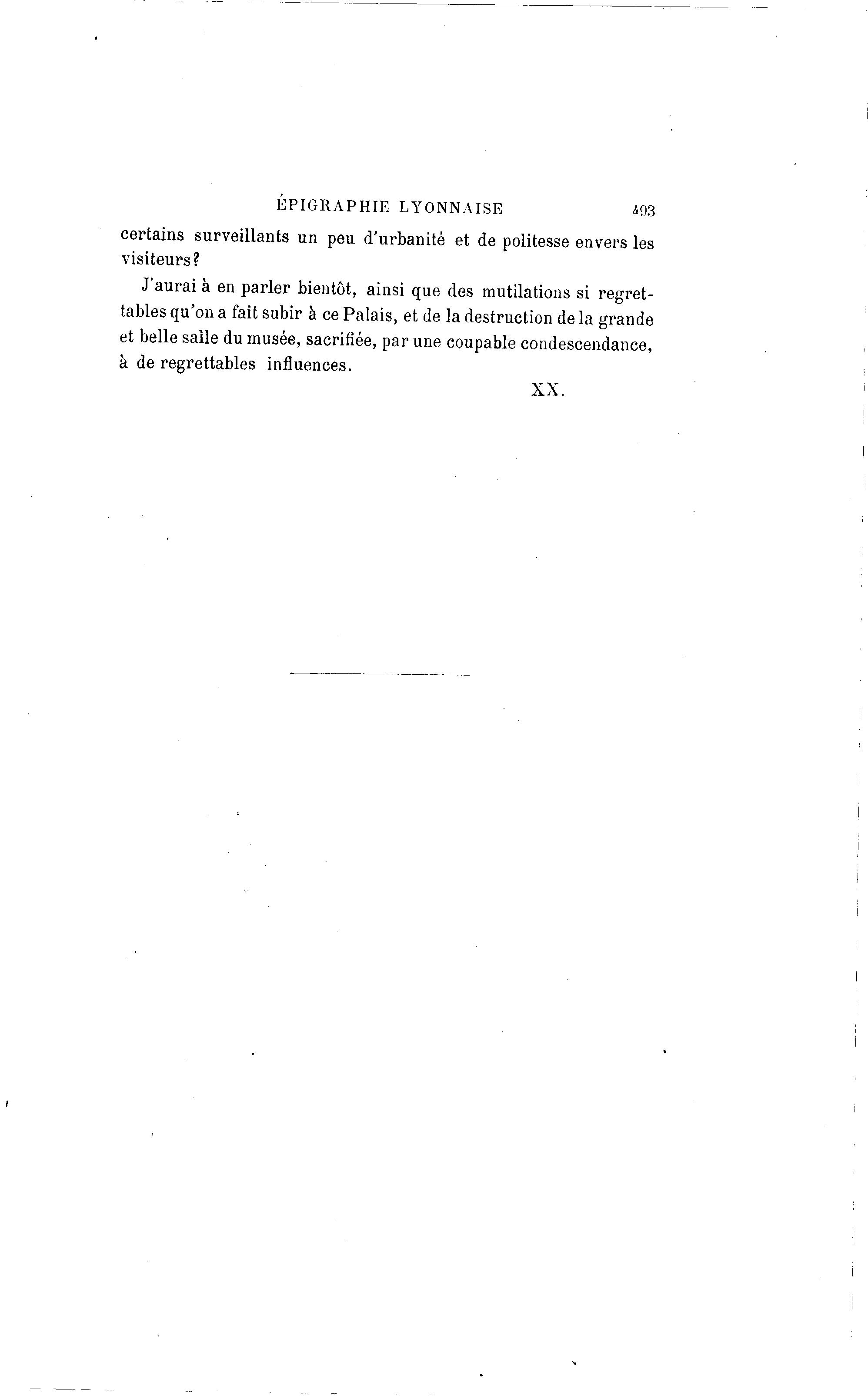 E P I G R A P H I E LYONNAISE ^93 certains surveillants un peu d'urbanité et de politesse envers les visiteurs? J'aurai à en parler bientôt, ainsi que des mutilations si regret- tables qu'on a fait subir à ce Palais, et de la destruction de la grande et belle saile du musée, sacrifiée, par une coupable condescendance, à de regrettables influences.